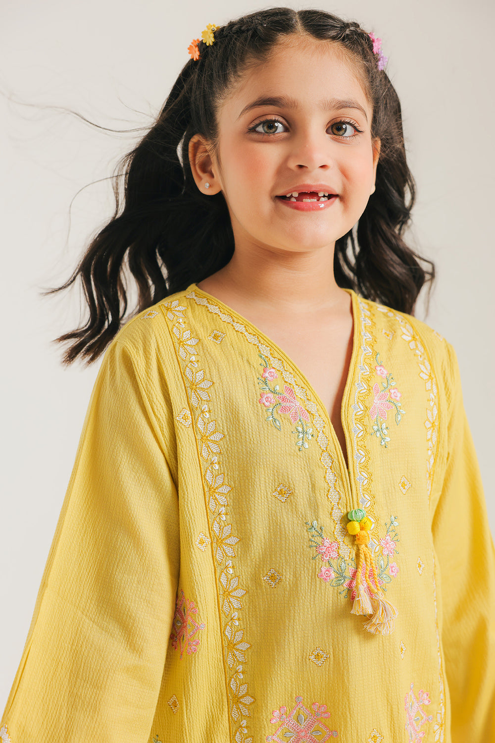 Dressed in a sunny hue, this exquisite embroidered suit is perfect for your little one. The beautiful yellow ensemble features intricate floral embroidery in soft pinks and whites along the neckline, sleeves, and hem. The delicate detailing and matching shalwar create a graceful and festive look.