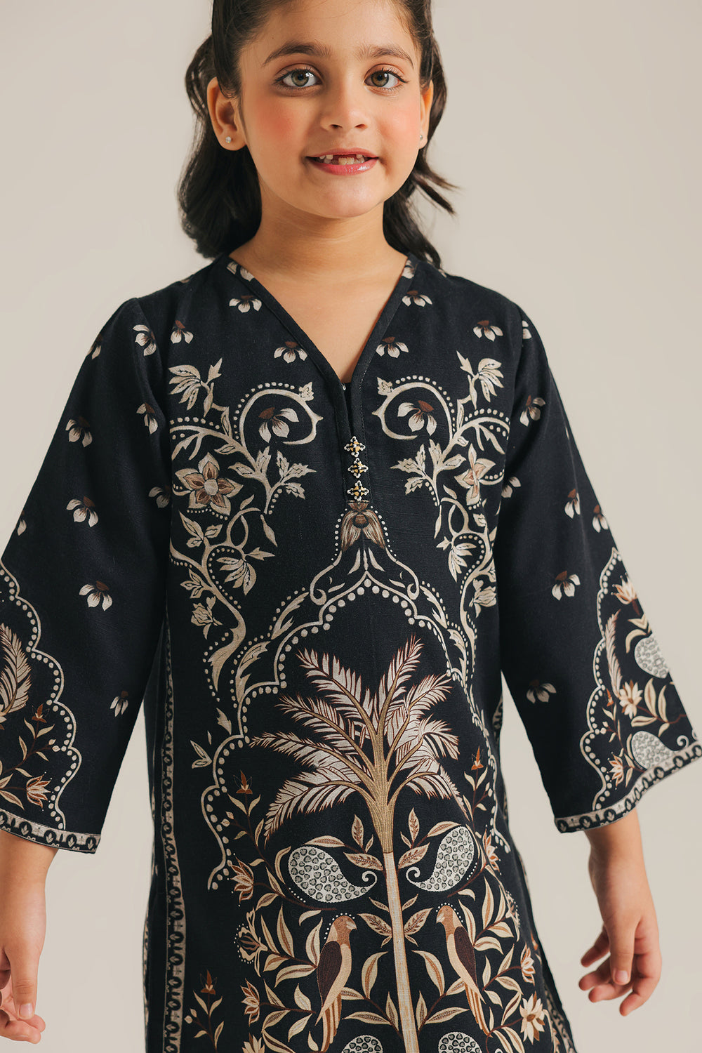 Discover a world of artistic elegance with this charming printed suit. The deep black kurta is a canvas for a beautiful print, featuring an enchanting tree of life motif with delicate birds and other intricate patterns. It is perfectly matched with a coordinating shalwar that has a complementary print, making this suit a sophisticated and truly captivating choice.