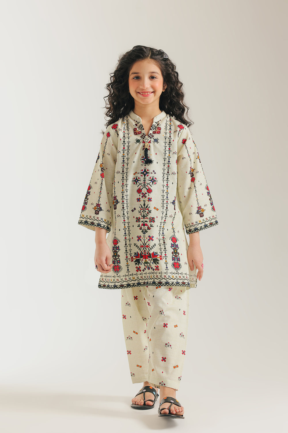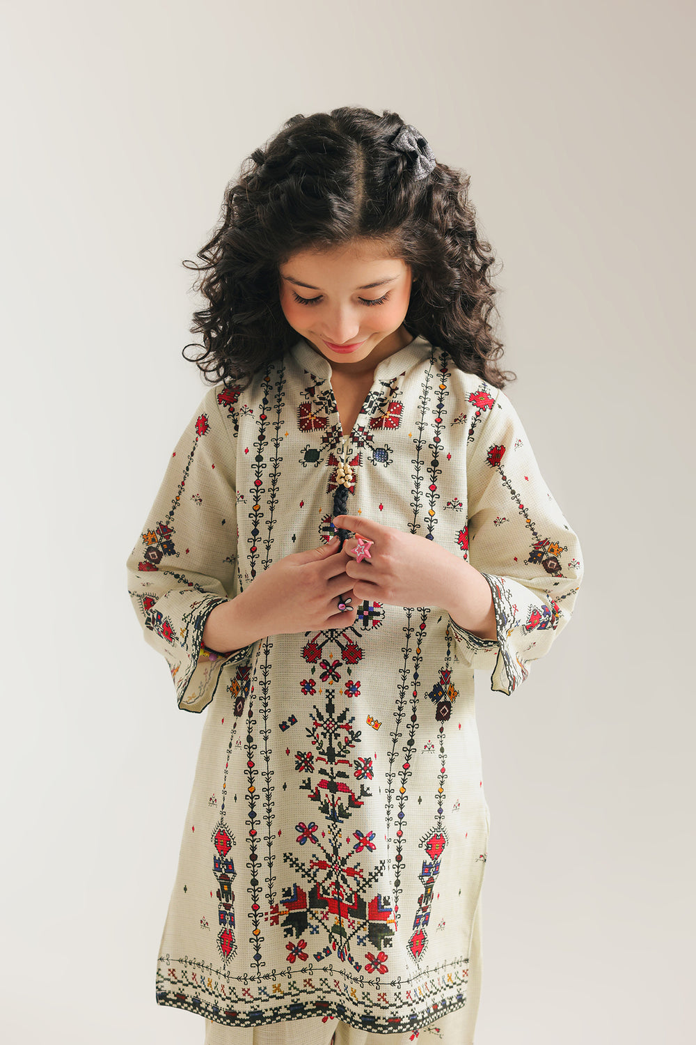 Dress her in this elegant off-white printed suit. This beautiful two-piece set features a kurti with an intricate, multi-colored geometric and floral pattern, creating a sophisticated and artistic look. The suit is completed with matching shalwar that have a scattered print, making this a perfect ensemble for a festive occasion or a stylish day out.