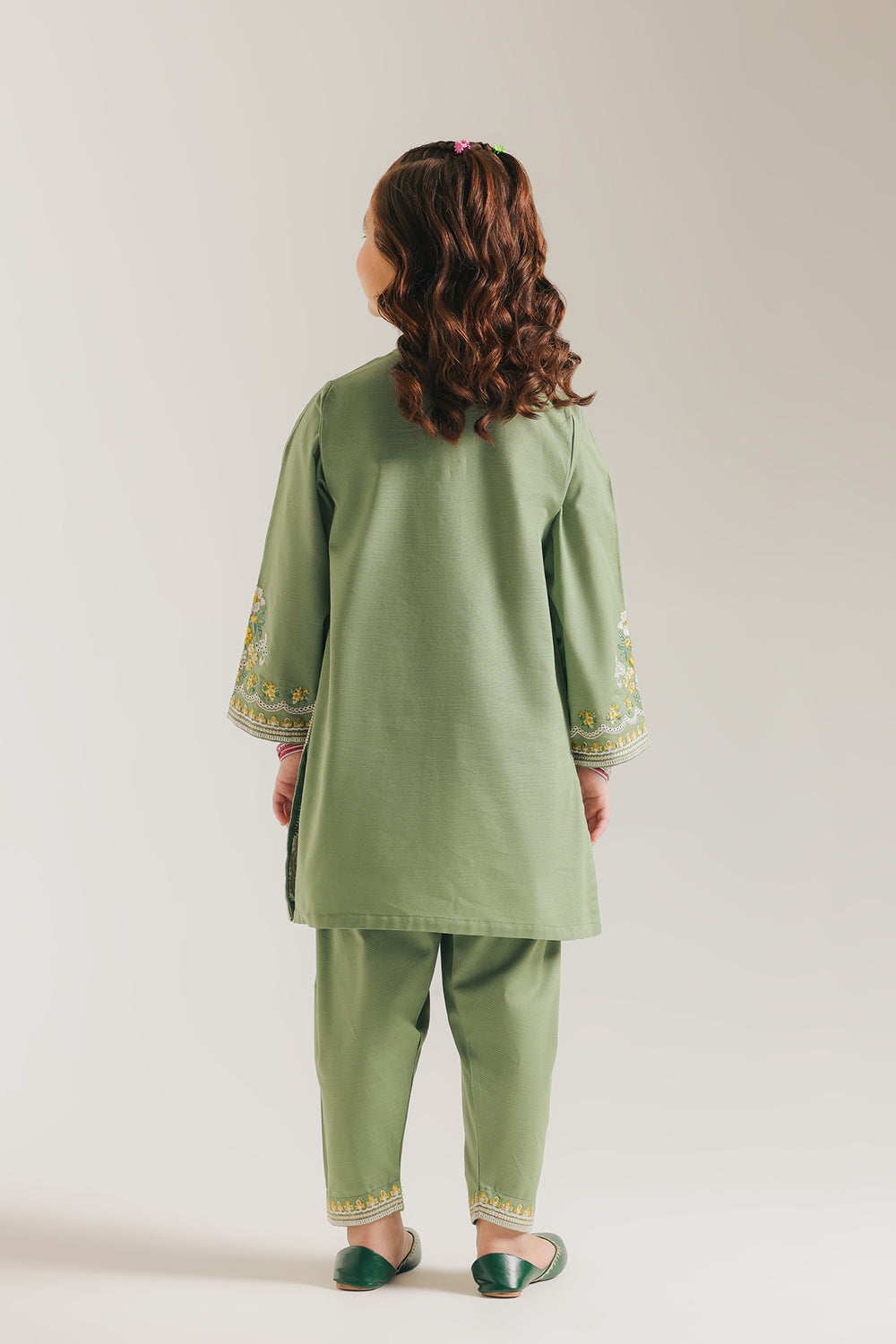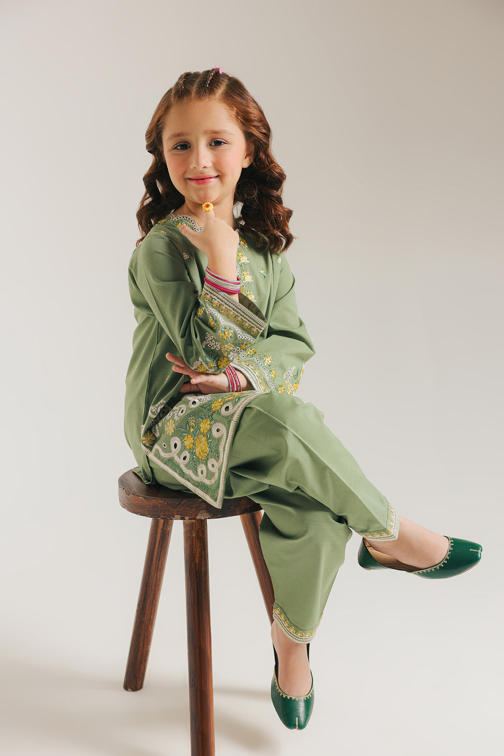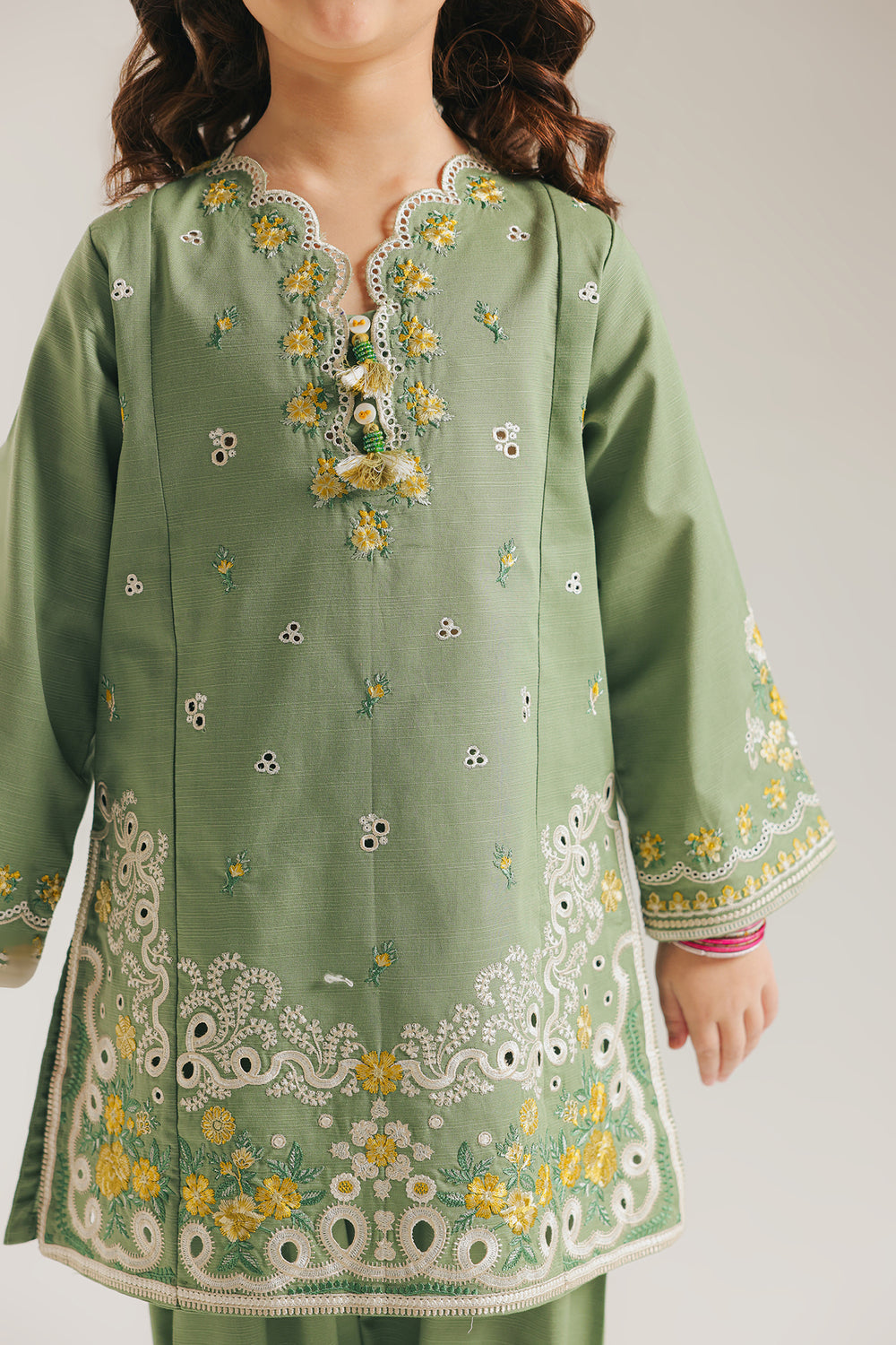 A beautifully embroidered Light green color suit with a subtle textured pattern with delicate floral embroidery in white, yellow, and green spread across the front, sleeves, and neckline. A scalloped embroidered neckline with detailed floral motifs running down the placket. Long sleeves with matching floral embroidery near the cuffs. An ornate embroidered border along the hem, combining floral and lace-style patterns. It's a charming, festive, and elegant traditional kids’ outfit with bright, cheerful detailing.
