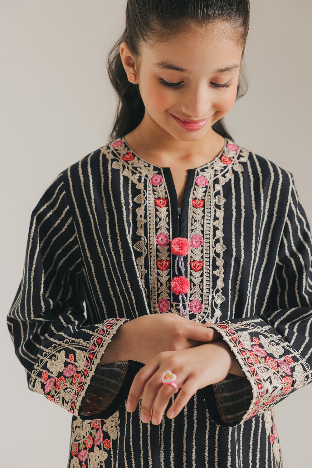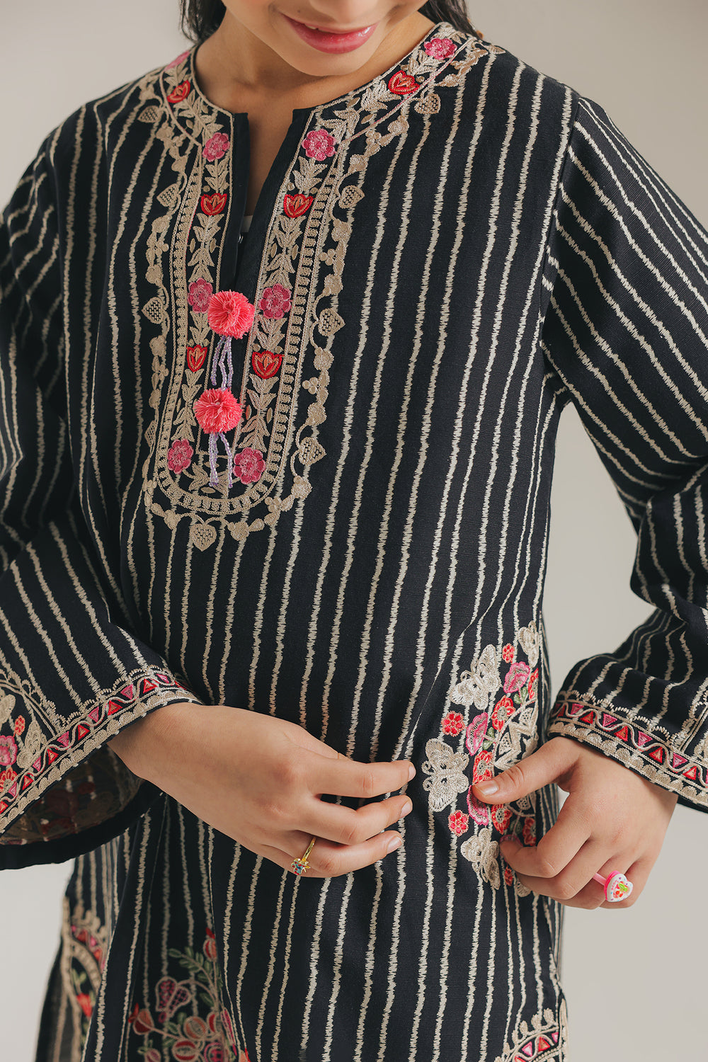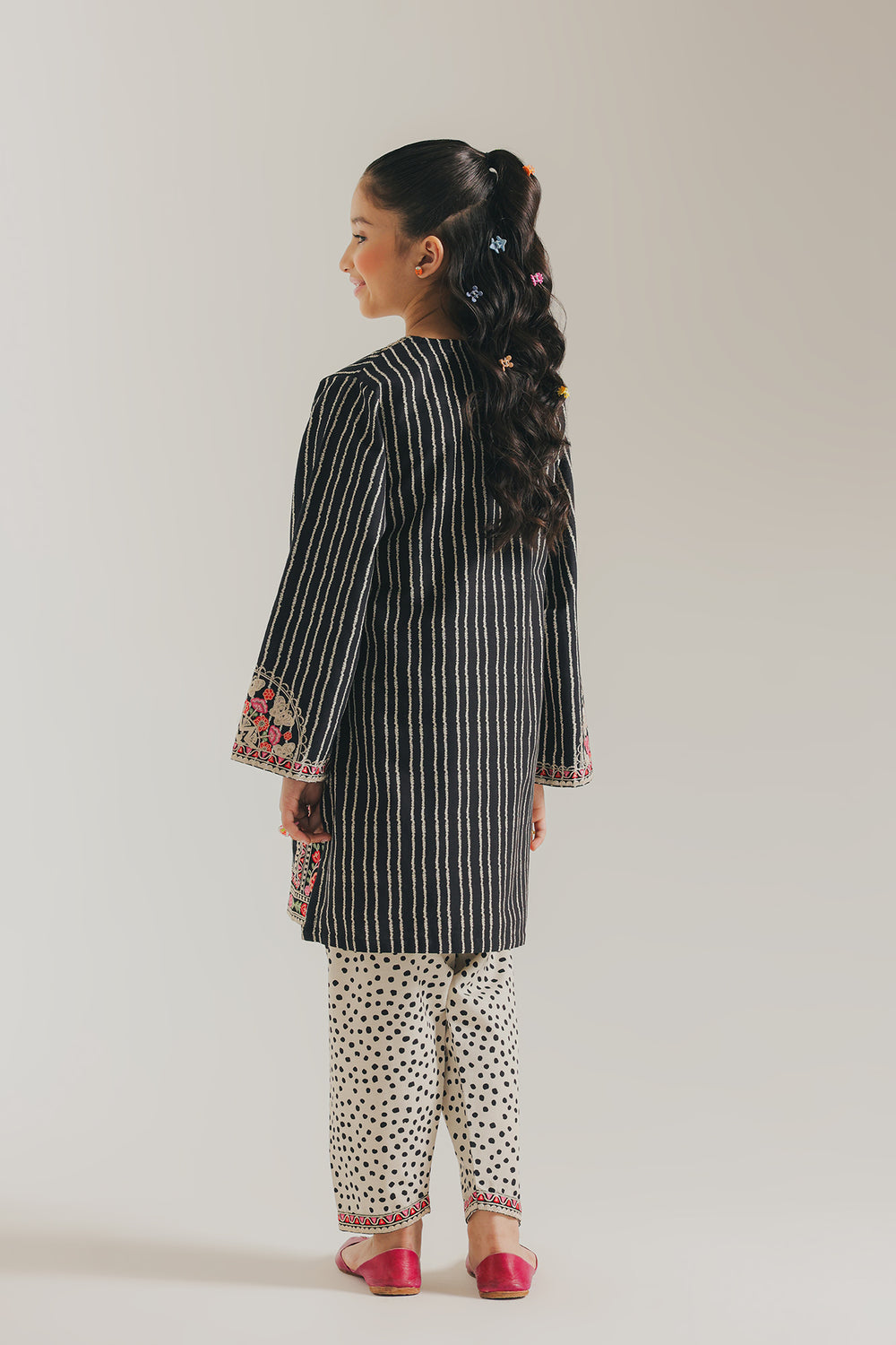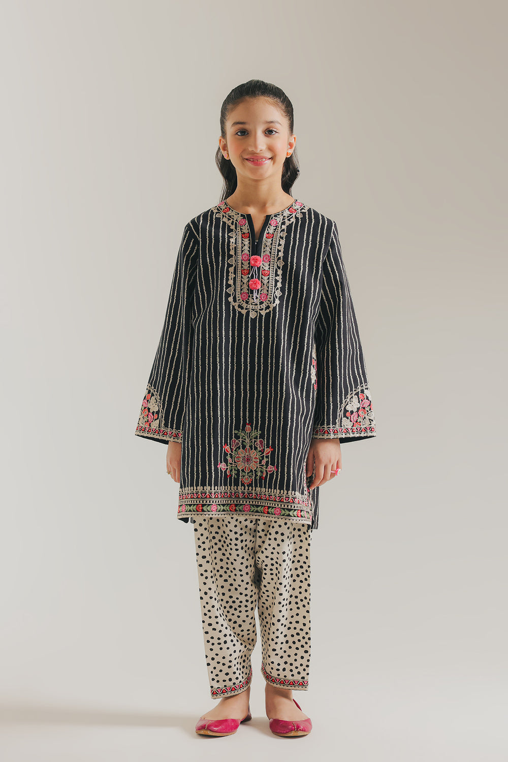 The outfit features a charming black kurta adorned with vertical white stripes and floral embroidery in pink and green around the neckline, hem, and cuffs. It is paired with white trousers featuring a playful black polka-dot pattern, creating a fun contrast. The neckline has pink fabric buttons that add a cute, coordinated touch.