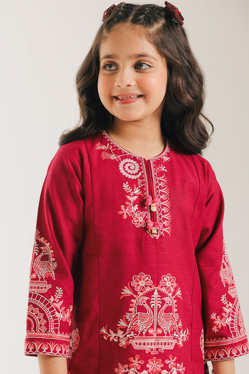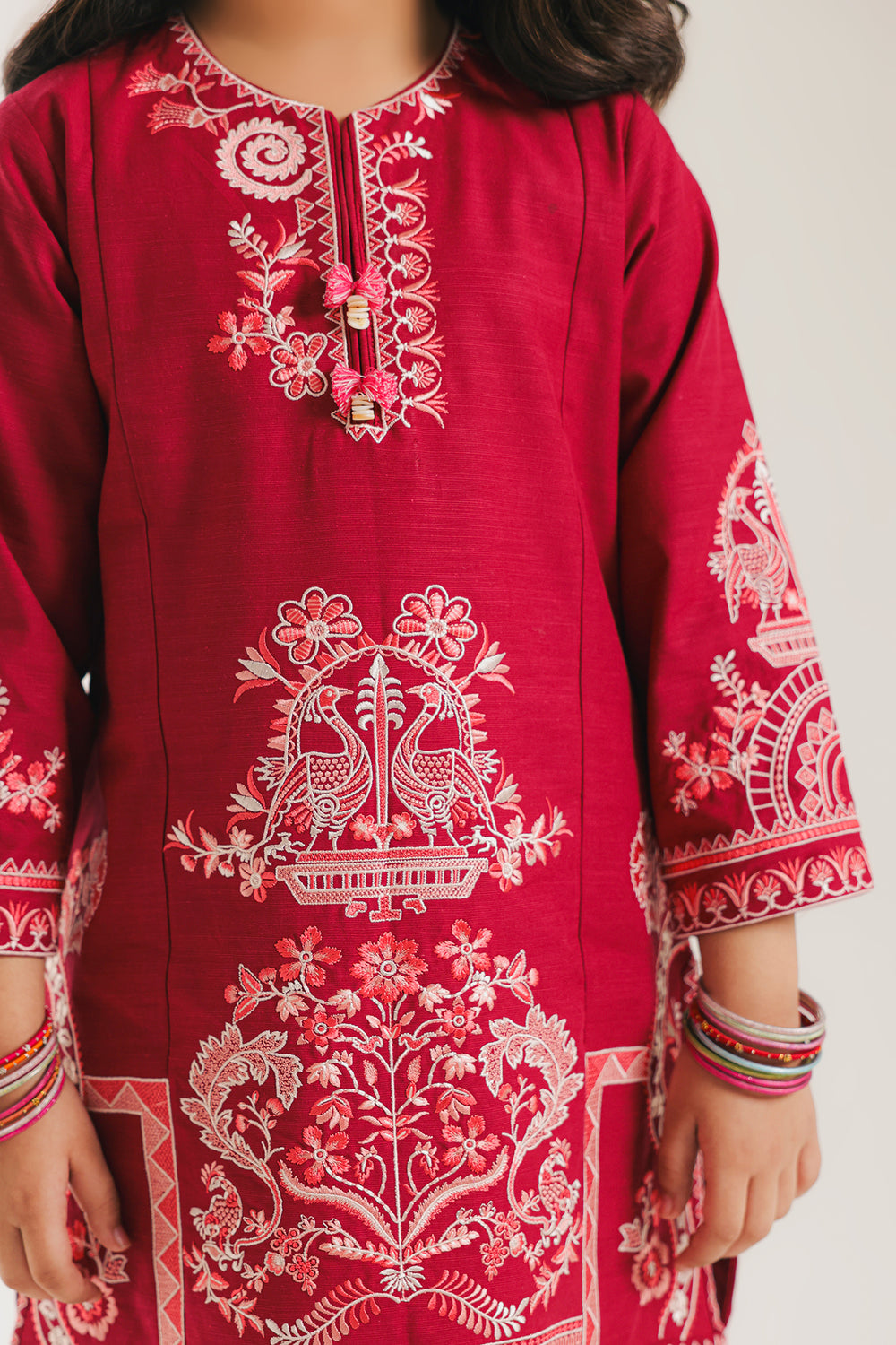 Introduce vibrant tradition to their closet with this gorgeous magenta embroidered suit. The ensemble features a short, straight-cut kurti in a striking crimson/magenta hue. It is richly adorned with intricate embroidery across the neckline, front, and sleeves, showcasing beautiful traditional motifs, including stylized peacocks or birds. The neckline is finished with decorative trim and tassels. The suit is completed with comfortable shalwar in the same deep magenta, featuring coordinating embroidery along the hem. This outfit is perfect for festive wear, offering a blend of comfort and eye-catching detail.