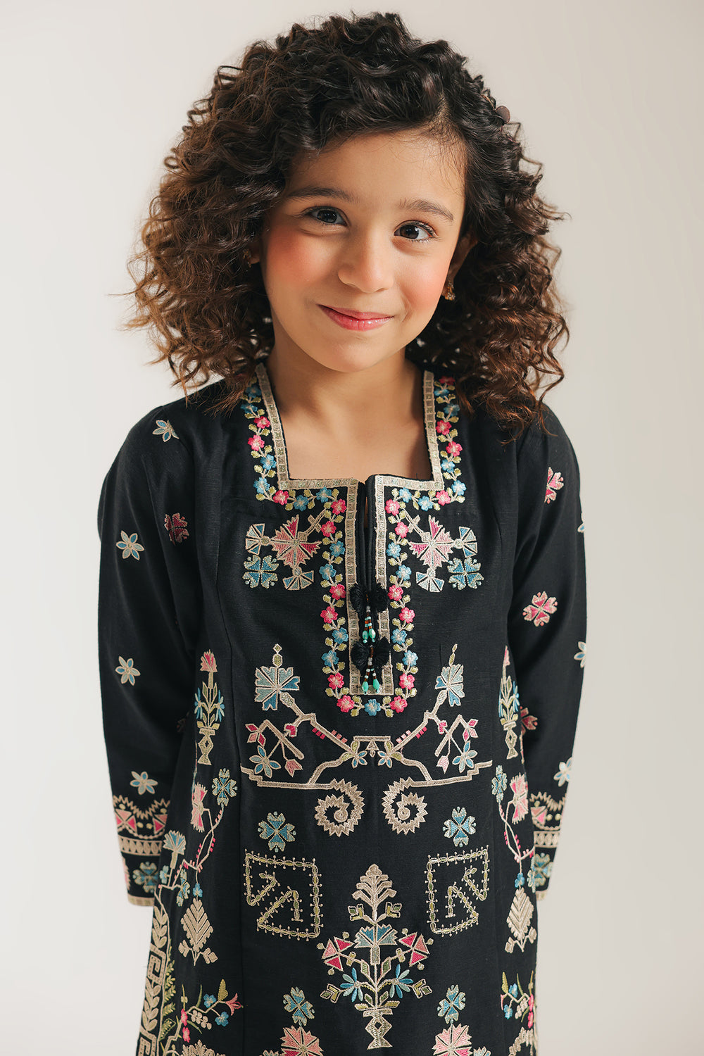 Introducing our exquisitely crafted embroidered suit, designed for timeless style. This charming two-piece set features a black khaddar shirt adorned with intricate floral and geometric embroidery in a vibrant palette of pink, green, blue, and off-white. The coordinating black shalwar complete the look, creating a cohesive and elegant ensemble that's perfect for any festive occasion.
