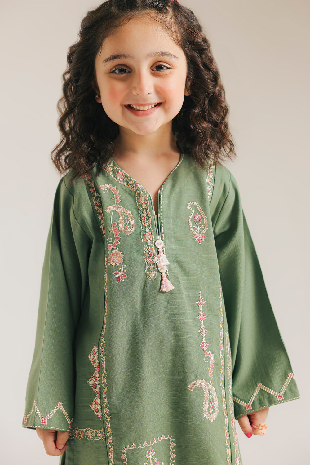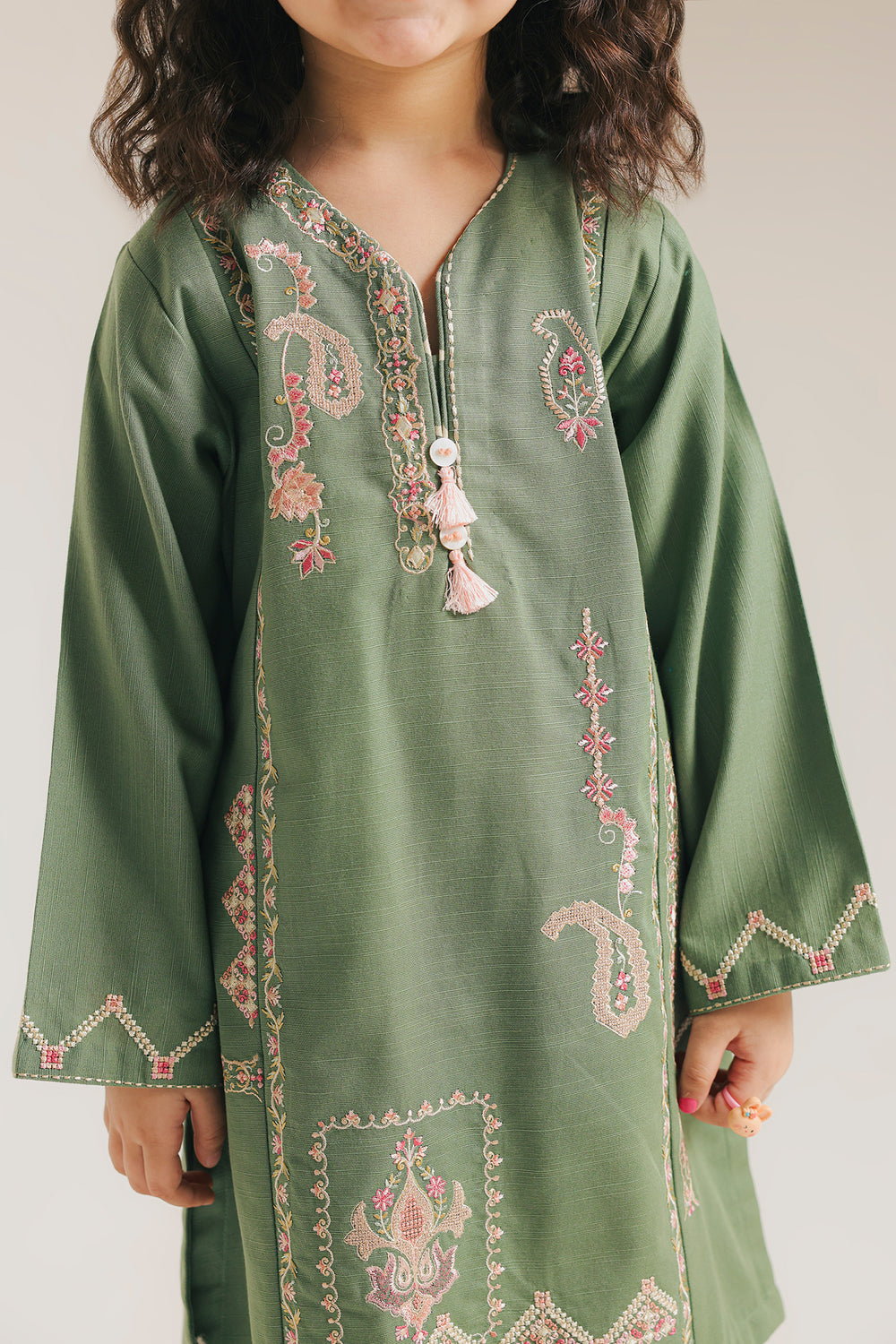 Dull green embroidered suit designed for kids featuring a classic V-neck cut. The set includes a beautifully embroidered kurta paired with a printed shalwar for a complete traditional look. Perfect for special occasions, festivals, or everyday wear, this outfit combines comfort with elegant design. The soft fabric and intricate embroidery details make it a standout choice for your child's wardrobe.
