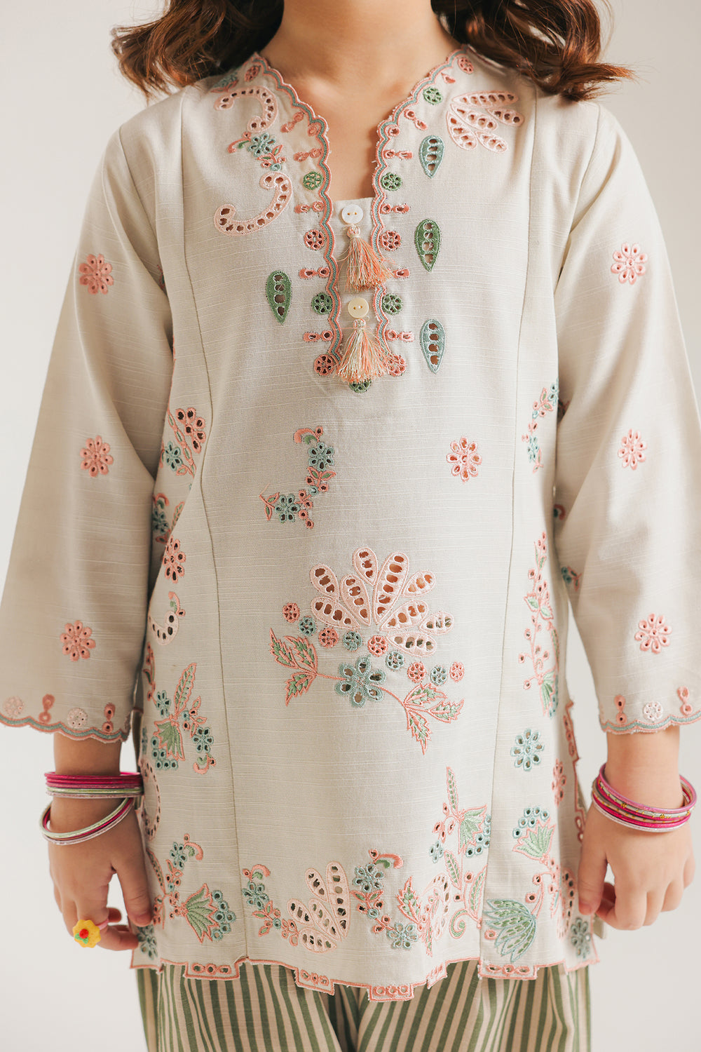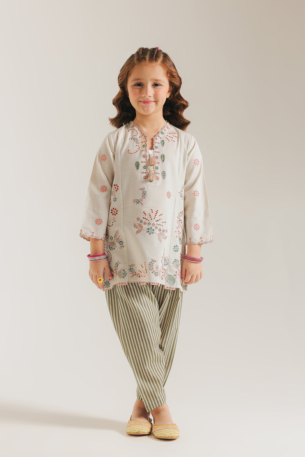 Elegant vanilla ice suit designed for kids, featuring intricate embroidery work paired with a flattering V-neckline. The ensemble features a sophisticated printed diagonal line pattern across the shalwar, adding visual interest and a contemporary appeal. Crafted with attention to detail, this piece combines traditional embroidered elements with modern design sensibilities, making it ideal for special occasions, celebrations, or everyday wear. The thoughtful color palette and refined embellishments ensure your child looks polished and stylish while maintaining comfort and ease of movement.
