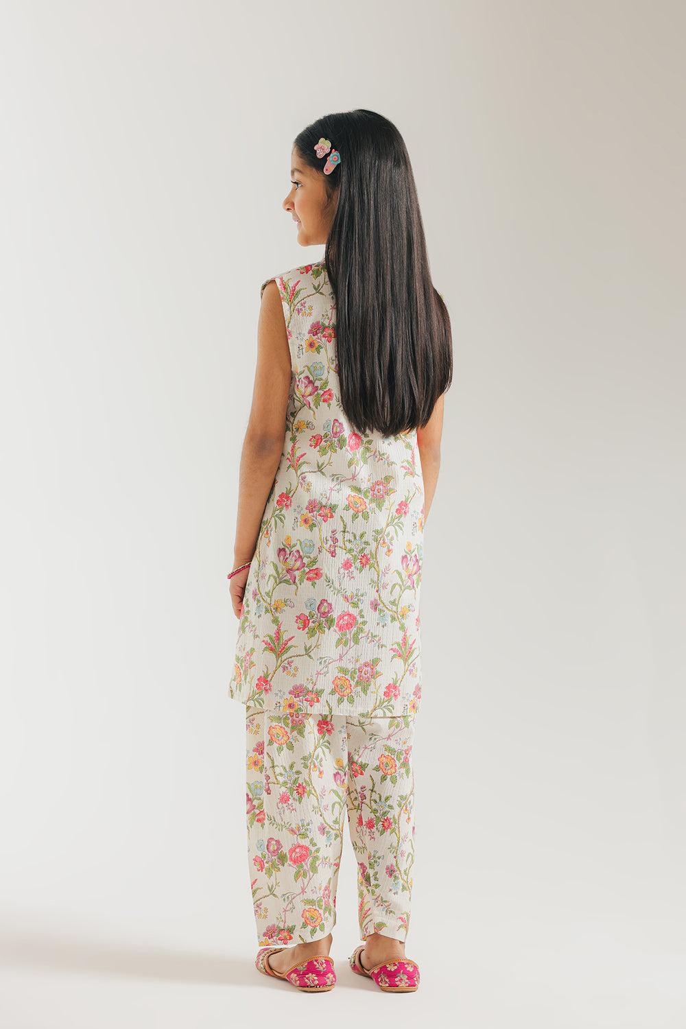 This charming ivory printed suit for girls is a delightful celebration of spring, artfully combining a fresh botanical print with traditional artisanal details. The sleeveless, mid-length tunic features a serene cream canvas adorned with a whimsical all-over floral pattern in vibrant shades of coral, violet, and leaf green. Designed with a relaxed, breezy silhouette, the ensemble pairs perfectly with matching floral shalwar that offer a coordinated, head-to-toe look. Crafted from lightweight, breathable fabric, this outfit is an ideal choice for sunny daytime festivities or family gatherings, ensuring she stays both comfortable and effortlessly stylish.