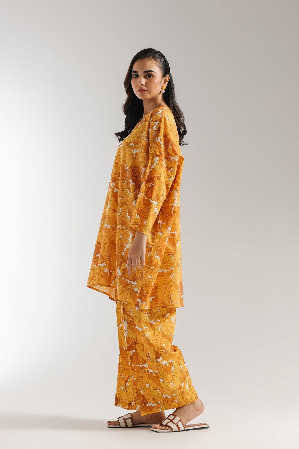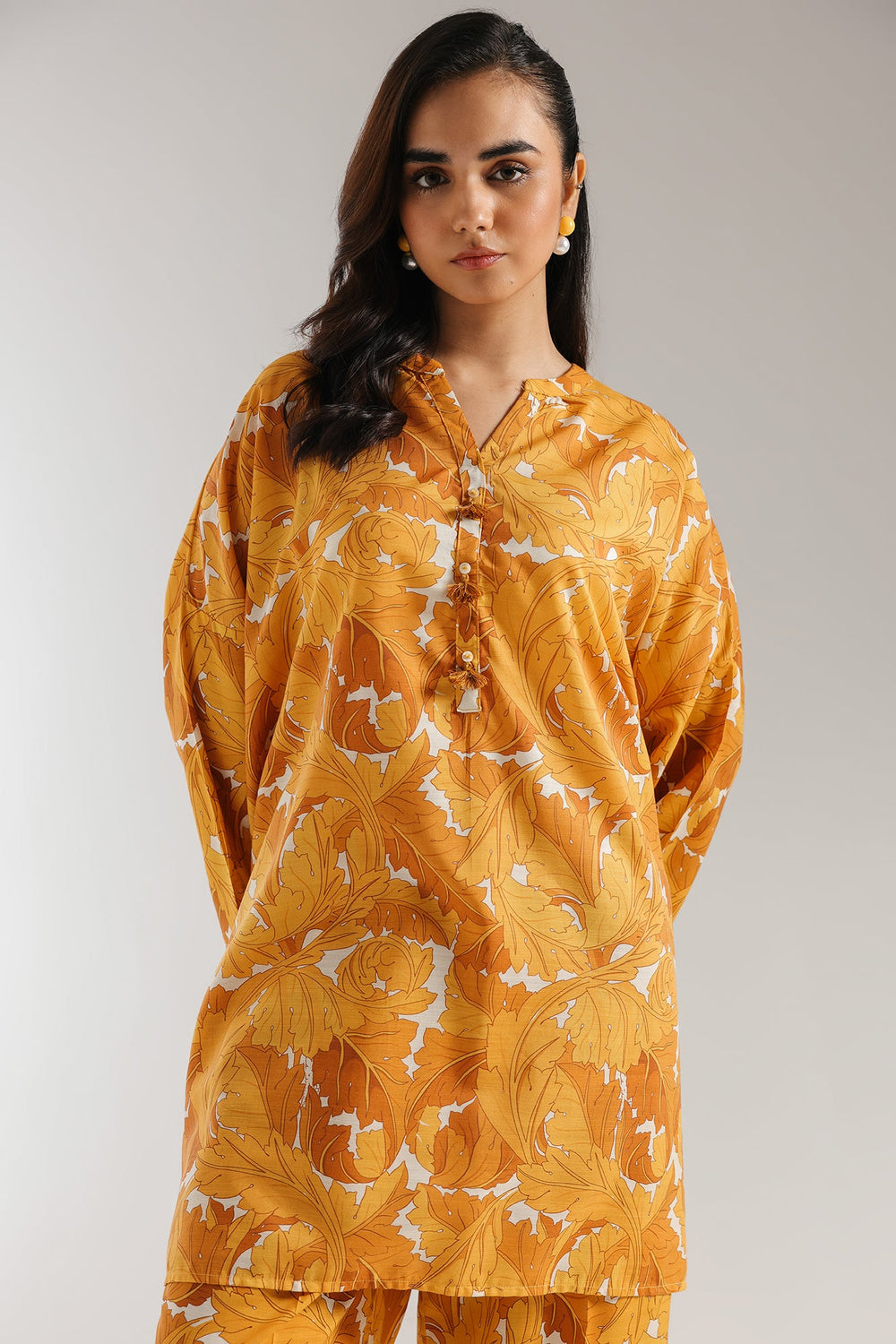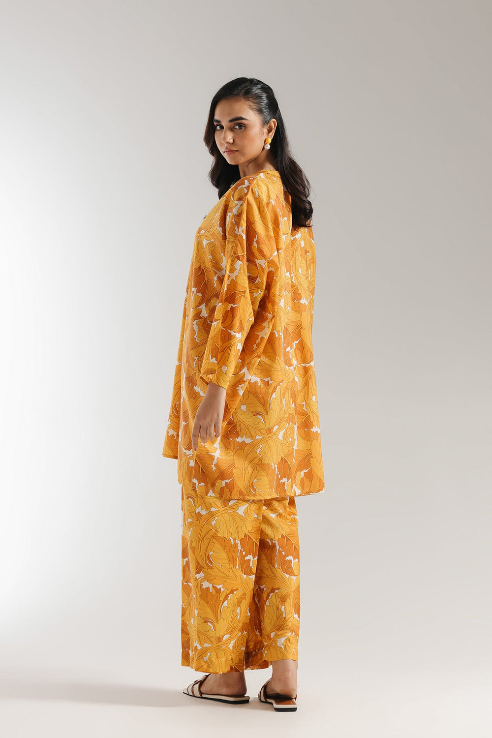 An enchanting composition is layered over this graceful ensemble portraying a mesmerizing mustard shade. It depicts a contemporary silhouette shirt adorned with captivating tropical prints in vibrant hues. Paired with a matching trouser, this aesthetically rich outfit is a great option for fun gatherings this season.
