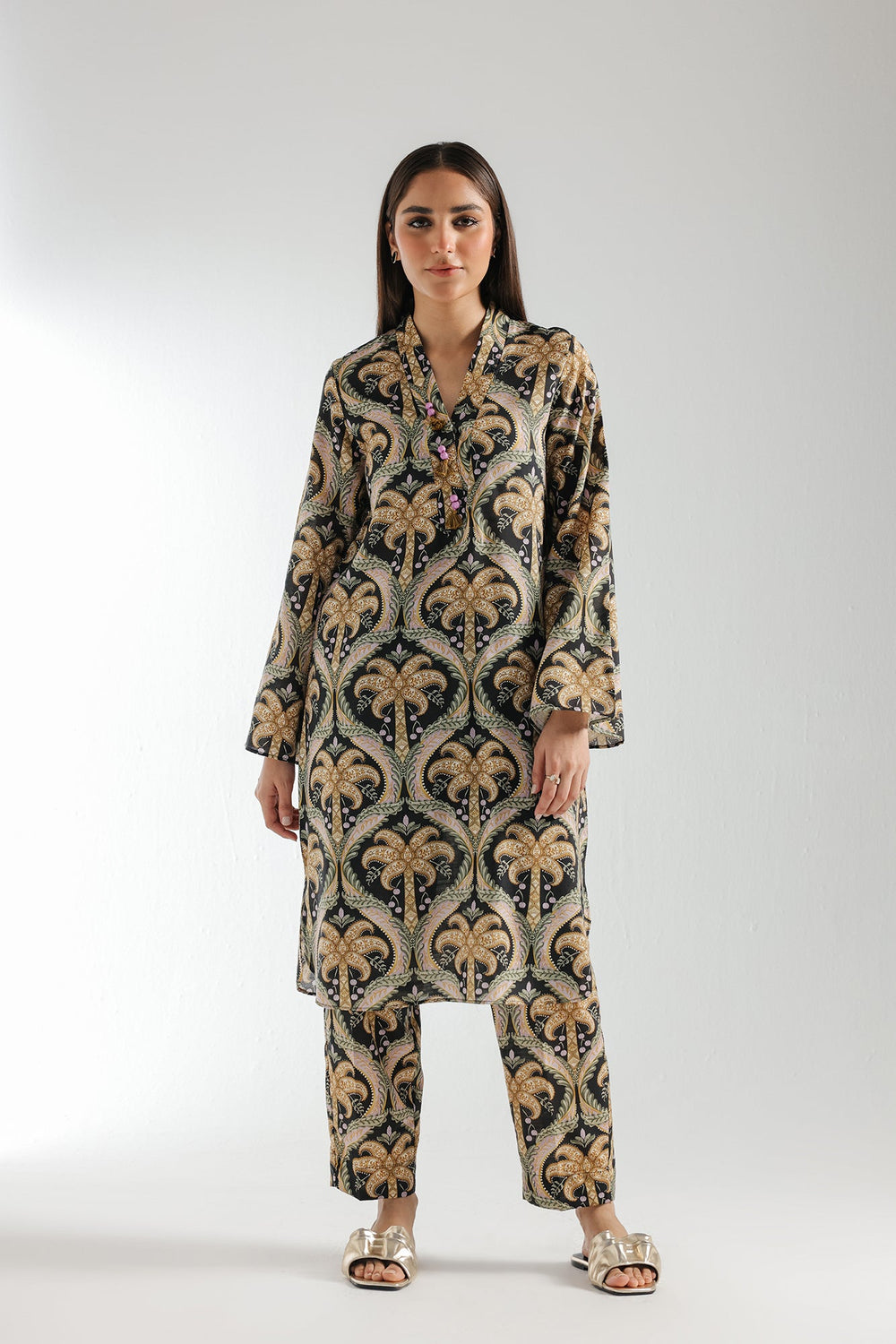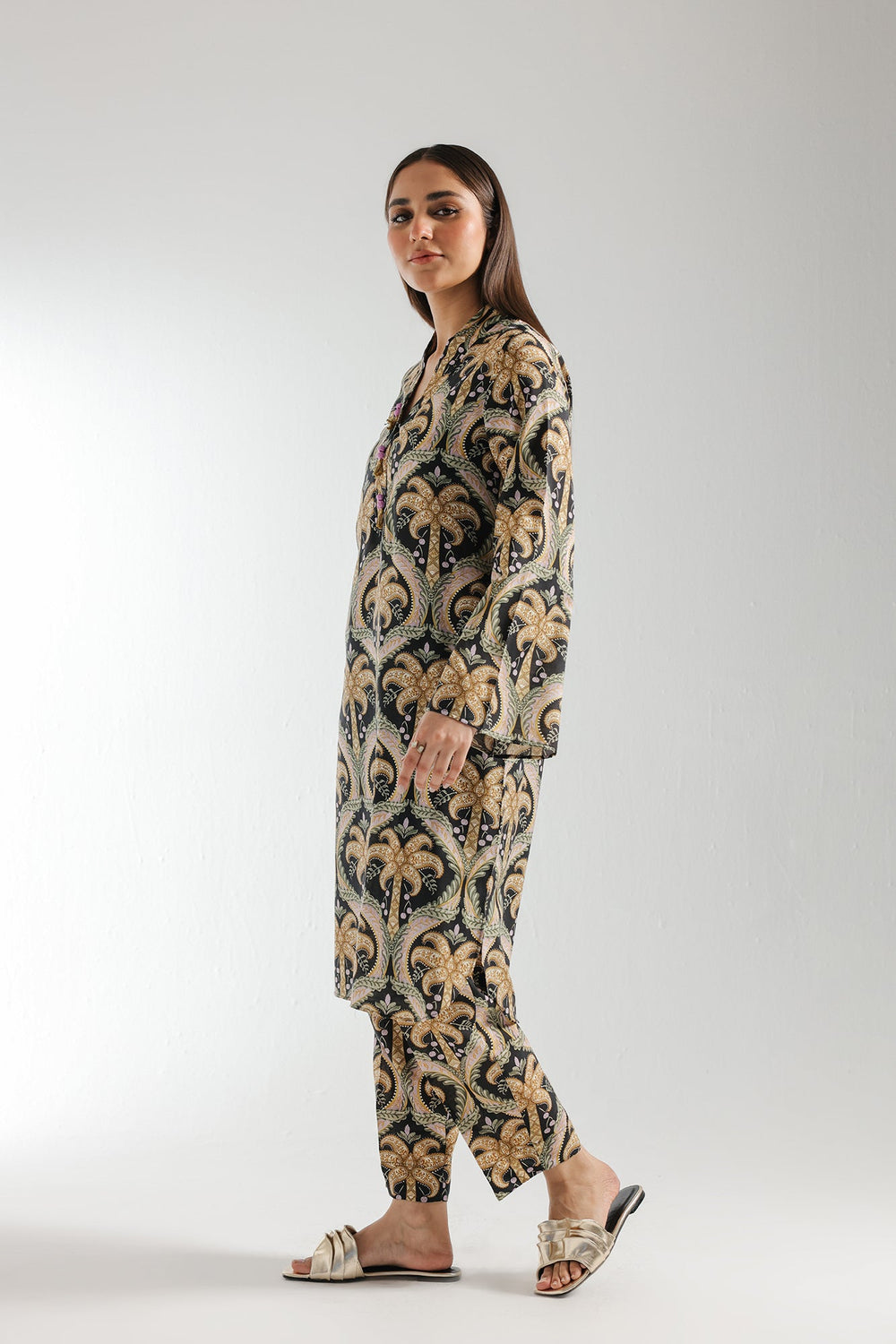 An enchanting composition is layered over this graceful ensemble portraying a mesmerizing deep black shade. It depicts a contemporary silhouette shirt adorned with captivating pattern printed in fascinating hues. Paired with a matching trouser, this aesthetically rich outfit is a great option for fun gatherings this season.