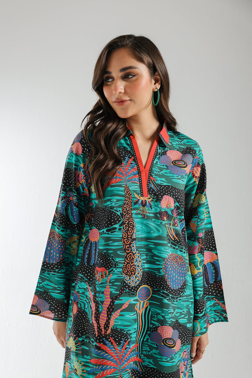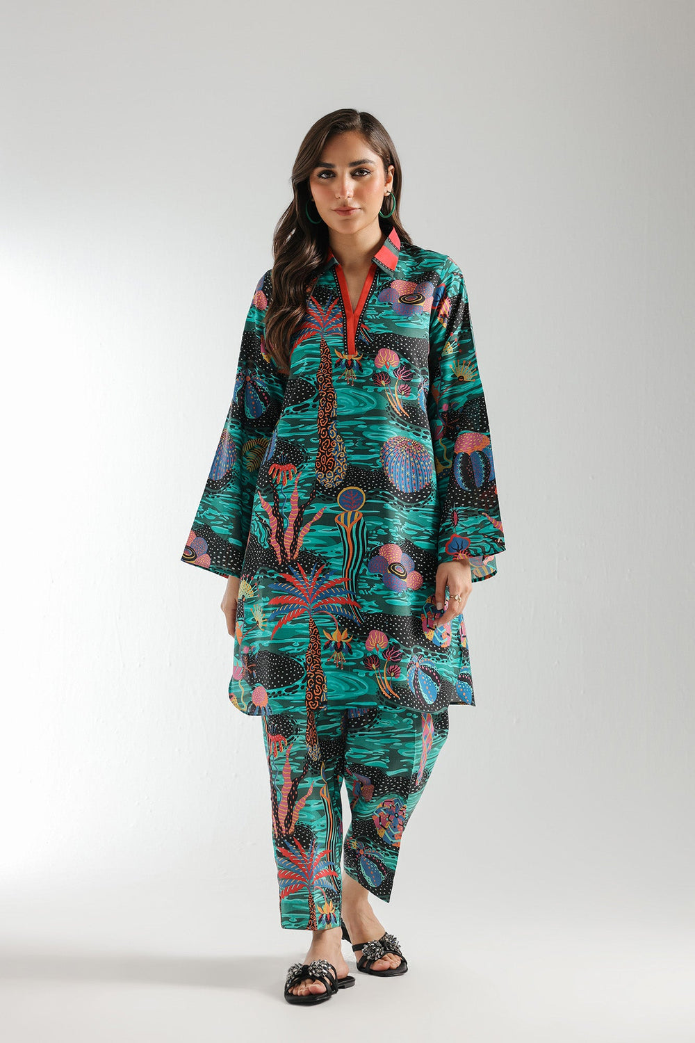 An enchanting composition is layered over this graceful ensemble portraying a mesmerizing emerald shade. It depicts a contemporary silhouette shirt adorned with captivating tropical prints in vibrant hues. Paired with a matching trouser, this aesthetically rich outfit is a great option for fun gatherings this season.