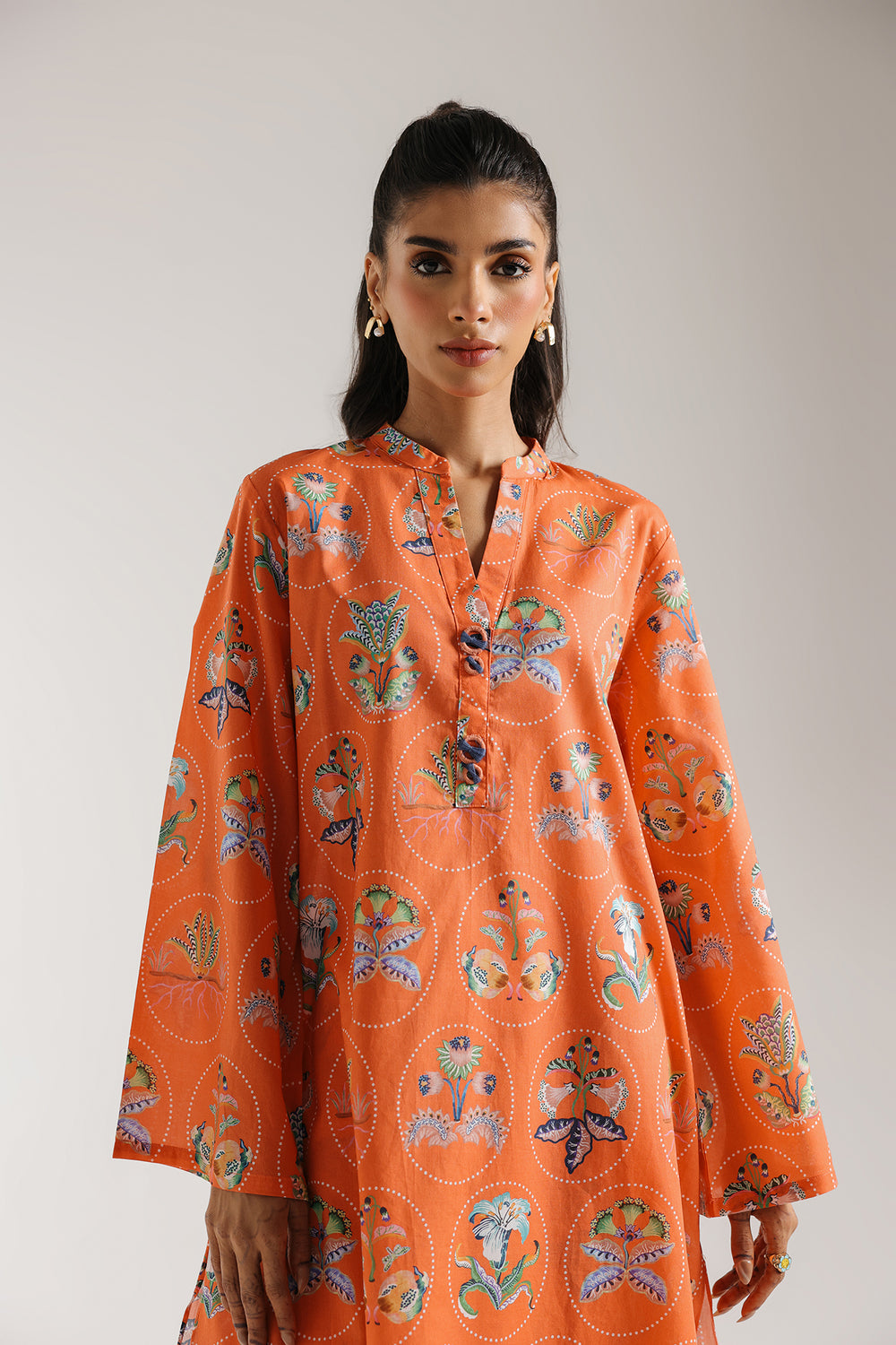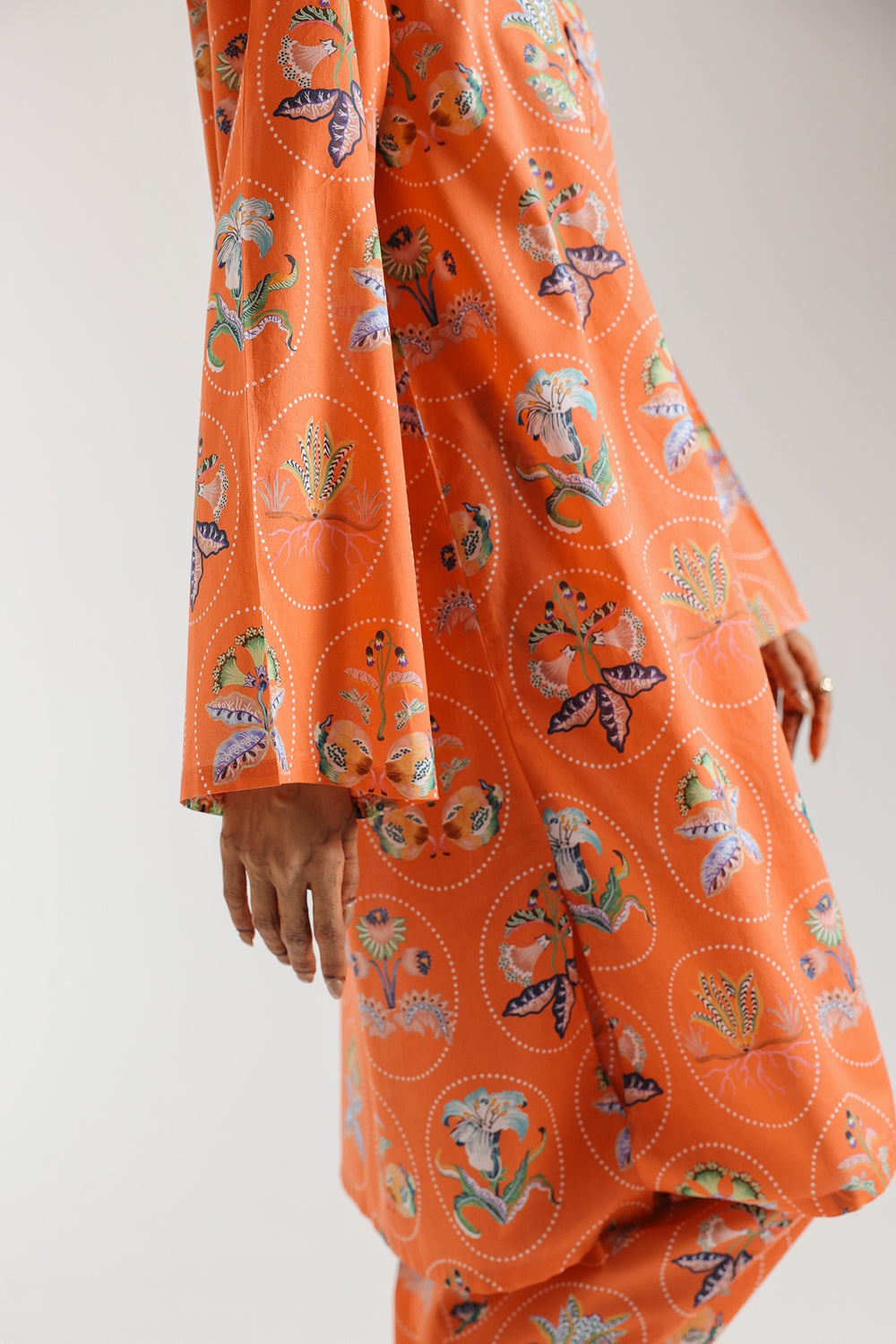 A contemporary composition is layered on this trendy silhouette shirt beautifully adorned with captivating artistic prints in vibrant colors portrayed on a mesmerizing orange canvas. Paired with a matching trouser, this style statement outfit is a perfect option for you to embrace this summer season.