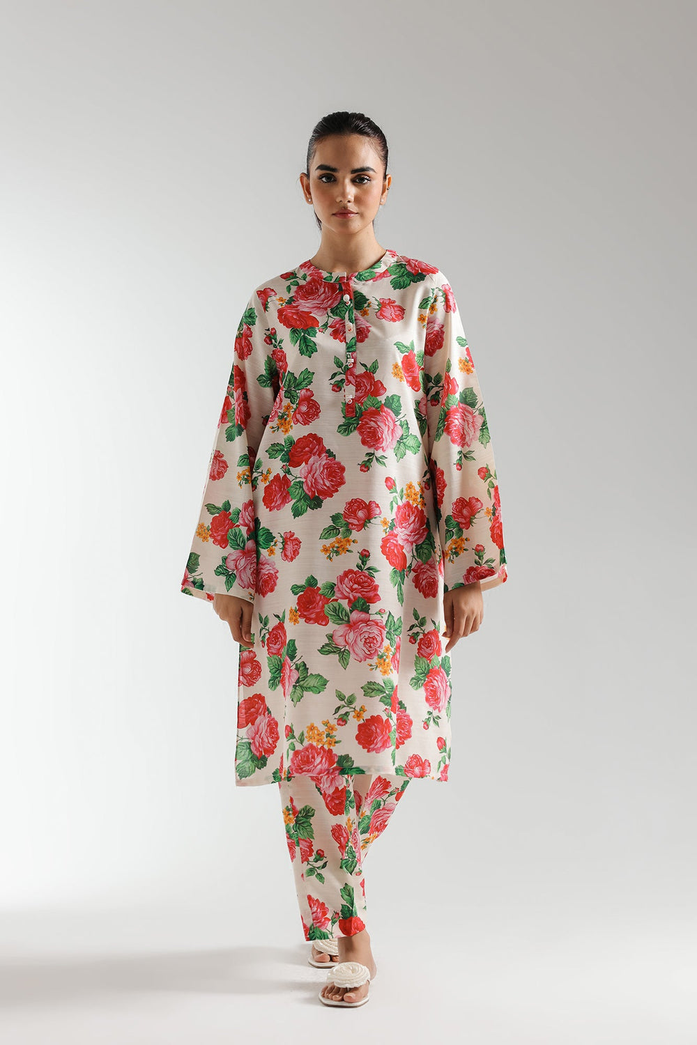 A contemporary composition is layered on this trendy silhouette shirt beautifully adorned with captivating artistic prints in vibrant colors portrayed on a subtle lemon icing canvas. Paired with a matching trouser, this style statement outfit is a perfect option for your girls to embrace this spring season.