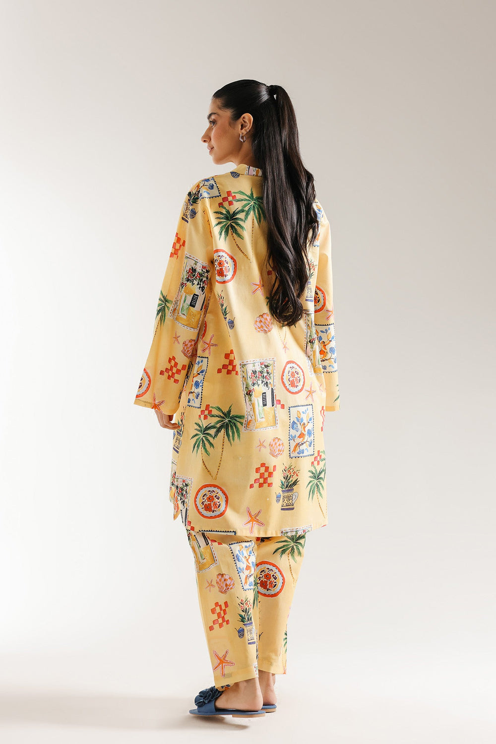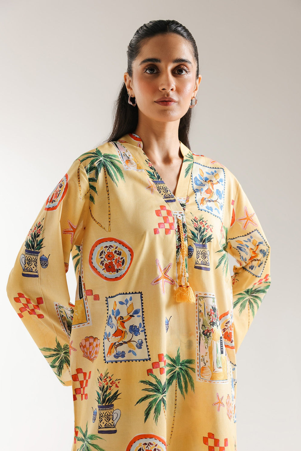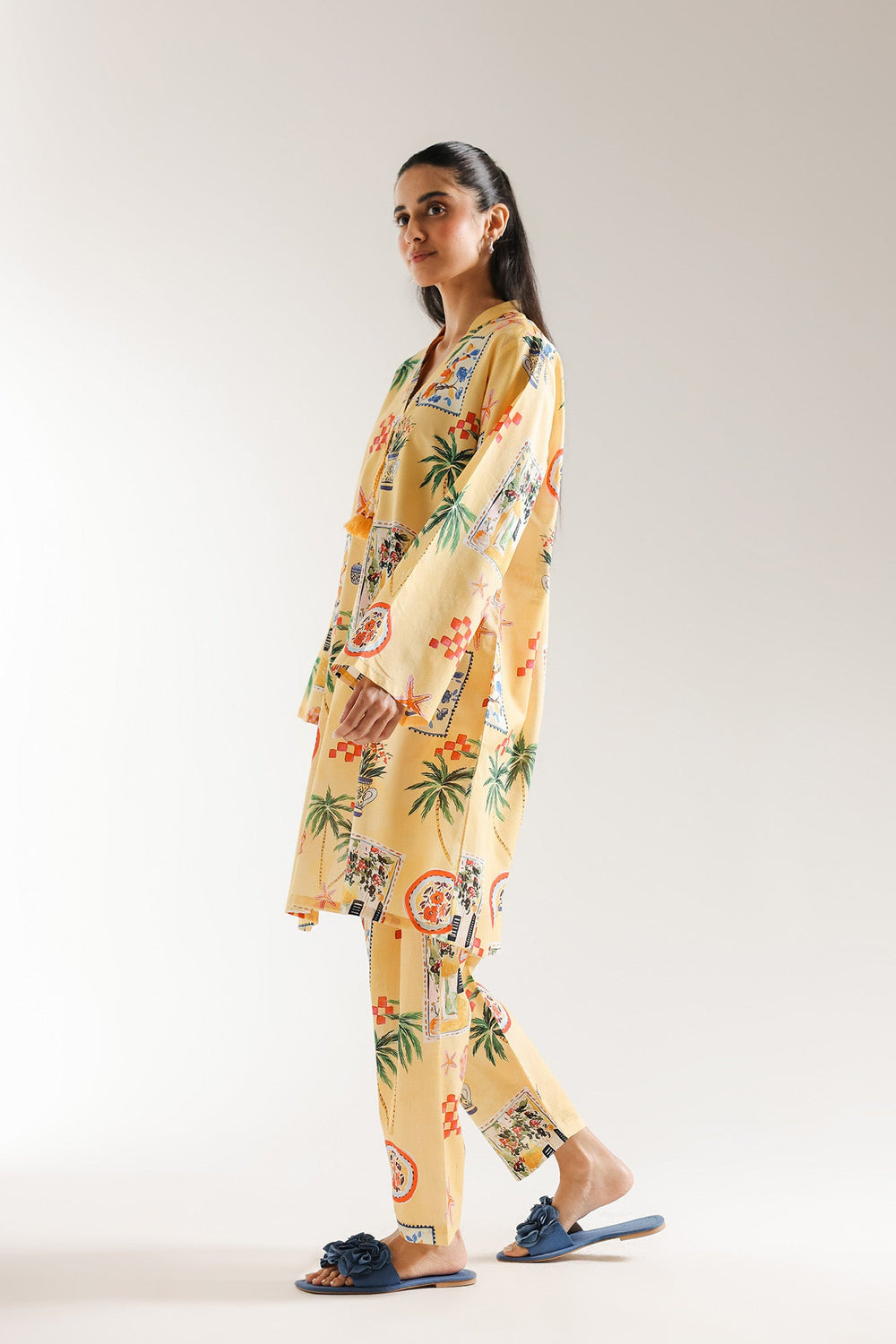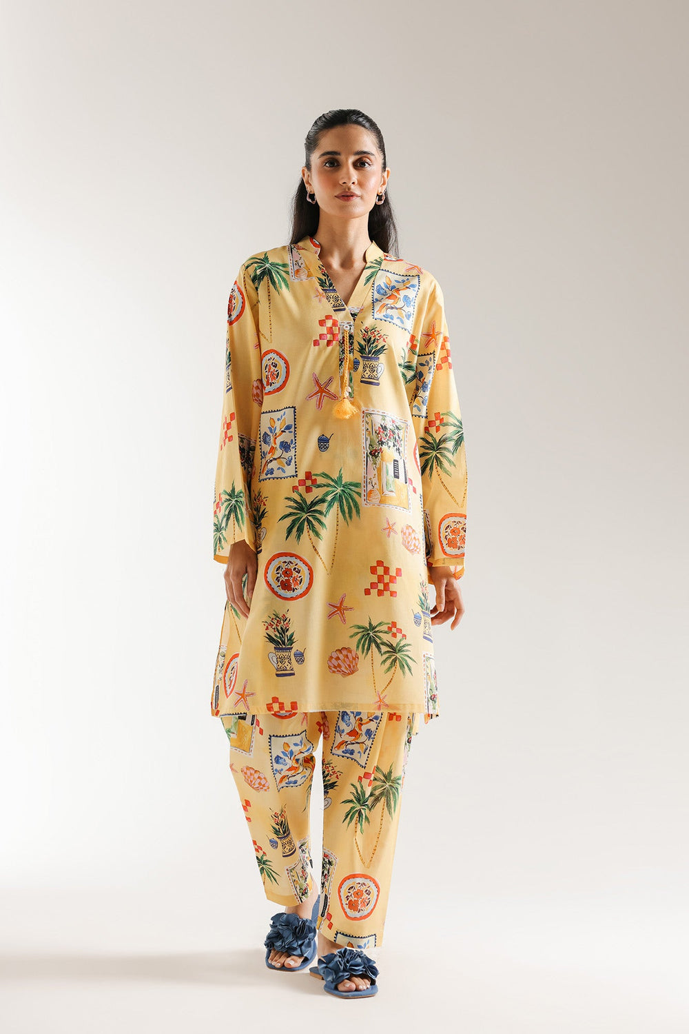 A contemporary composition is layered on this trendy silhouette shirt beautifully adorned with captivating artistic prints in vibrant colors portrayed on a gleaming yellow canvas. Paired with a classy printed shalwar, this style statement outfit is a perfect option for you to embrace this summer season.
