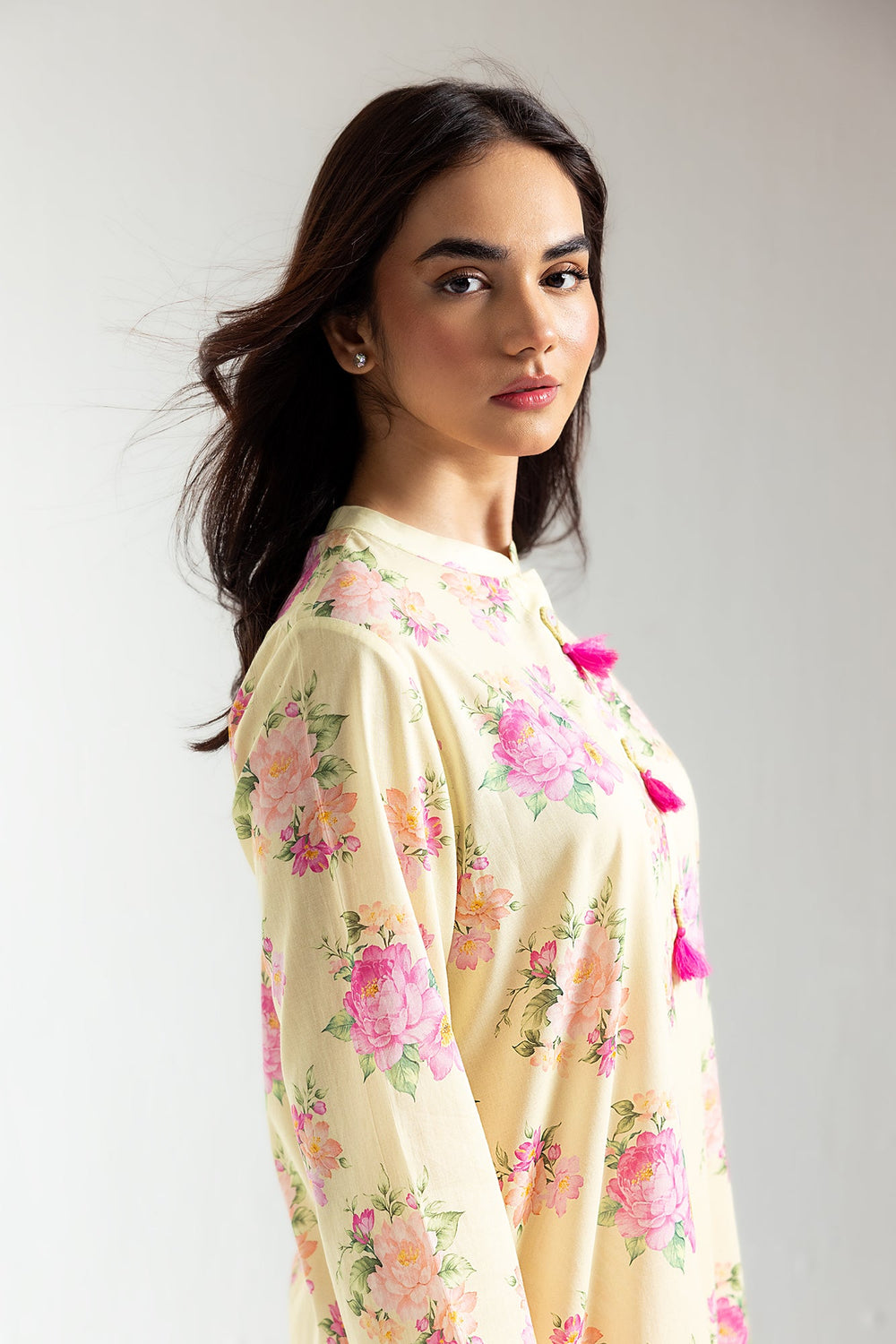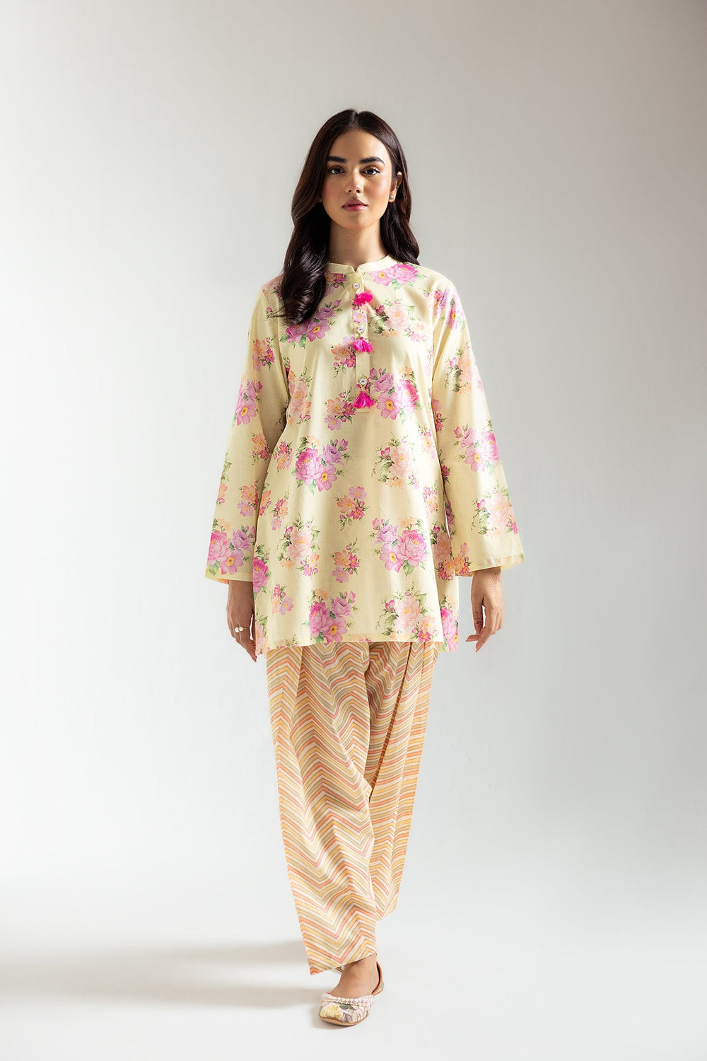 Discover the ideal blend of modern and fashionable aesthetics with this sophisticated ensemble. Showcasing stunning botanical patterns in bold, vivid hues on a captivating yellow beige backdrop, it includes a stylish shirt in an elegant shape and a contrasting chevron stripes printed shalwar. This outfit is perfect for embracing the summer season.