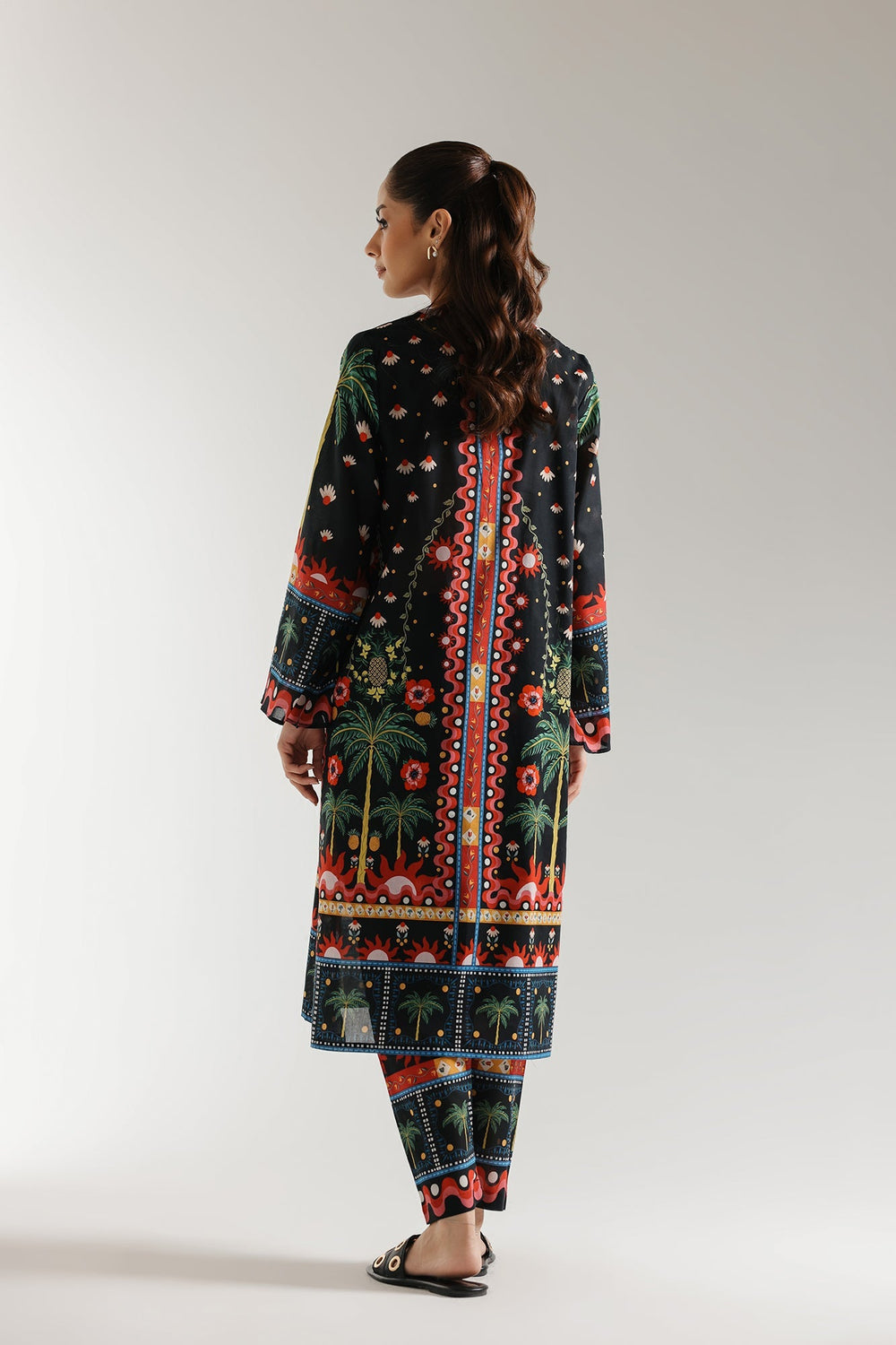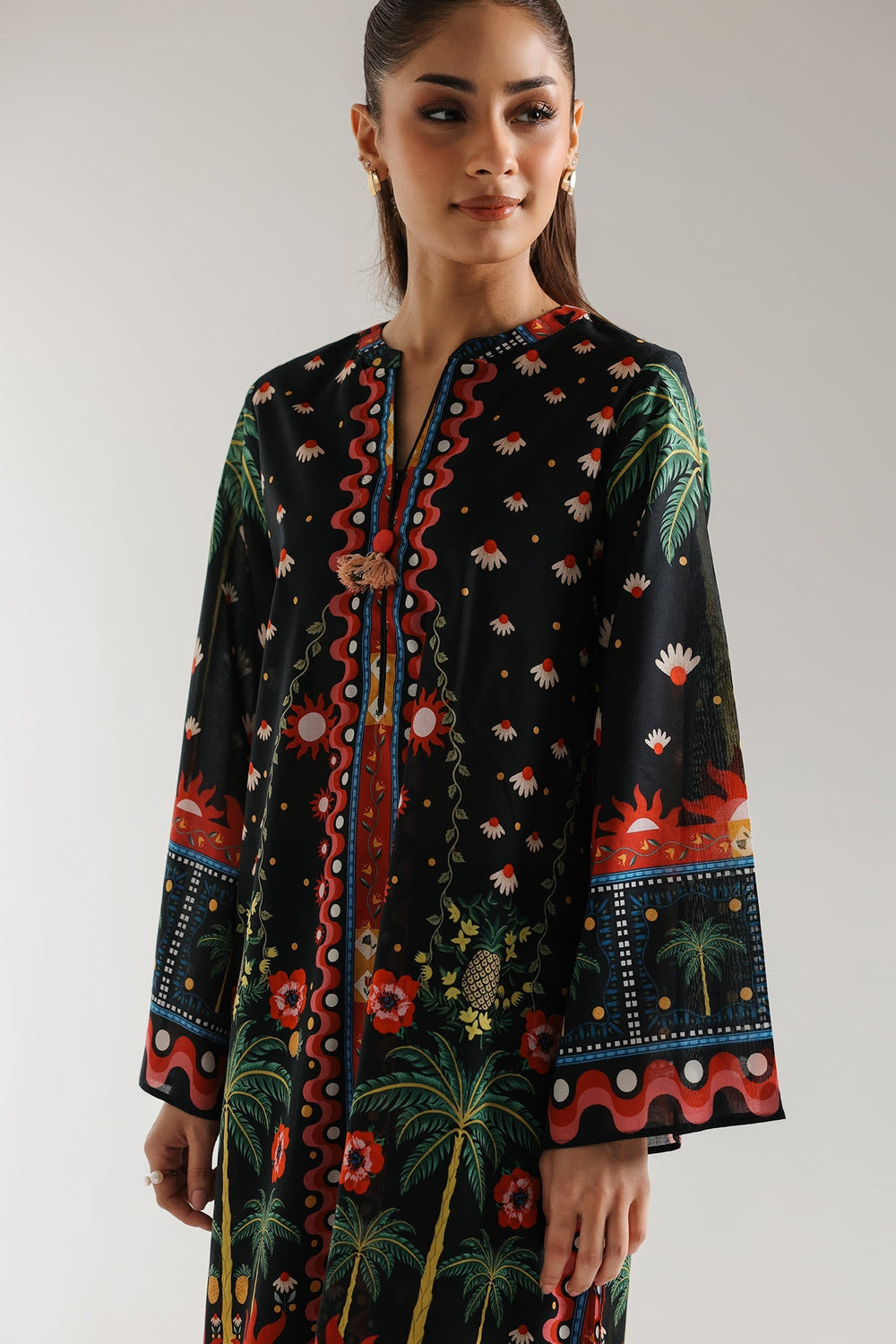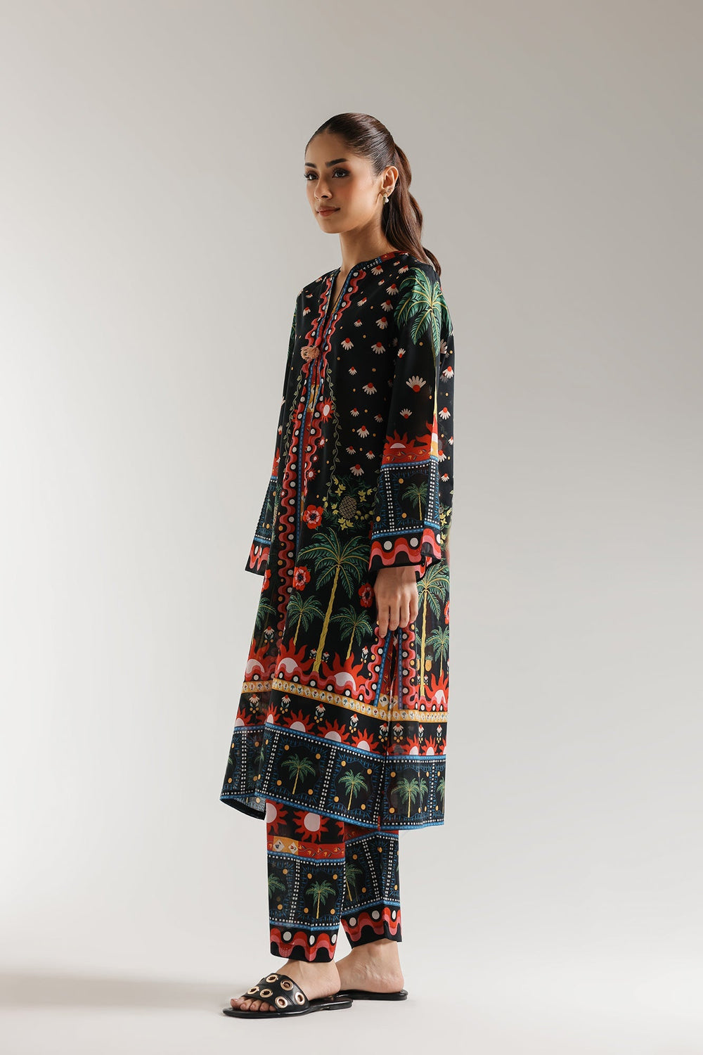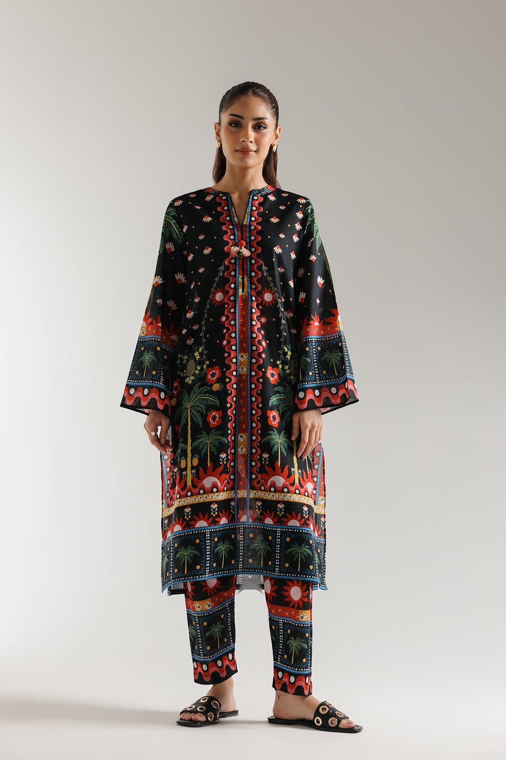 Step into a world of vibrant artistry with this captivating black ensemble, a rich tapestry of exotic inspiration. Picture yourself in a lush, moonlit setting where stylized palm trees gently sway and colorful blooms flourish under a starlit sky. More than just an outfit, this is wearable artistry. The deep black fabric creates a striking foundation for a mesmerizing print that bursts with energy. Intricate borders in fiery reds, electric blues, and sunny yellows frame the neckline, sleeves, and hem, drawing the eye to the exquisite detail. The coordinating printed trousers seamlessly complete this striking look. Designed for those who dare to embrace bold style, this ensemble is a statement in itself.