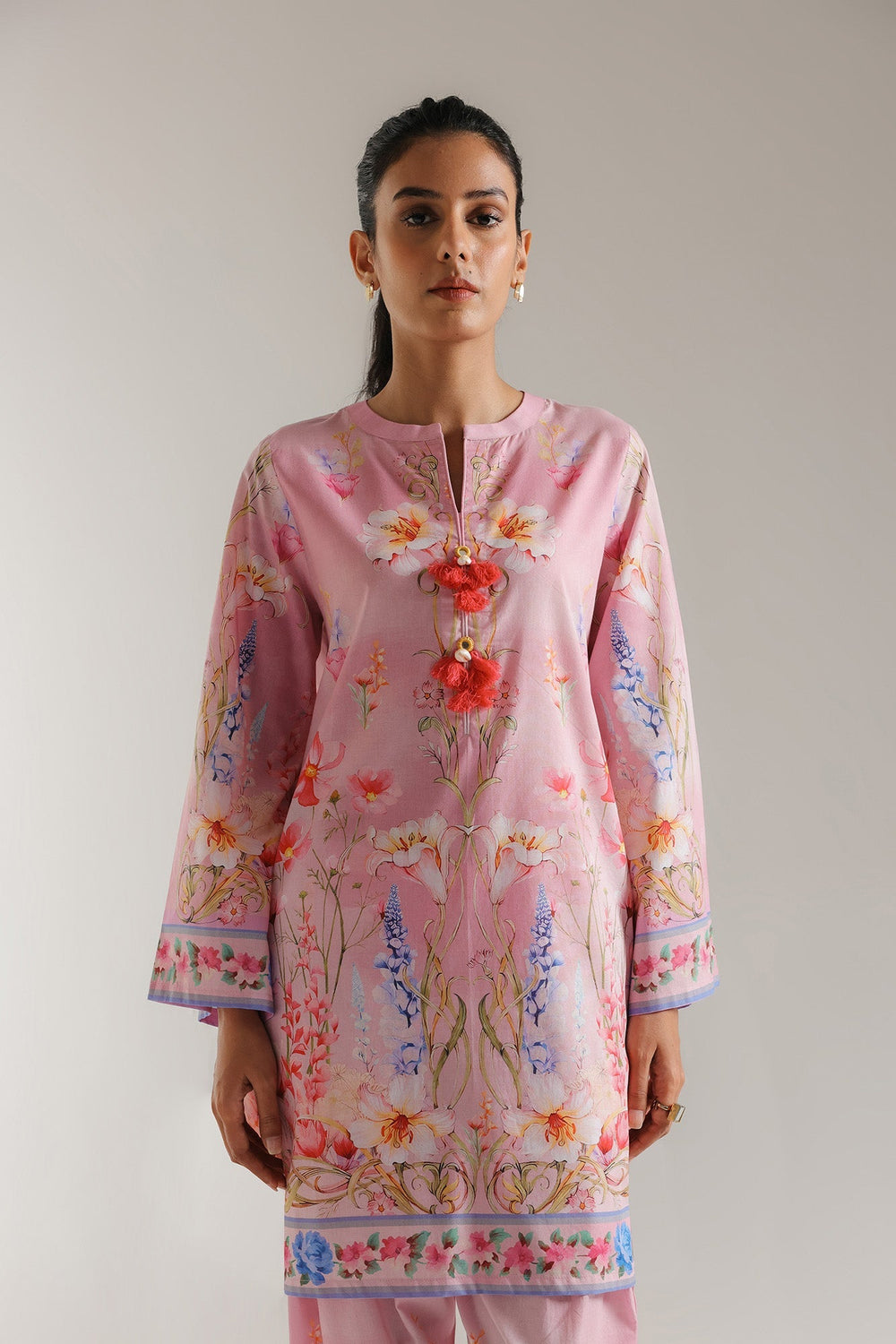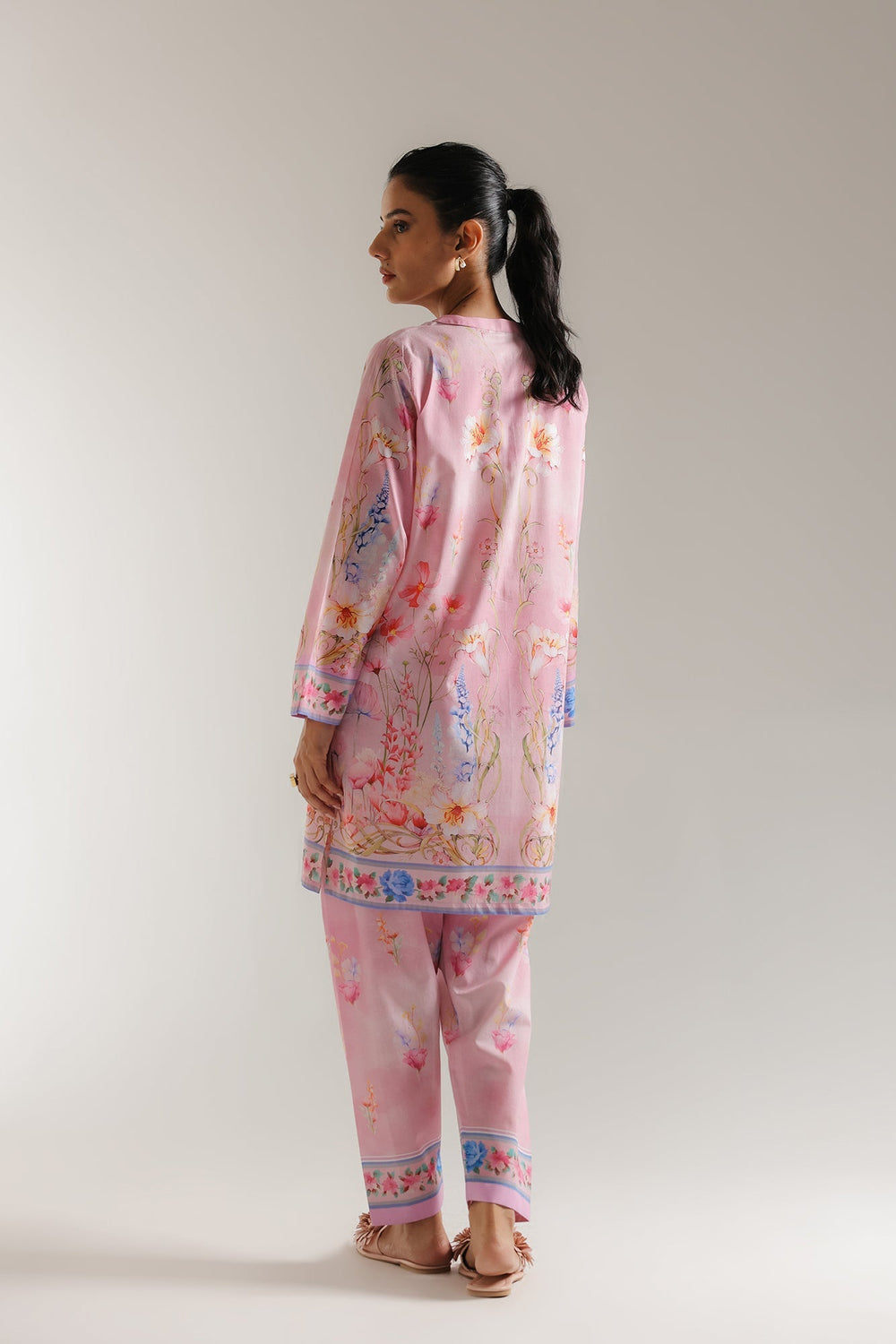 Radiate charm and sophistication in this beautiful pink ensemble, featuring a delightful blend of floral elegance and modern design. The shirt showcases an intricate all-over floral print with delicate blooms in shades of pink, blue, and hints of green, creating a lush, artistic canvas. Paired with a shalwar that feature a matching floral print and border at the hem, this outfit is perfect for festive occasions, semi-formal events, or any moment you wish to infuse your style with graceful color.