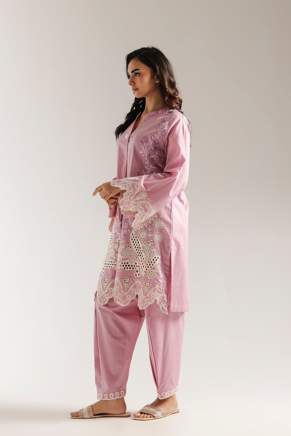 This elegant embroidered suit is a beautiful blend of soft color and intricate artistry. The delicate pink kurta features a beautiful contrast of fine floral embroidery on the bodice and a stunning, bold cutwork and embroidery design on the hem. Paired with a perfectly coordinated shalwar, this ensemble offers a sophisticated and graceful look.