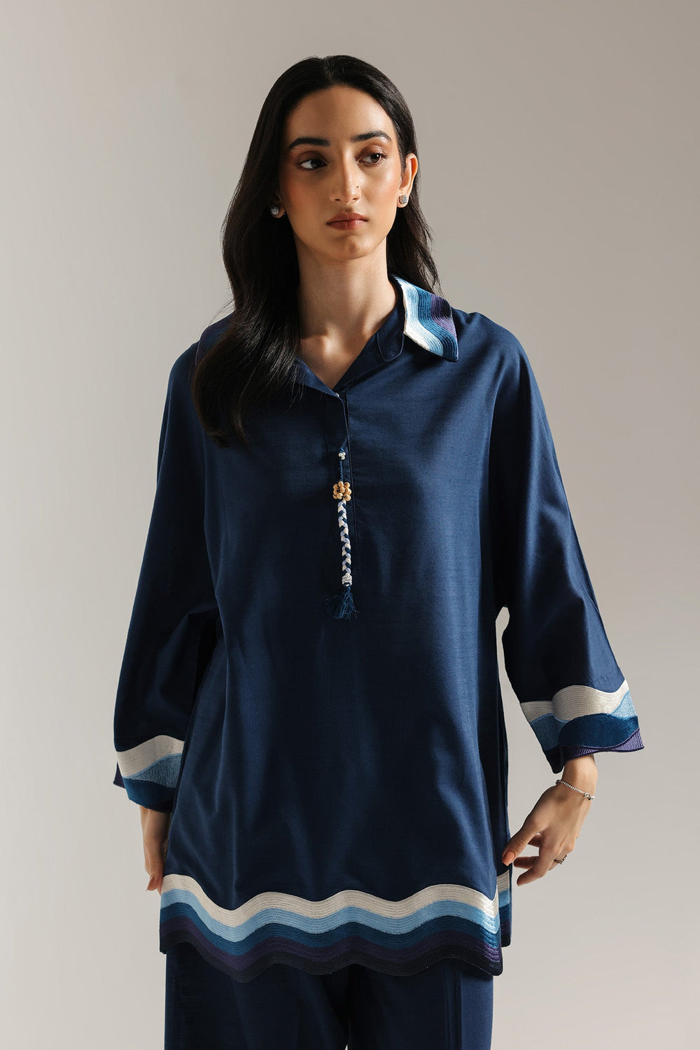 A vision of modern elegance, this sophisticated suit is a study in streamlined design and captivating color. The deep navy blue fabric of the shirt and trousers provides a stunning canvas for the bold, horizontal bands in varying shades of light blue and white. The shirt features a refined collar and a stylish placket with a single hanging accent, while its wide sleeves and hem are beautifully finished with the same striking bands. This ensemble is a perfect blend of comfort and contemporary chic, making a powerful yet graceful statement.