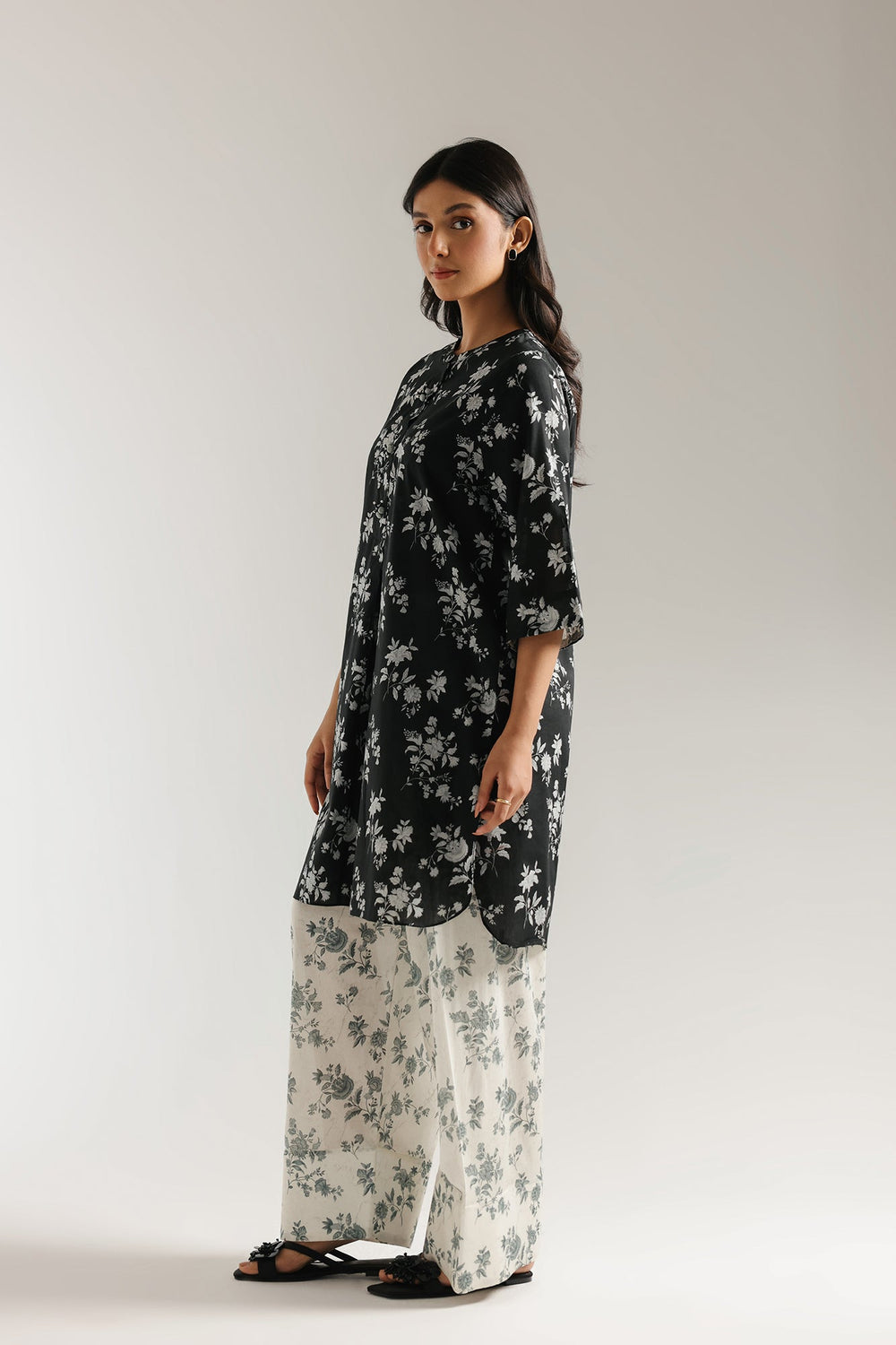Embrace timeless chic with this striking black and white outfit. The stylish kurta showcases an alluring all-over print of white florals against a deep black canvas, featuring a sophisticated band collar and a front button placket. Paired with elegantly printed white shalwar, this ensemble offers a modern and versatile silhouette, perfect for any occasion that calls for understated sophistication.