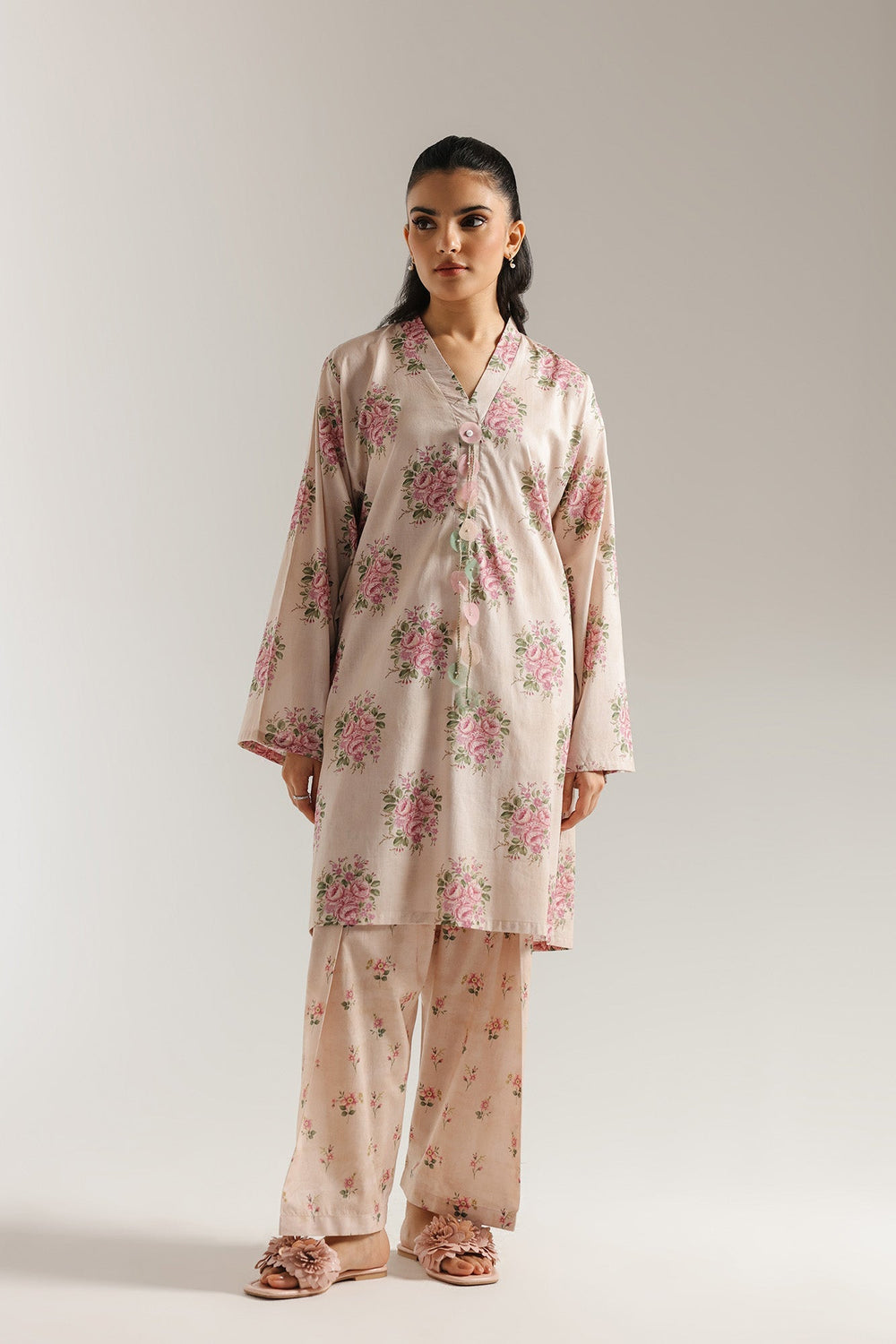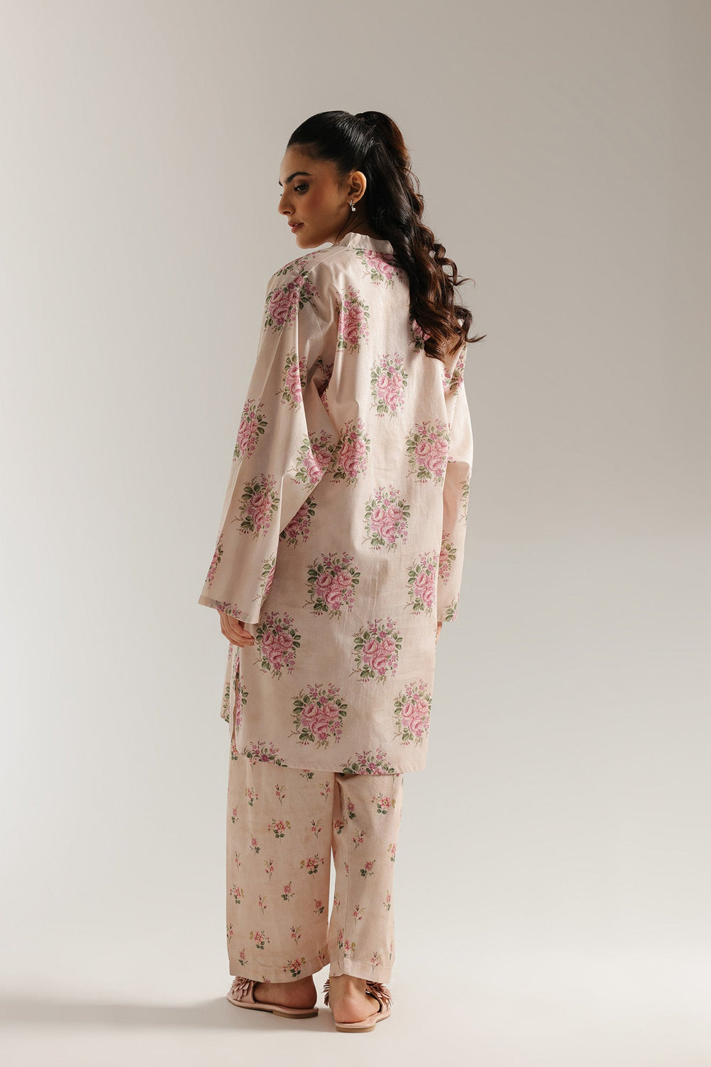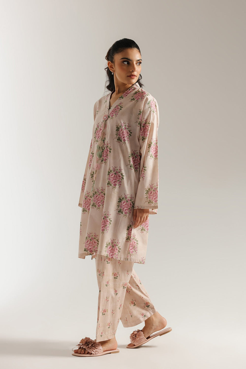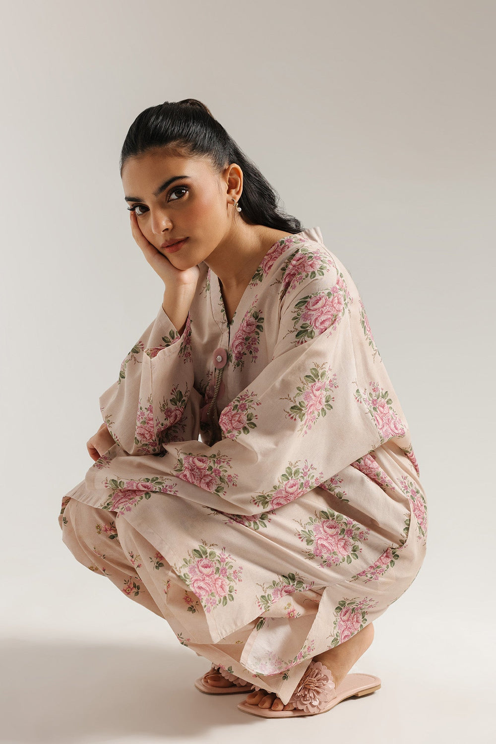 Wrapped in a cascade of blush and blooms, this printed suit is the epitome of romantic elegance. The soft, pink fabric is adorned with a delicate and timeless floral print in deeper shades of rose, creating a sense of serene beauty. The relaxed-fit shirt features a graceful V-neckline and full, voluminous sleeves, while the matching shalwar continue the charming floral pattern. This ensemble perfectly balances effortless comfort with refined, feminine style.