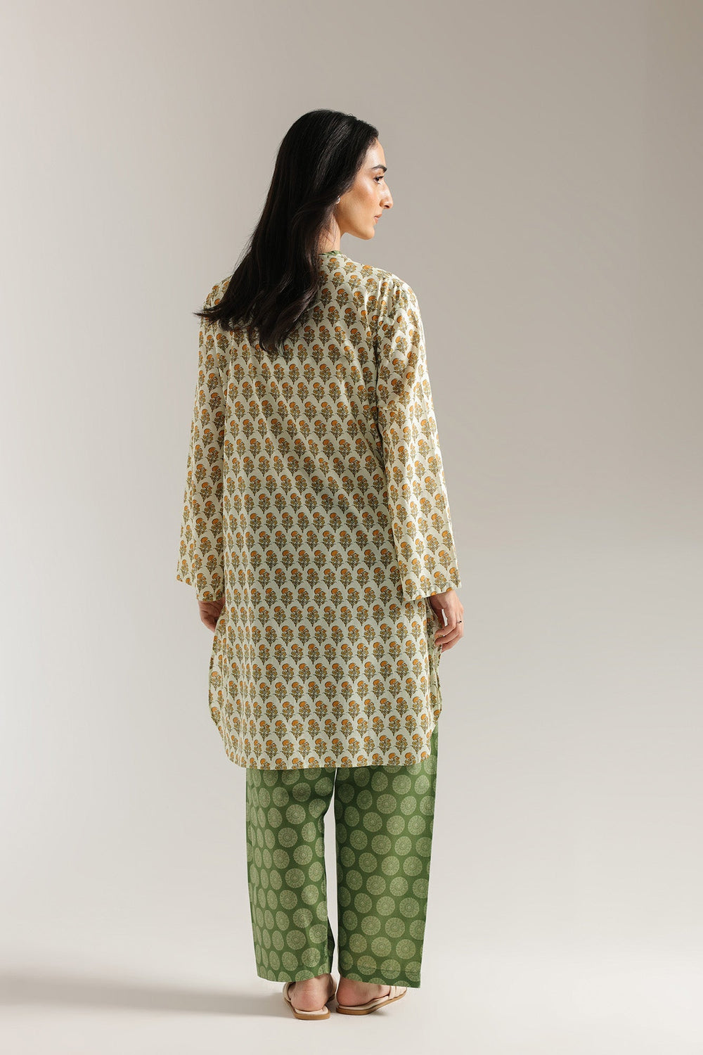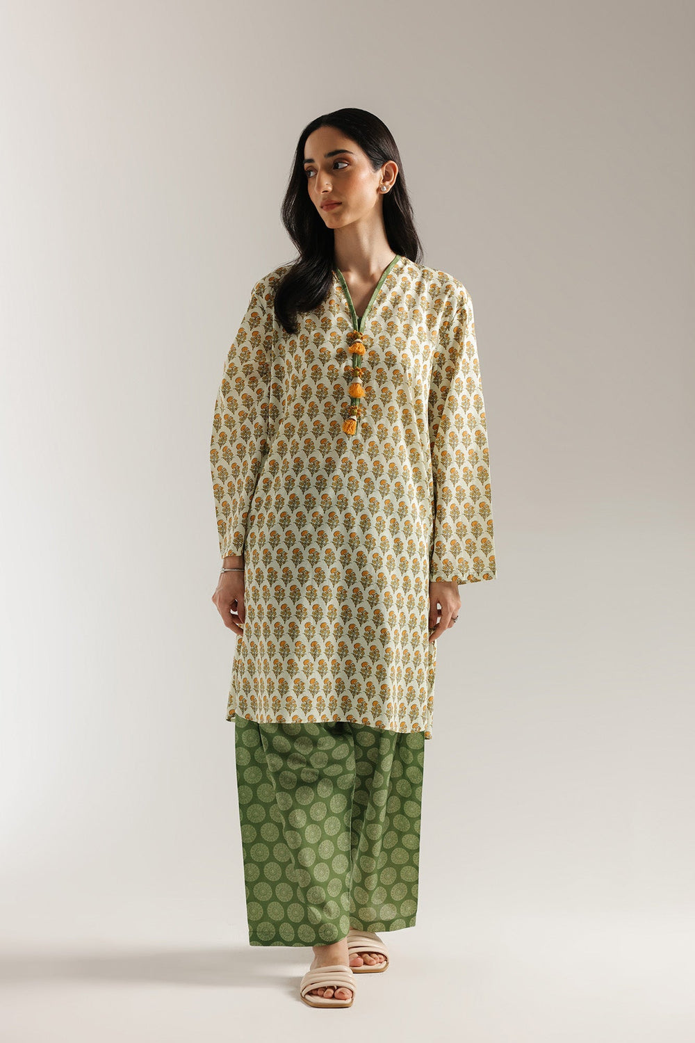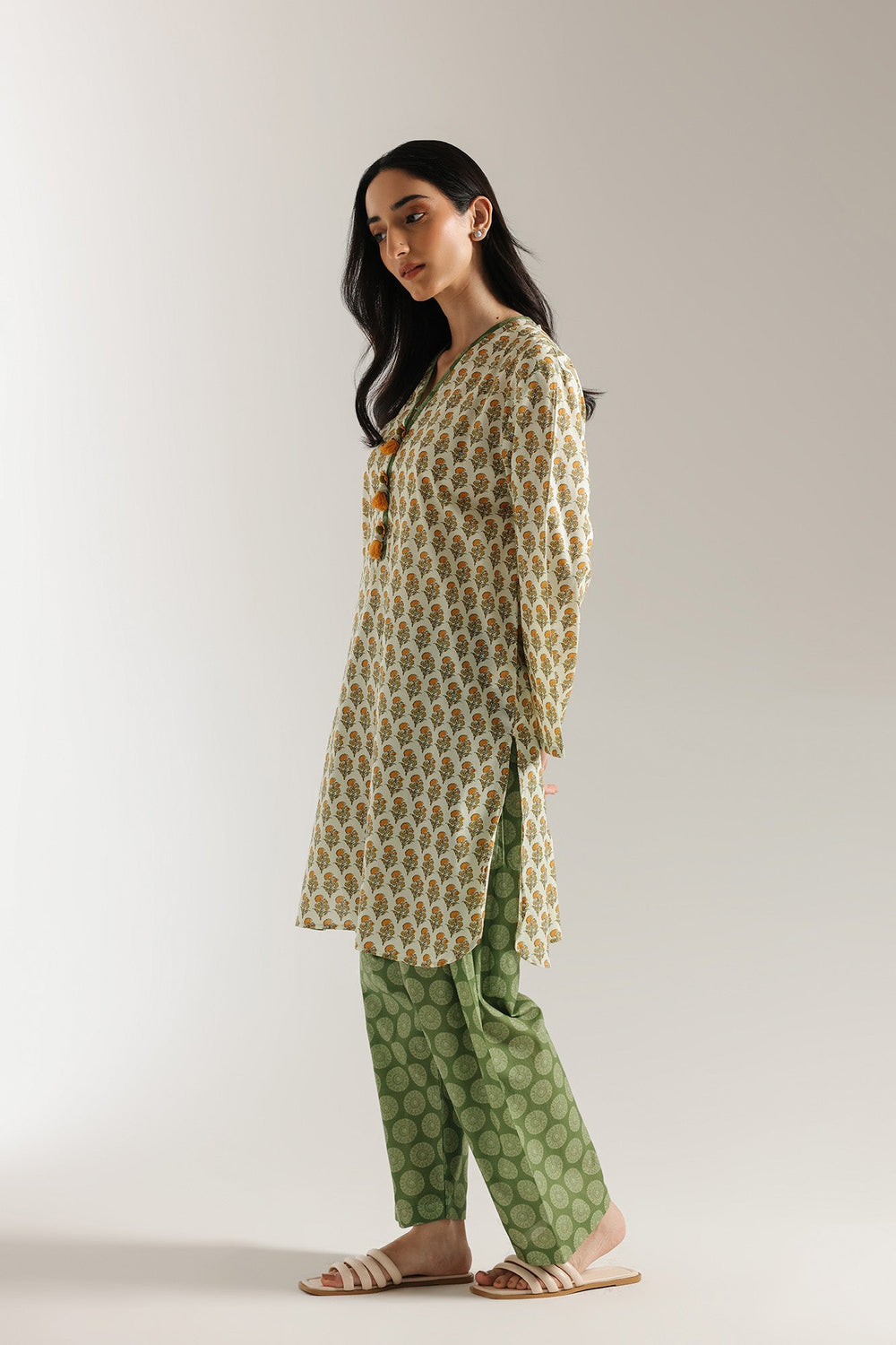 Evoking the warmth of sun-drenched orchards, this printed suit is a delightful fusion of tradition and fresh style. The long, straight-cut shirt features a charming all-over block print of small, stylized floral motifs in rich golden yellow and muted green against a creamy base. The V-neckline is accented with a contrasting green trim that continues down the placket, adorned with decorative buttons in shades of yellow and green. Completing the ensemble is a coordinating shalwar in complementary shade of green with a subtle, stylized print, creating a look that is both vibrant and effortlessly elegant.