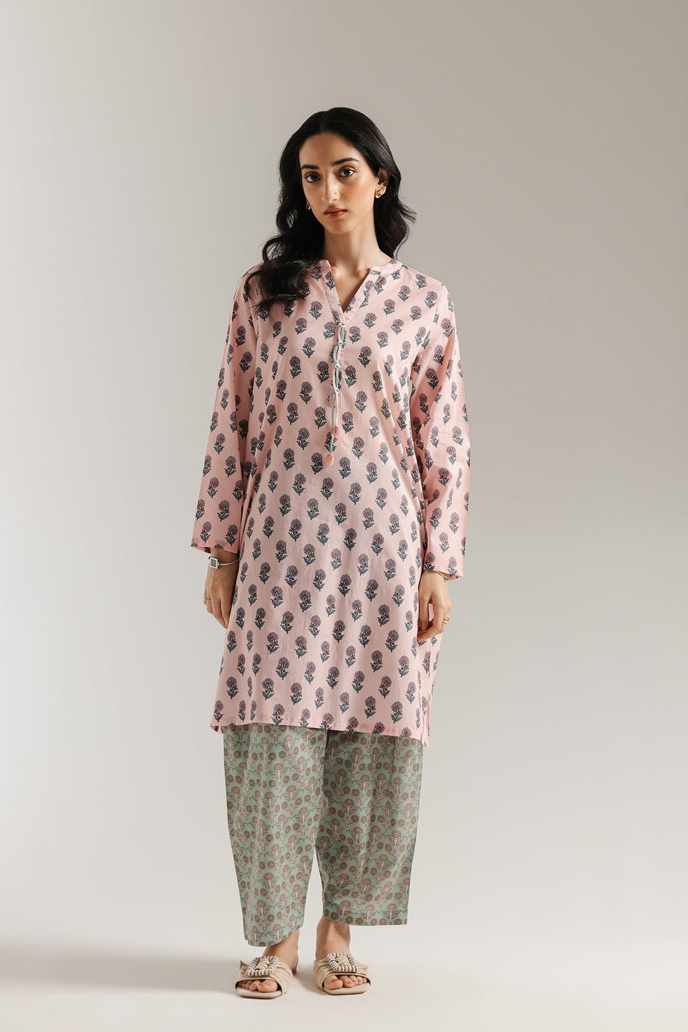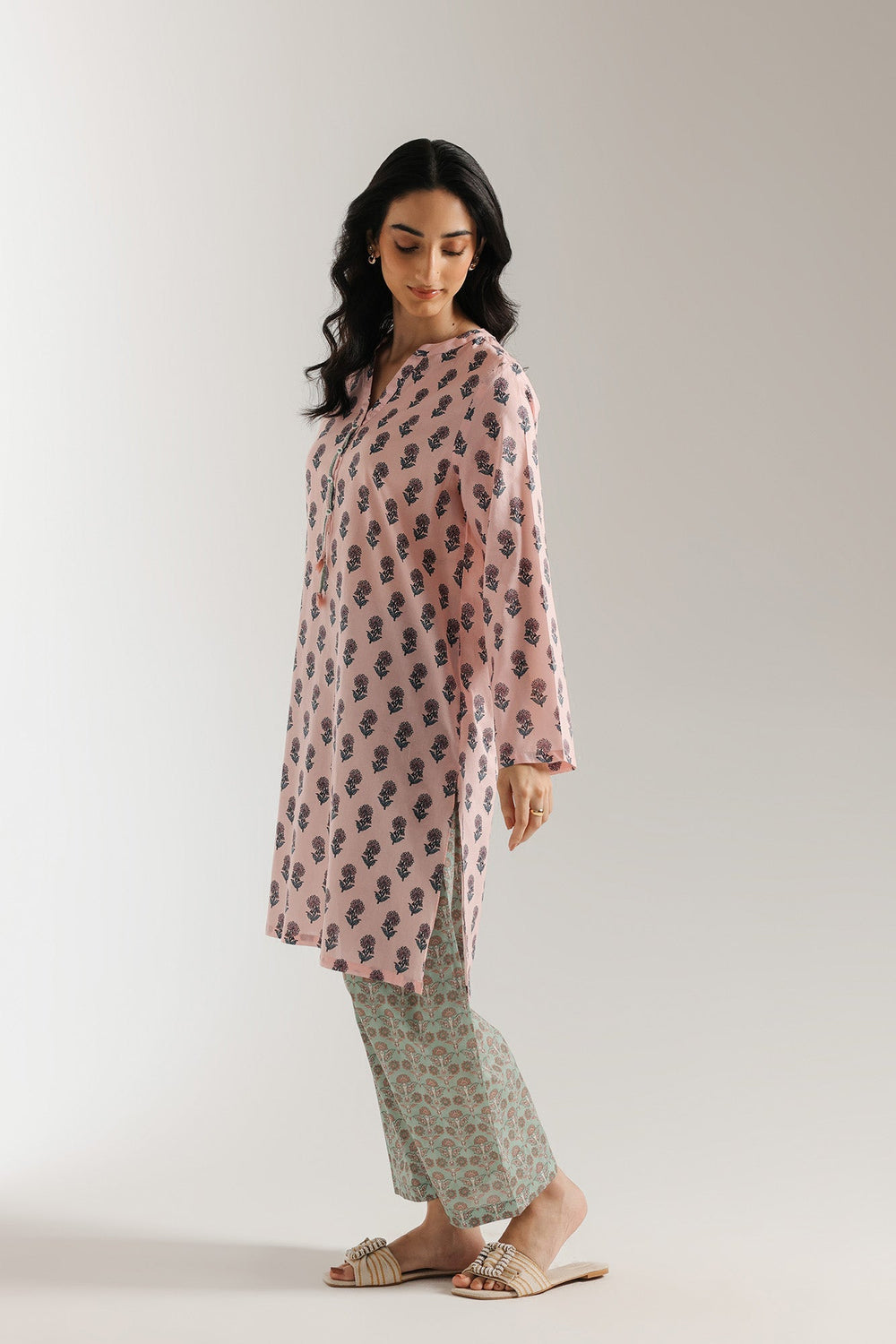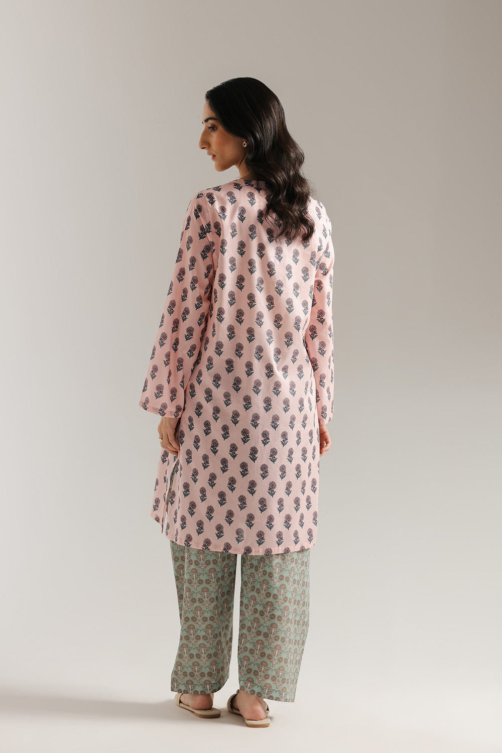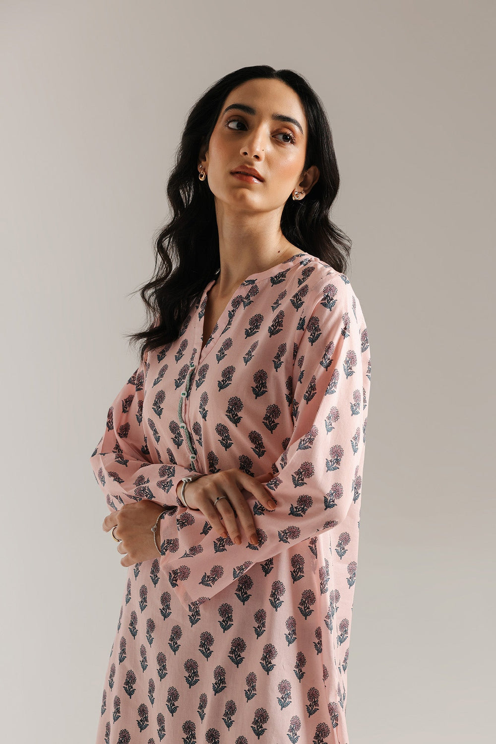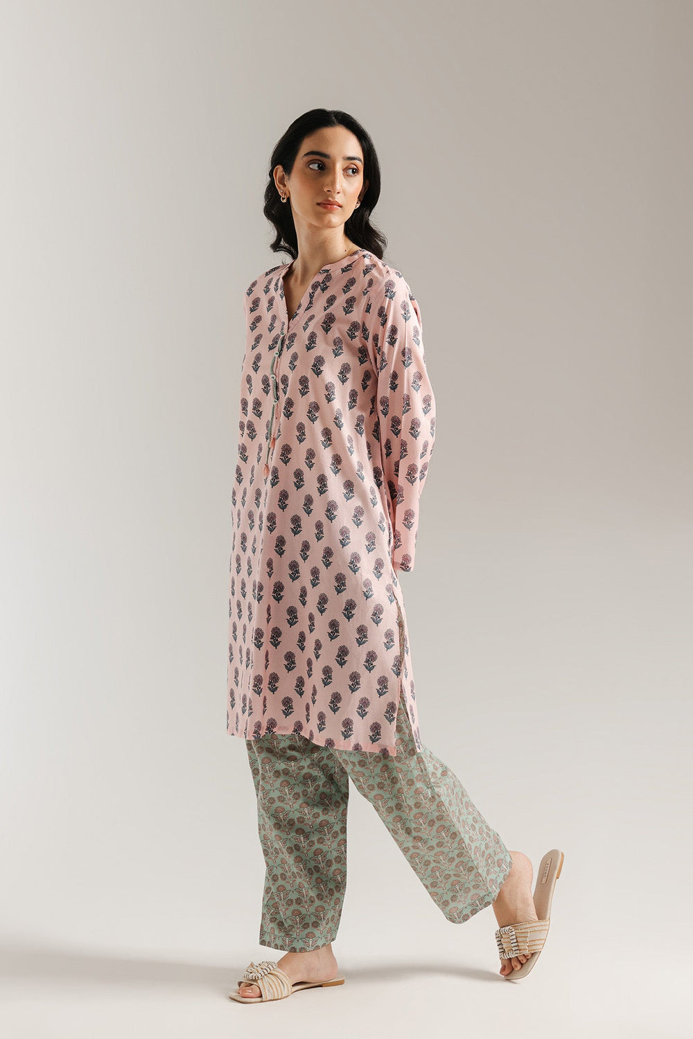 Evoking the warmth of sun-drenched orchards, this printed suit is a delightful fusion of tradition and fresh style. The long, straight-cut shirt features a charming all-over block print of small, stylized floral motifs in rich pink yellow and muted green against a creamy pink base. The V-neckline is accented with tassels that continues down the placket, adorned with decorative buttons. Completing the ensemble is a coordinating shalwar in complementary shade of grey with a subtle, stylized print, creating a look that is both vibrant and effortlessly elegant.