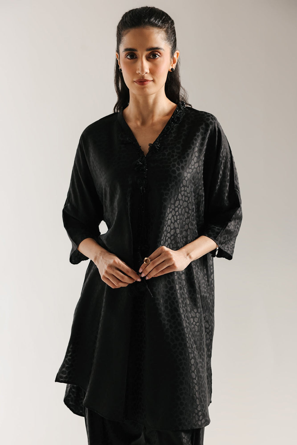 Embrace sophisticated simplicity with this classic black suit. This all-black two-piece ensemble features a subtly textured fabric with a delicate, all-over embossed pattern that adds depth and allure. The classic kurta silhouette offers a comfortable yet refined fit, perfectly complemented by the matching black shalwar. This suit is a versatile and timeless choice, ideal for those who appreciate understated luxury and effortless style.