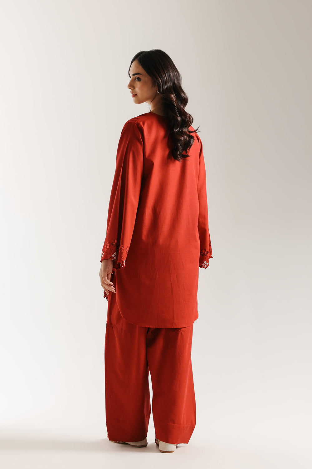 Ignite a festive mood with this stunning, deep red embroidered suit. The short loose fit shirt features a beautifully scalloped hem and is exquisitely adorned with intricate white and monochrome embroidery in elegant floral and vine patterns that gracefully trail across the front and sleeves. The neckline is defined by a deep V-cut and features contrasting stitch detailing. The ensemble is perfectly completed with voluminous, wide leg shalwar, creating a vibrant and cohesive look for any celebration.