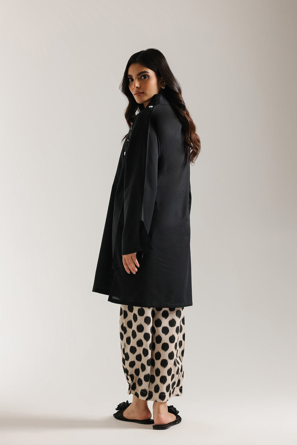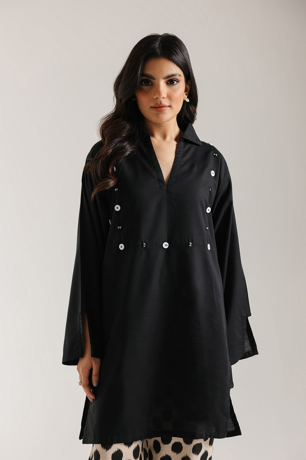 Make a bold and fashionable statement with this contemporary printed suit. This striking ensemble pairs a short-length kurti with wide-leg palazzo trouser. The kurti is crafted from a solid black fabric and features a modern V-neckline with a neat collar and a square of contrasting white button embellishments across the front. The drama lies in the trouser, which is made from a light-toned, beige fabric, featuring a large, abstract black dot print. This outfit offers a sophisticated high-contrast monochrome look with a chic blend of solid texture and bold pattern.