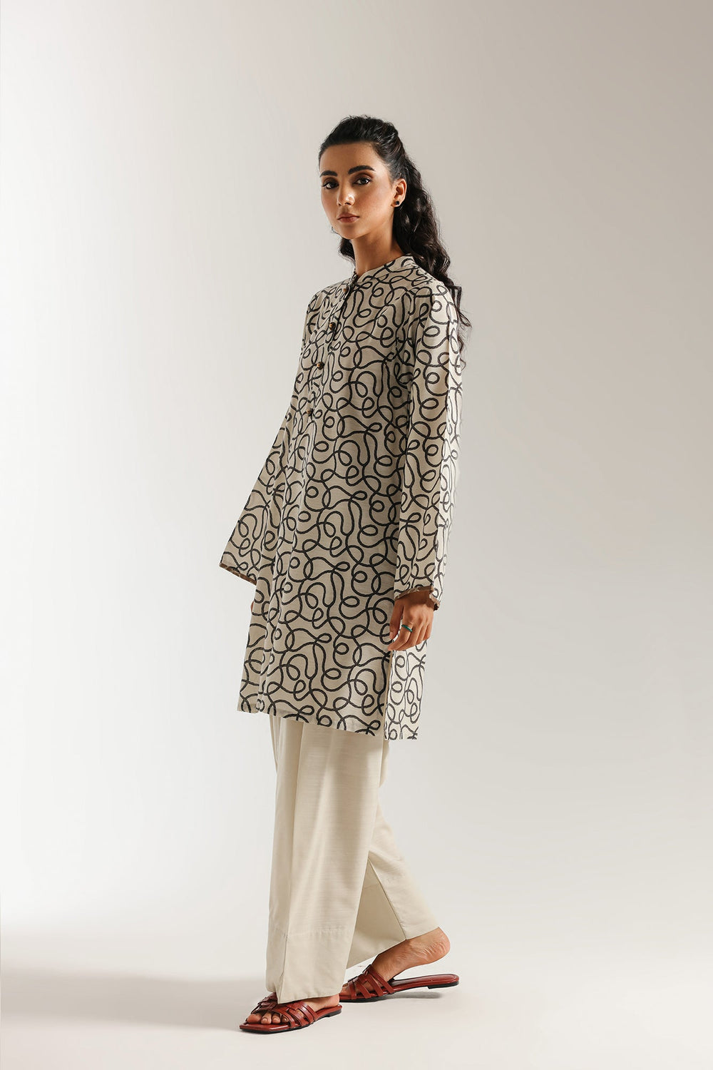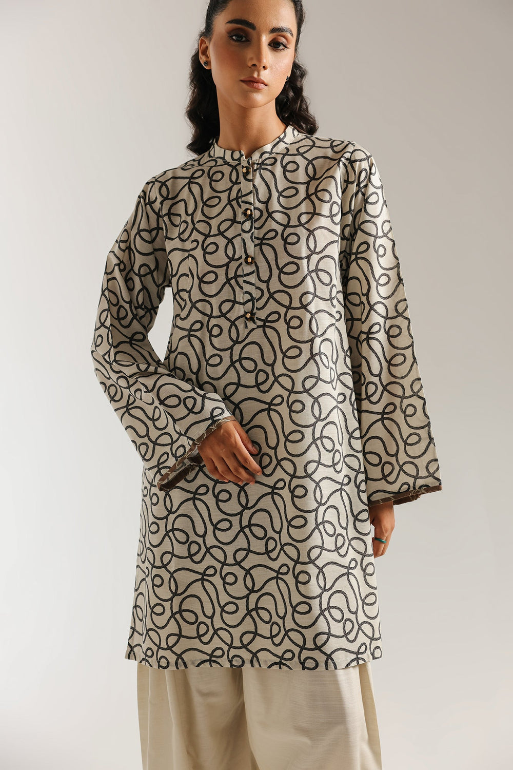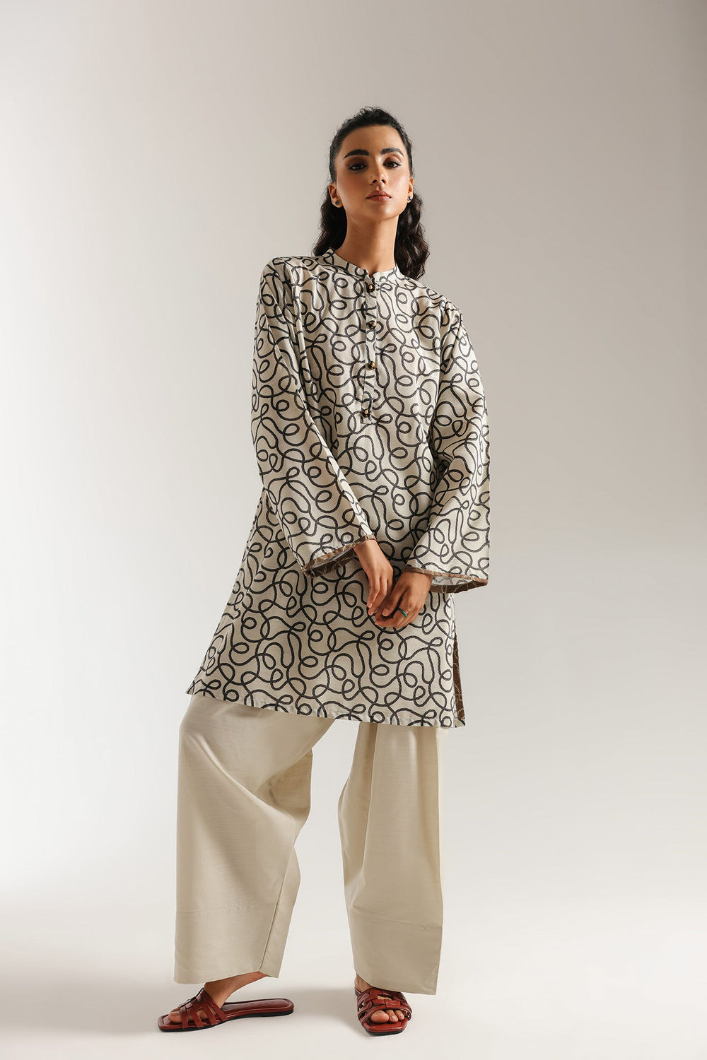 Explore the perfect fusion of modern art and classic style. This captivating suit features a beautifully fluid abstract print in contrasting shades of black and off-white. The long, relaxed-fit shirt and matching shalwar are adorned with this continuous, looping pattern, creating a visually dynamic ensemble.