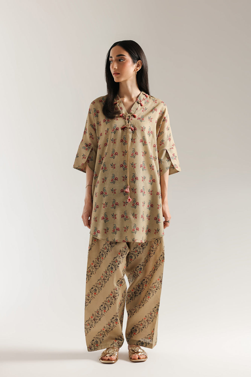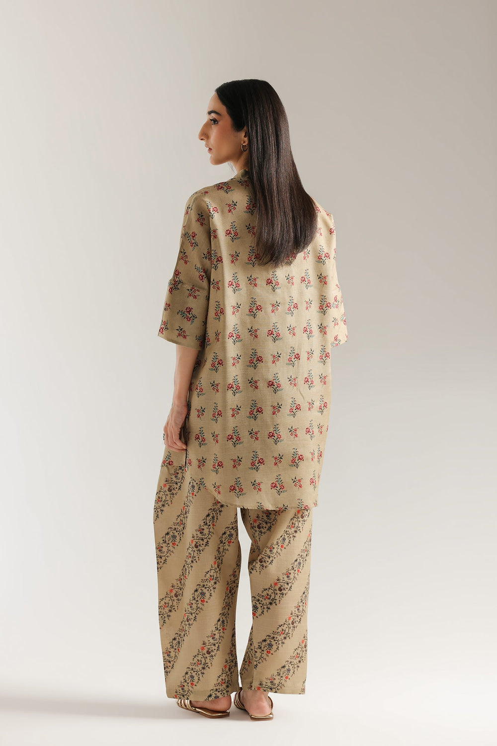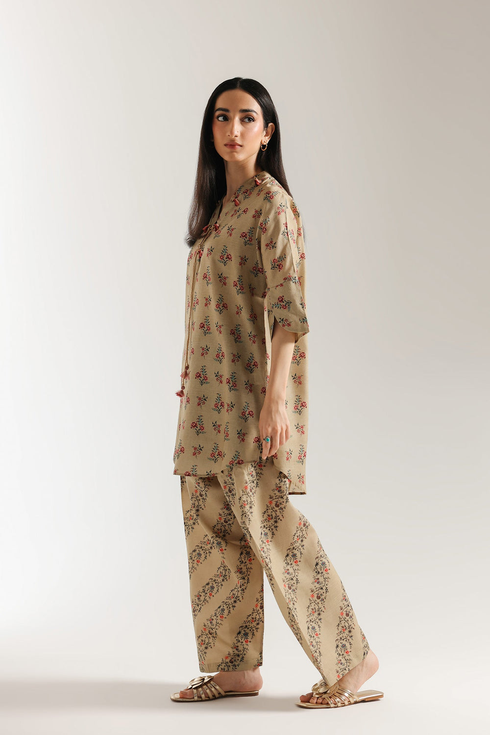 Indulge in the rustic charm of this beautiful printed suit. This two-piece ensemble is a work of art, with a beautiful tan base that serves as a graceful backdrop for its intricate designs. The shirt features a delicate floral print in shades of red and green, with a comfortable, relaxed fit. The suit is completed with matching shalwar that have a contrasting striped pattern, making it a perfect choice for any occasion.