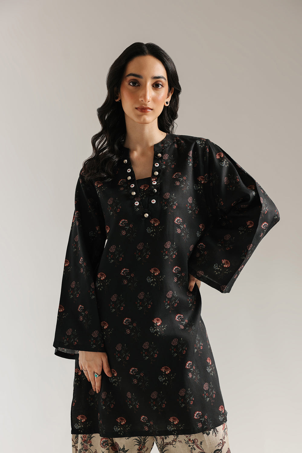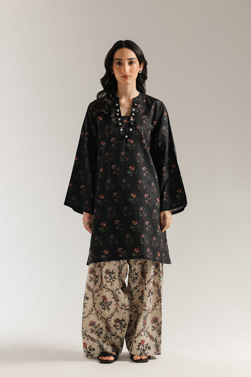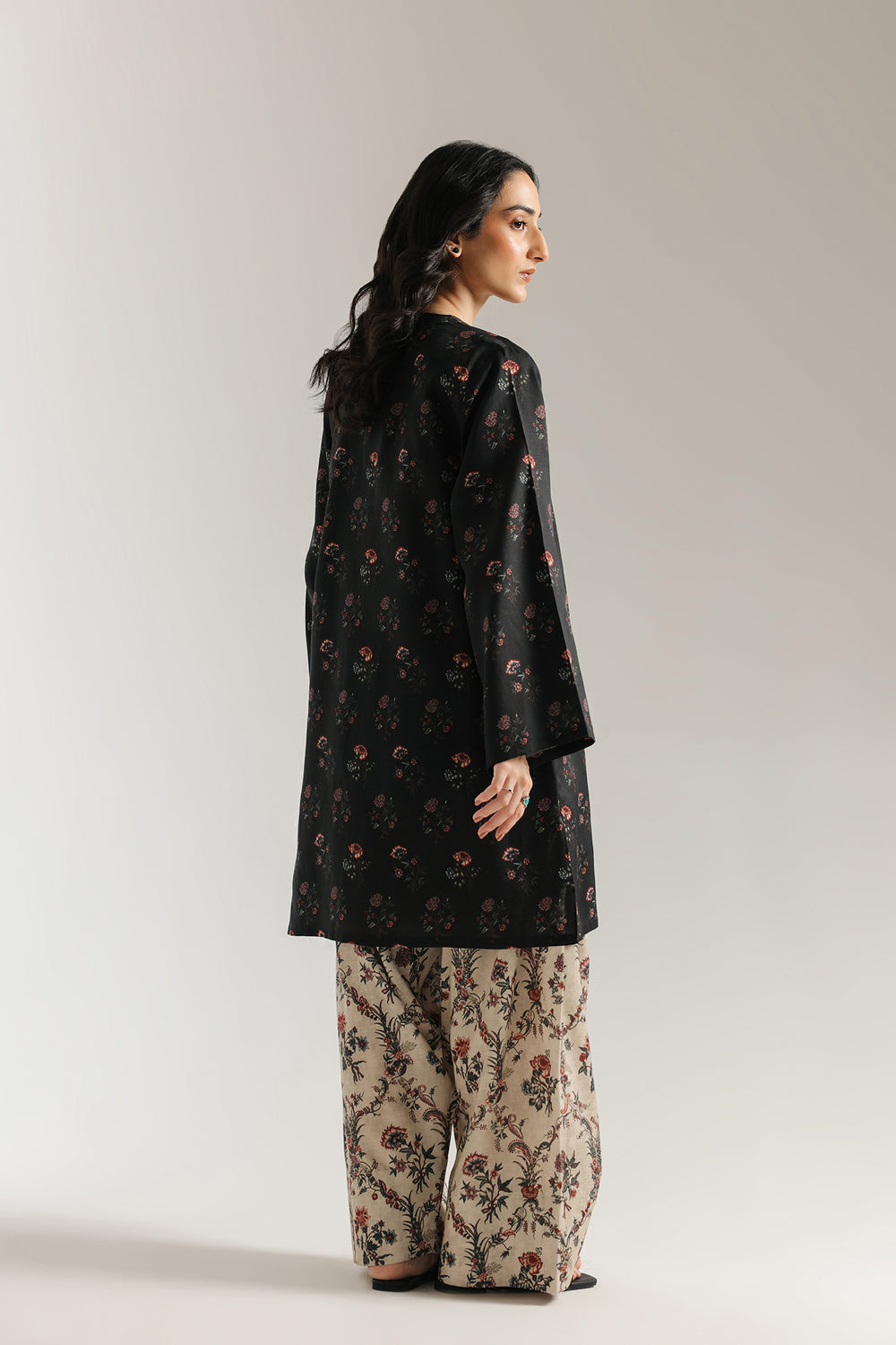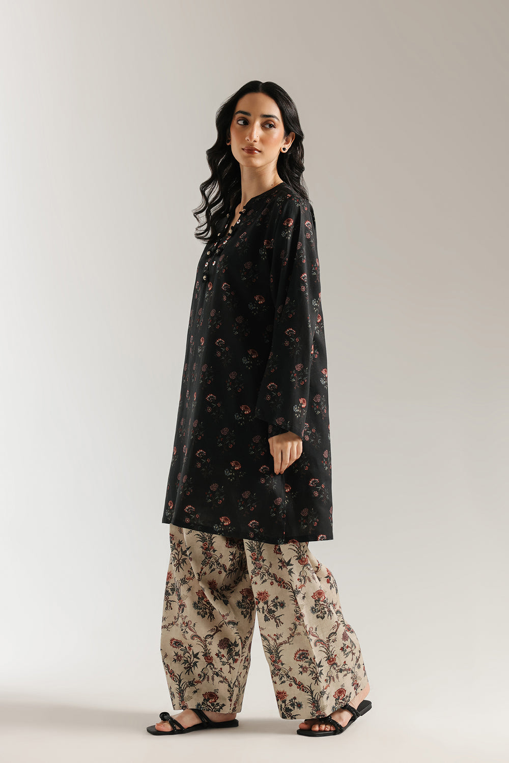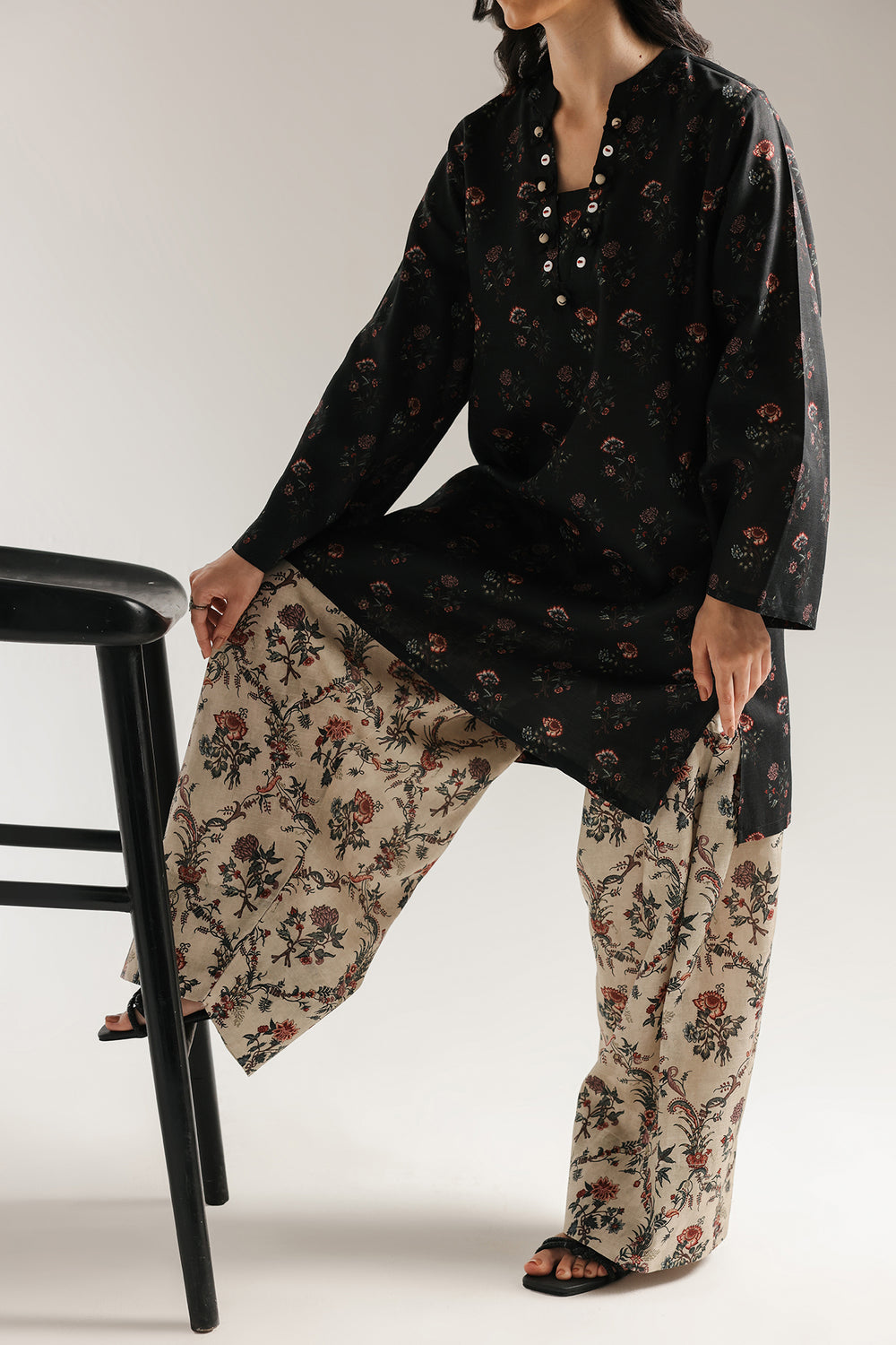 Embrace the beauty of contrast and color with this artfully designed suit. The black kurta is a stunning canvas for a vibrant floral print in shades of pink, orange, and green, while a neckline adorned with buttons adds a touch of classic detail. This shirt is perfectly balanced by wide-leg shalwar in a lighter tone, featuring a complementary, all-over floral pattern. This unique ensemble offers a sophisticated and stylish look that stands out with its harmonious blend of prints and color.