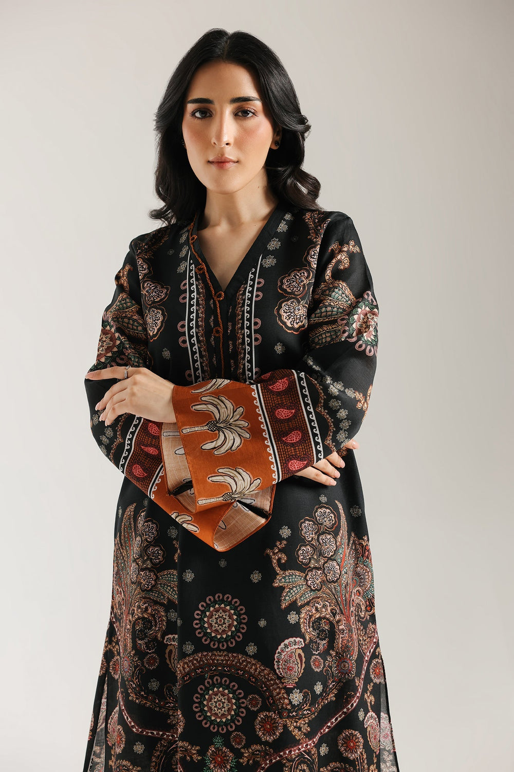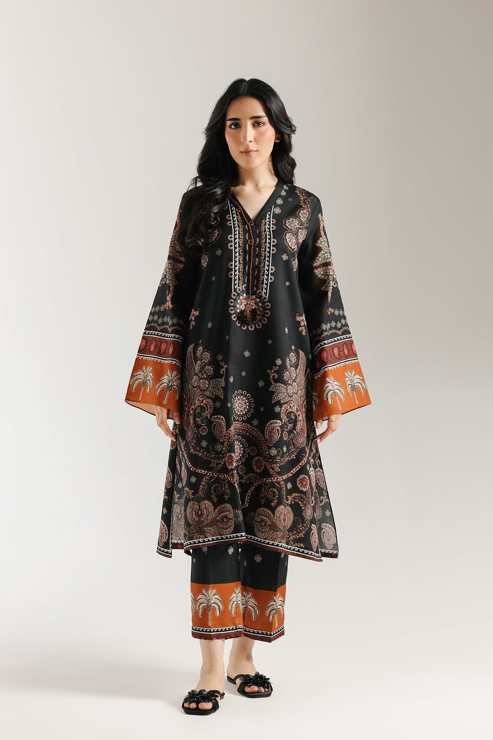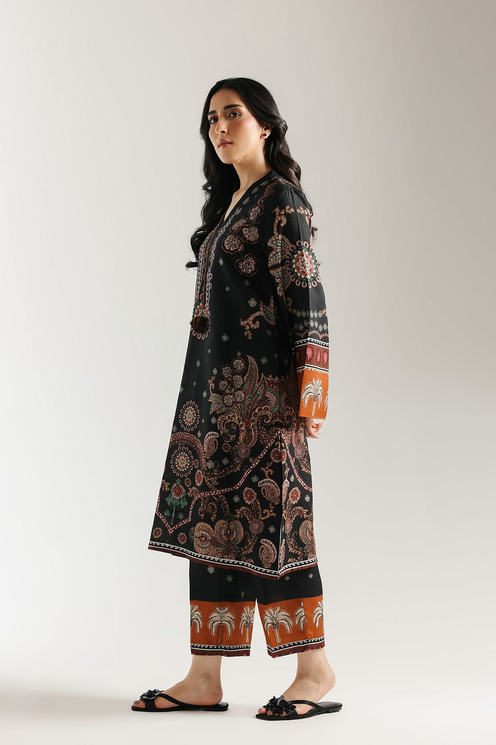 Escape into a world of artistic design. This captivating printed suit features a black base with a beautifully detailed paisley and ornamental print in warm terracotta and orange tones. The long, relaxed-fit shirt has a flattering A-line cut, complemented by wide sleeves that are also adorned with a border print. Paired with matching straight trousers, this ensemble offers a sophisticated and artistic look that's perfect for making a stylish statement.