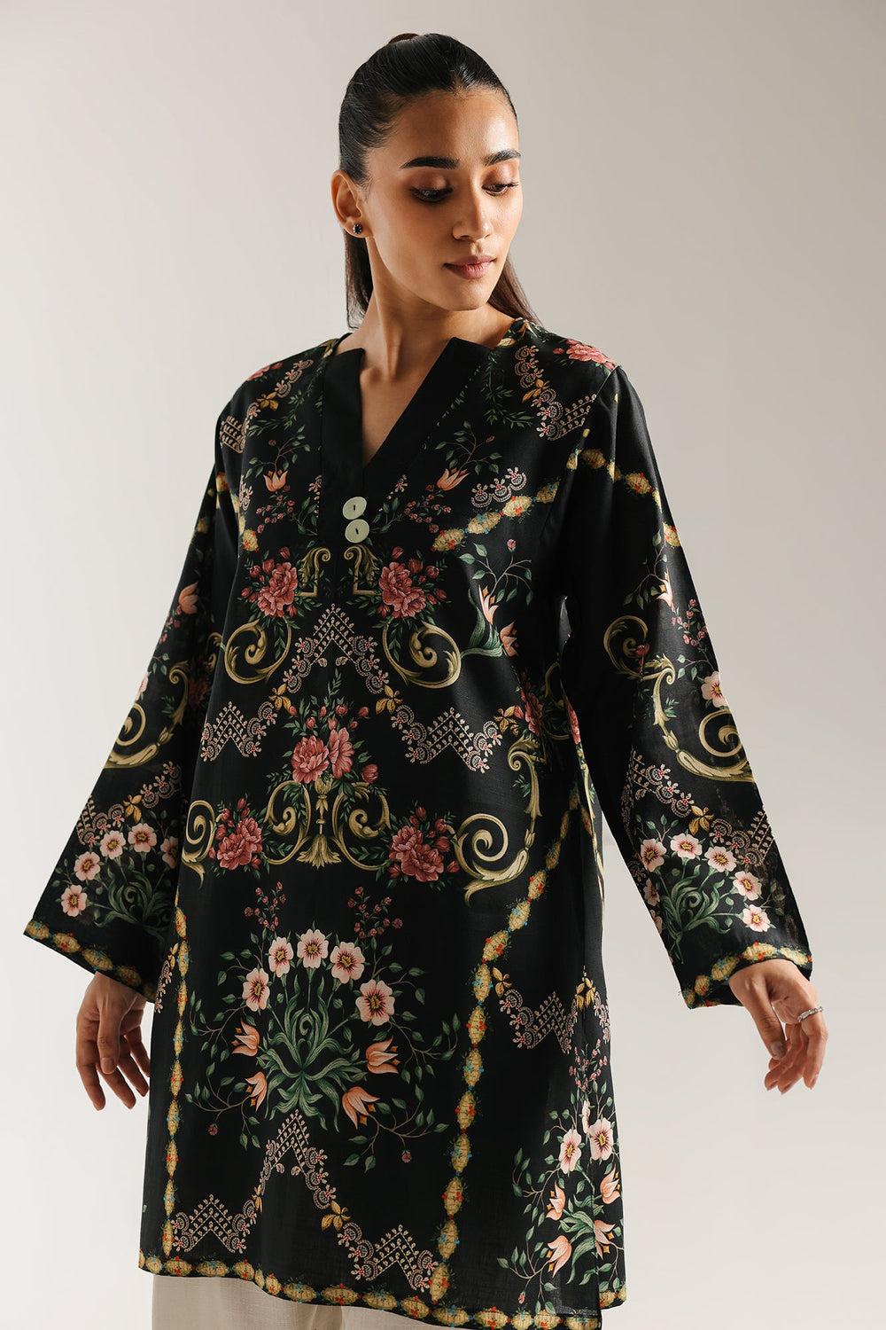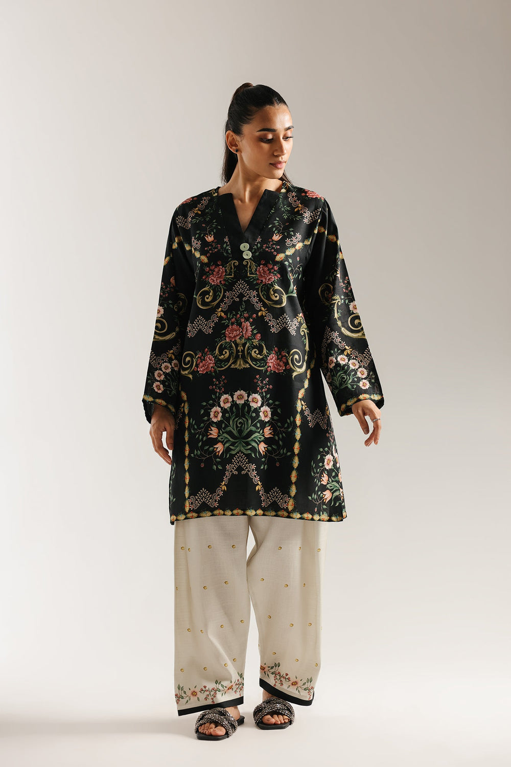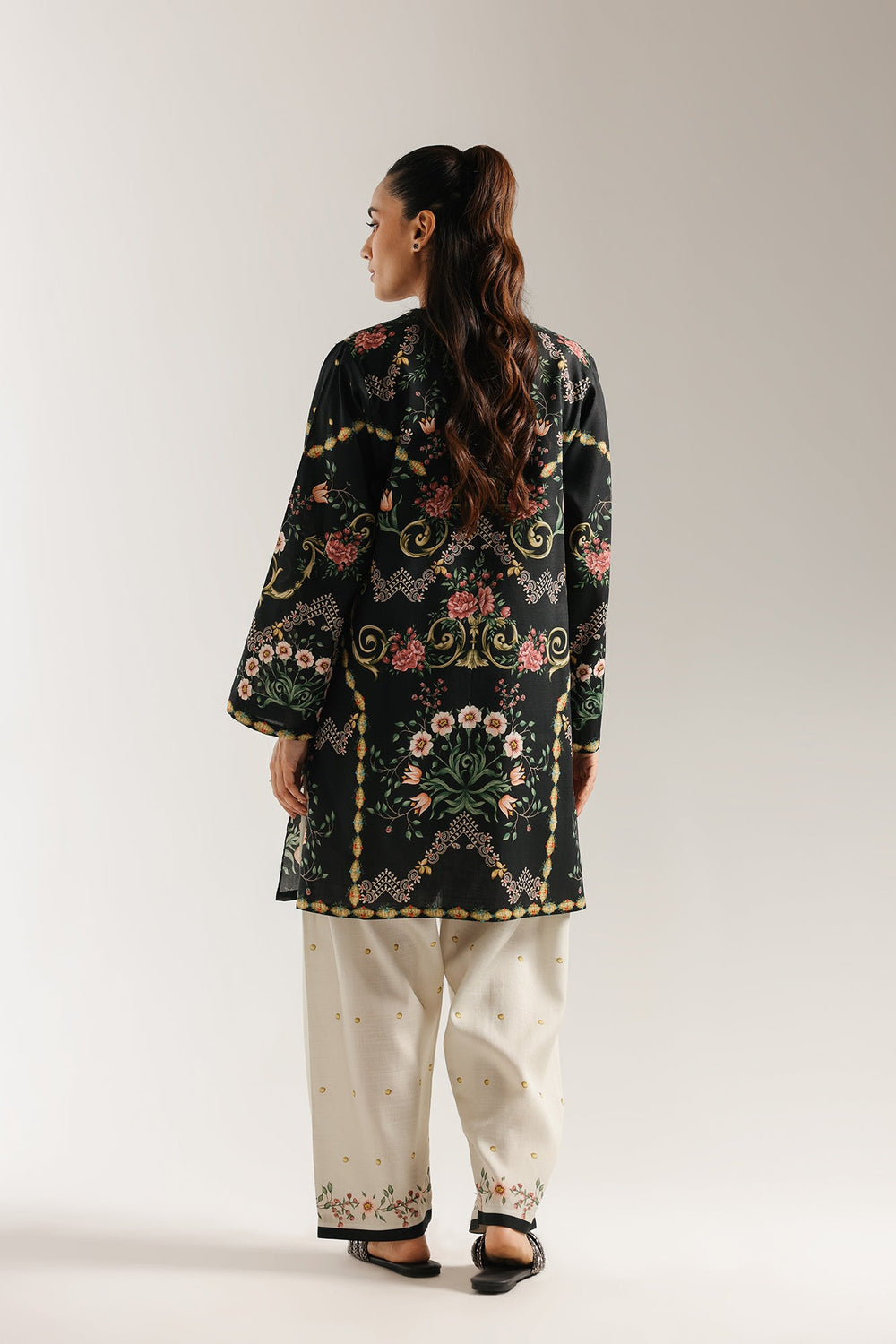 This exquisite printed suit is a celebration of elegant design. The black shirt features a stunning, intricate floral print in a rich palette of pink, green, and golden tones that cascades beautifully down the front. Paired with coordinating off-white shalwar, which is detailed with matching printed border at the hem, this two-piece set offers a perfectly balanced and polished look. A timeless ensemble that is both vibrant and graceful.