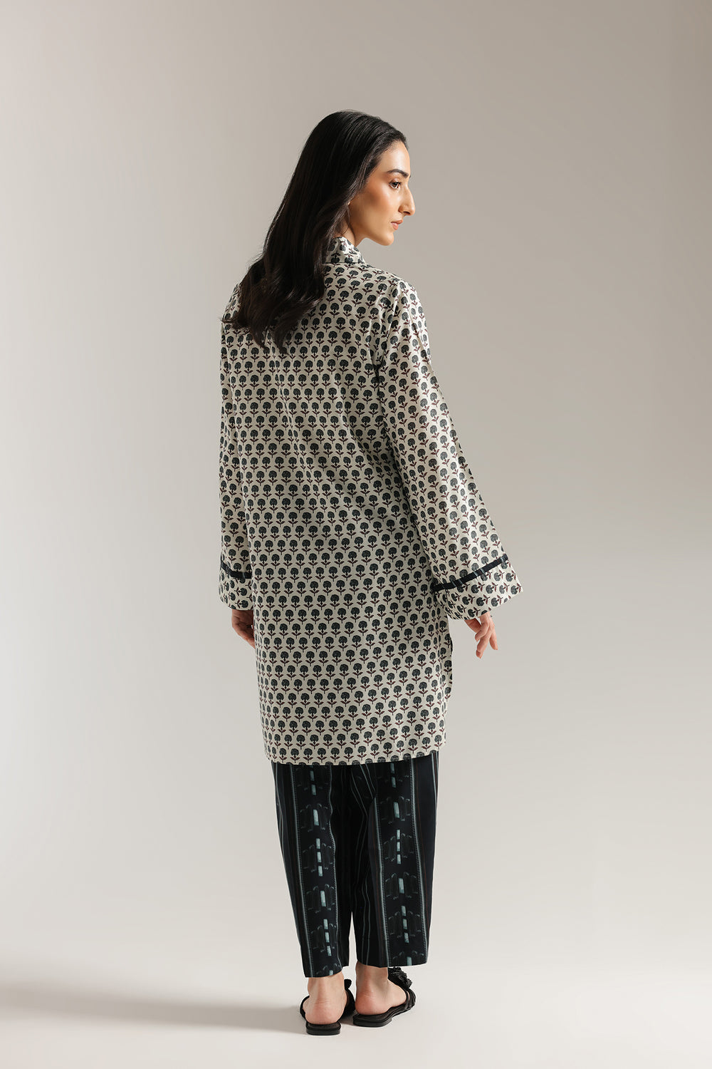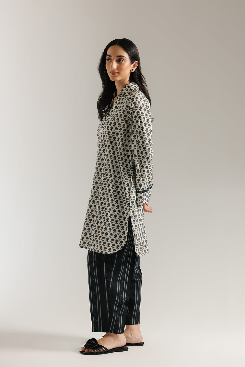 This printed suit features a shirt designed with an A-line fit, collar neck, flared sleeves, and a round hem for a flattering silhouette and comfortable movement. The matching trouser offers a slouchy fit and regular length, combining style with ease for a versatile, sophisticated look suitable for various occasions.