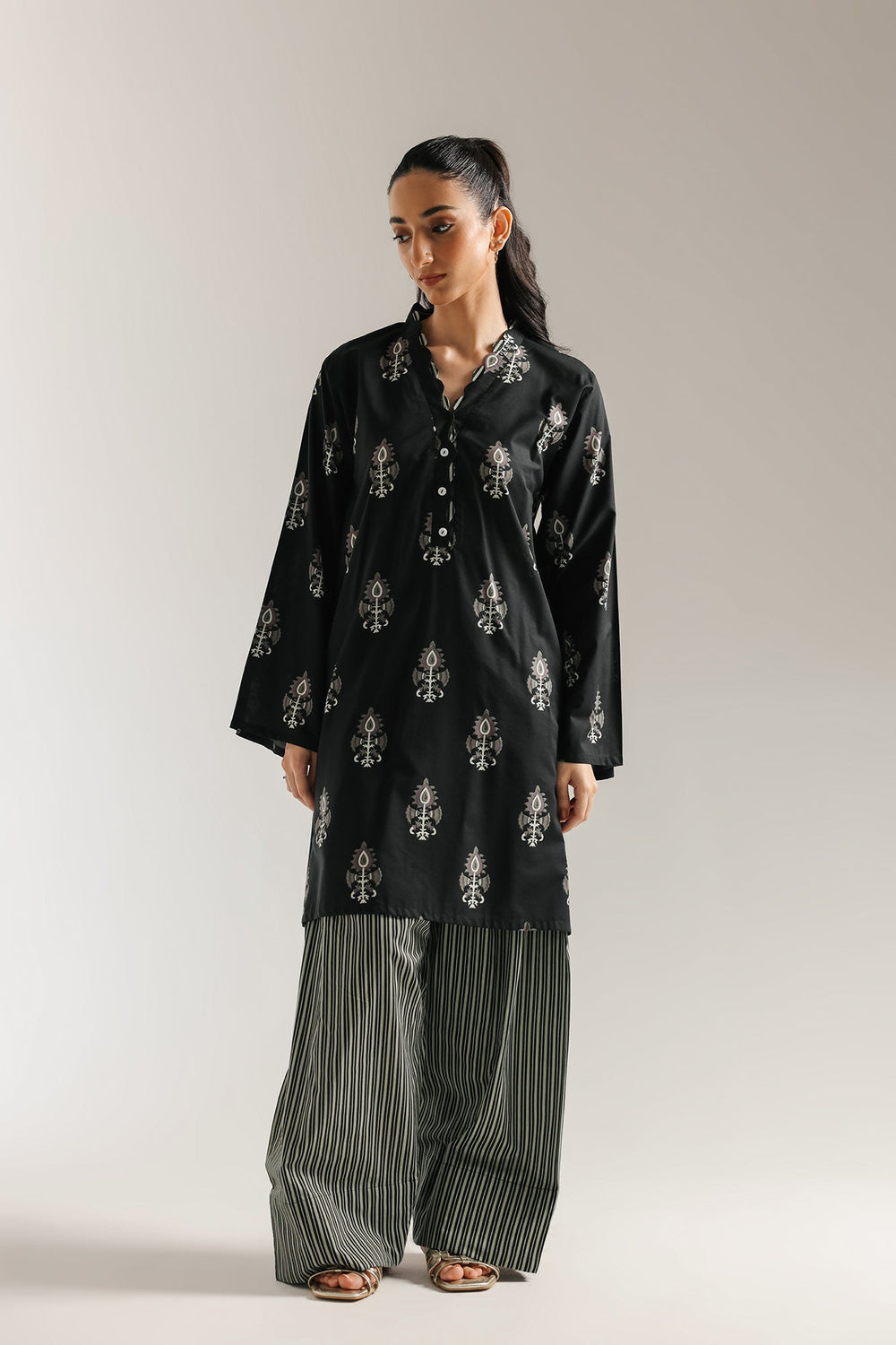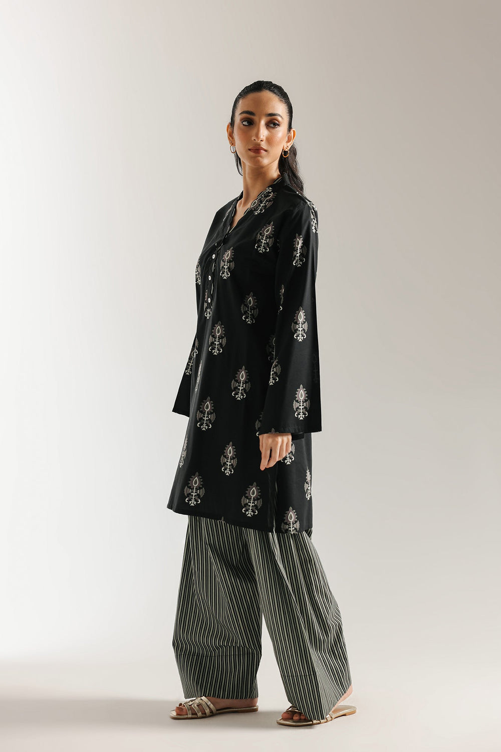 A study in sophisticated elegance, this suit is a mesmerizing fusion of patterns. The black kurti features an intricate, all-over ornamental print in a subtle grey, creating a look that is both delicate and bold. This striking shirt is perfectly balanced by a farshi shalwar, which feature a daring, vertical striped pattern that adds a modern edge. The harmony of these contrasting designs makes for a truly captivating and unique ensemble.