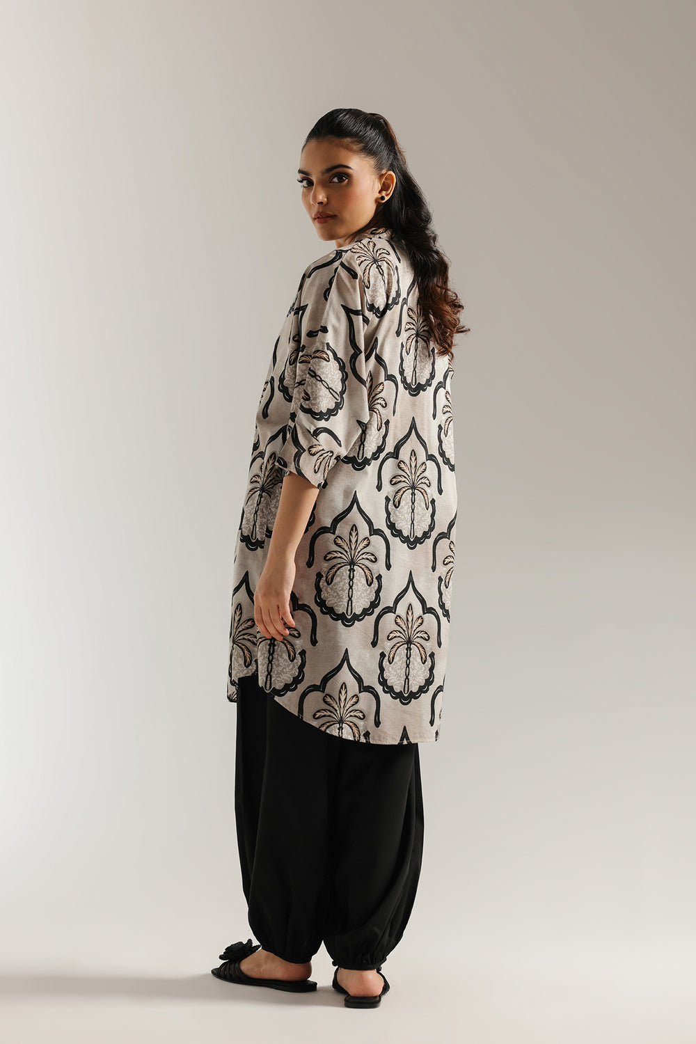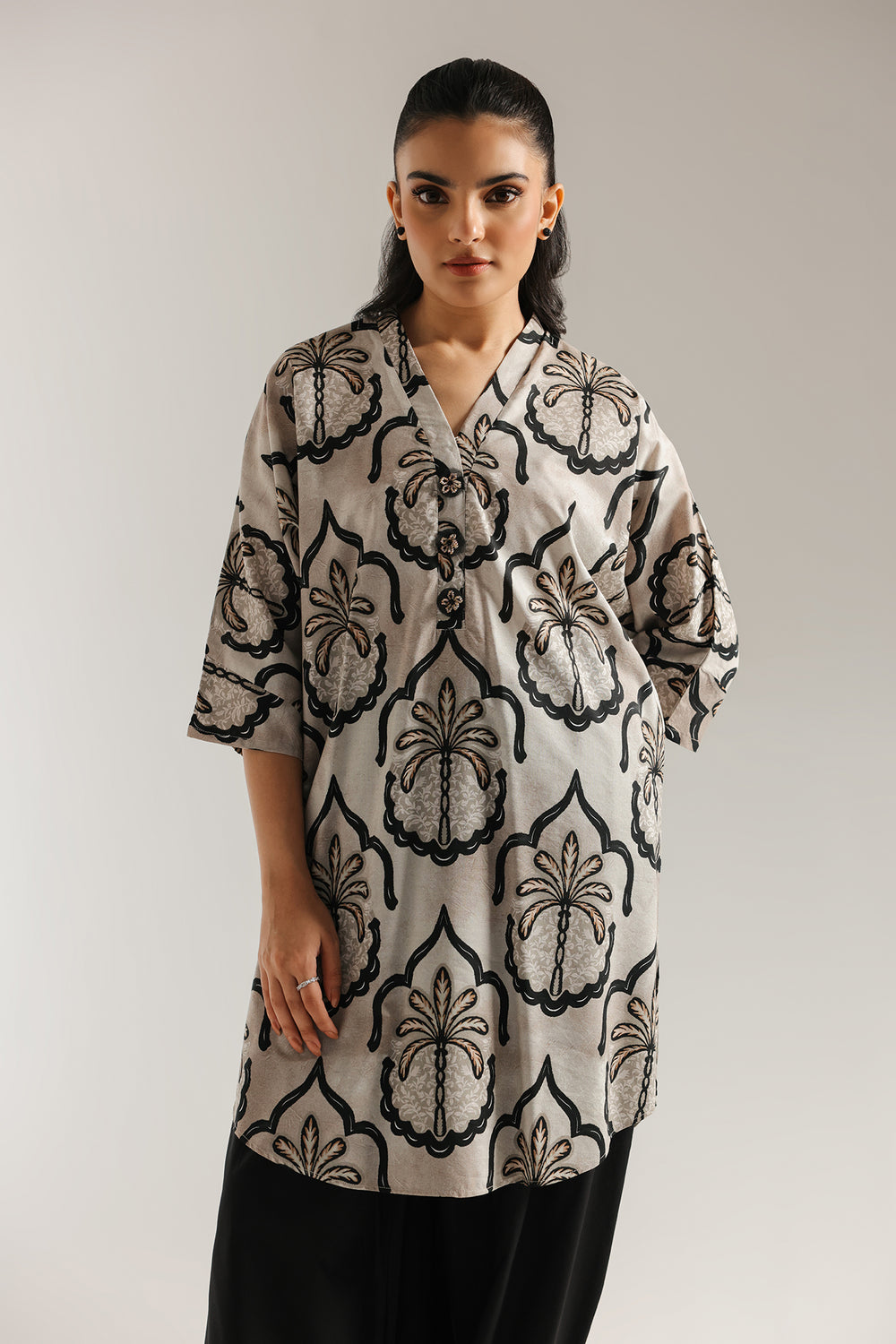 This stunning printed suit features a unique, eye-catching design. The light-colored tunic is adorned with a bold, dark print reminiscent of stylized palm fronds and architectural arches. The V-neckline and three-quarter length sleeves offer a relaxed, comfortable fit. The tunic is paired with wide-legged, black shalwar creating a modern and sophisticated look perfect for both casual gatherings. The intricate pattern and flowing silhouette make this outfit a versatile and stylish addition to any wardrobe.