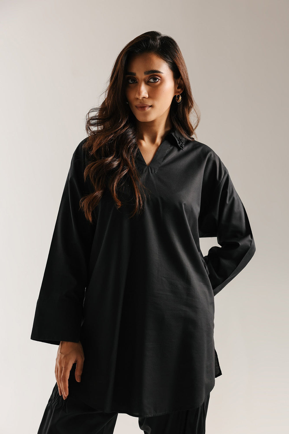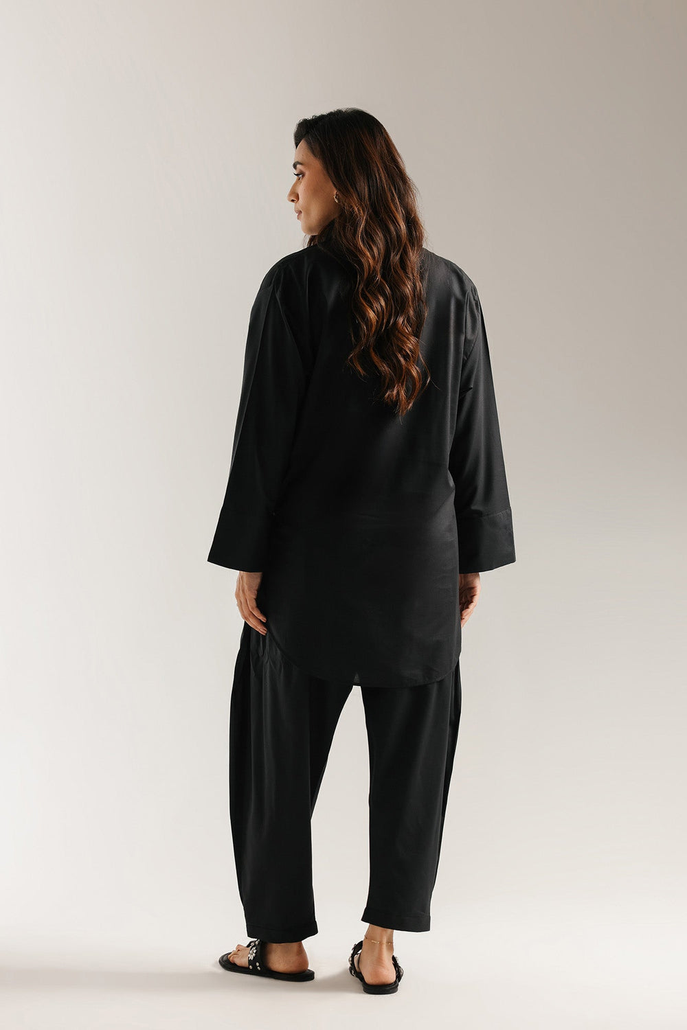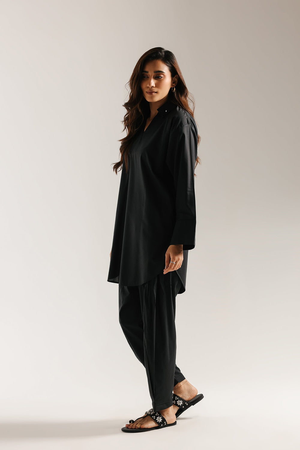 This timeless solid suit is the epitome of effortless sophistication. The classic black kurta features a clean, simple V-neckline and a comfortable, relaxed fit. Paired with coordinating black shalwar, this two-piece ensemble offers a graceful silhouette that can be dressed up or down. A versatile and essential addition to any wardrobe, perfect for any occasion where you want to exude classic style.