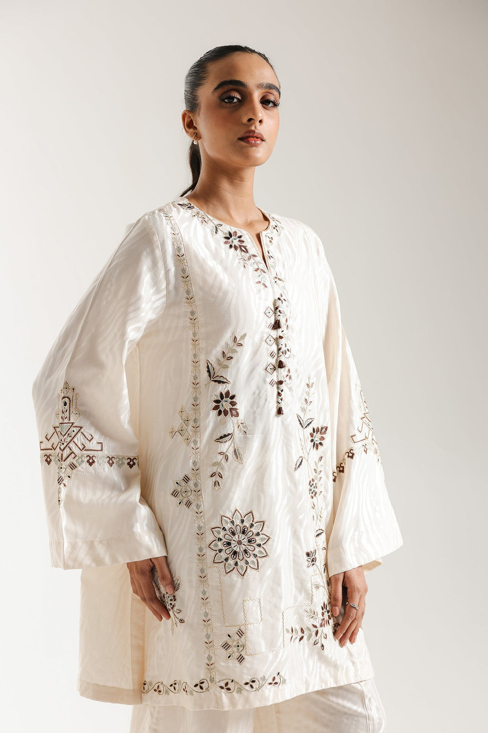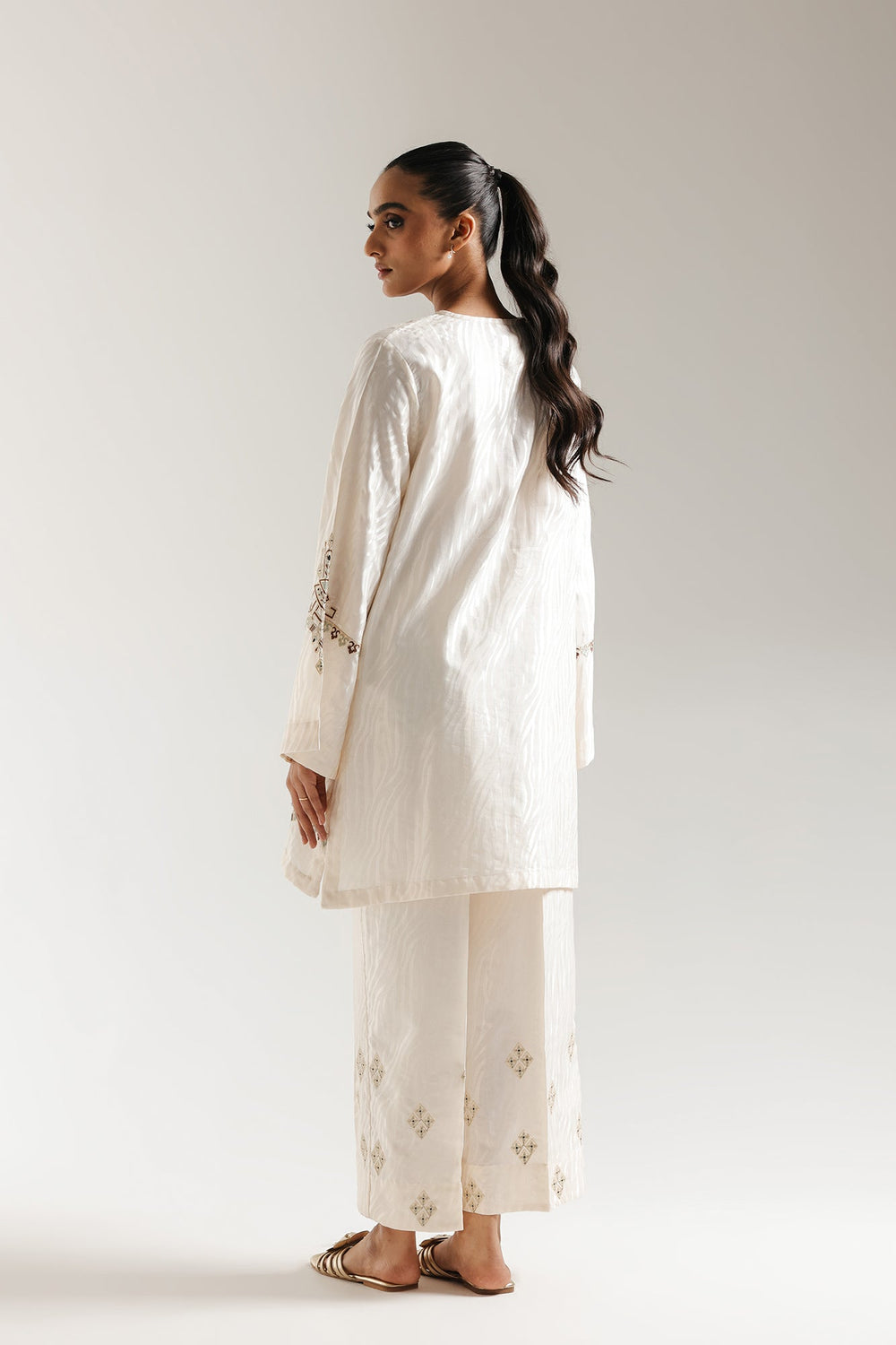 Channel sophisticated artistry in this luminous cream embroidered suit. The relaxed-fit kurti is crafted from an off-white textured fabric and features elegant bronze and gold-toned thread embroidery in scattered floral and geometric motifs across the front and sleeves. This subtle shimmer is complemented by the coordinating culotte fit trouser in the same textured fabric, which is finished with matching bronze embroidery at the hem. This suit is a luxurious and graceful choice for any festive gathering.