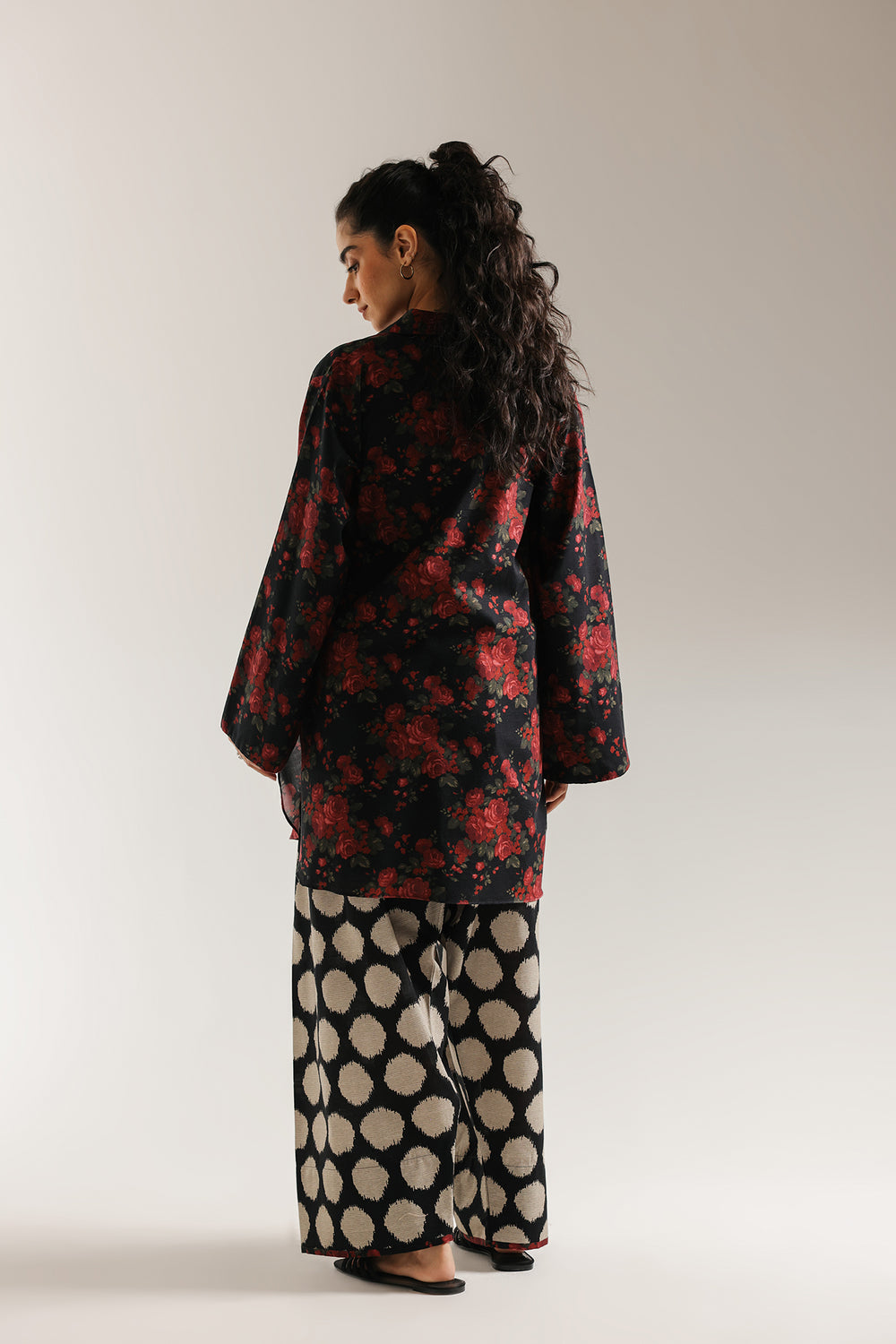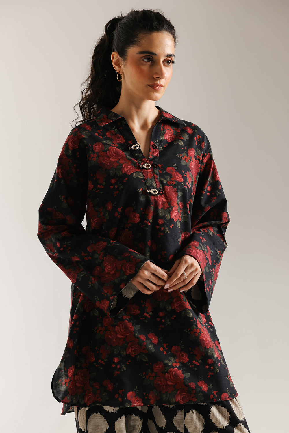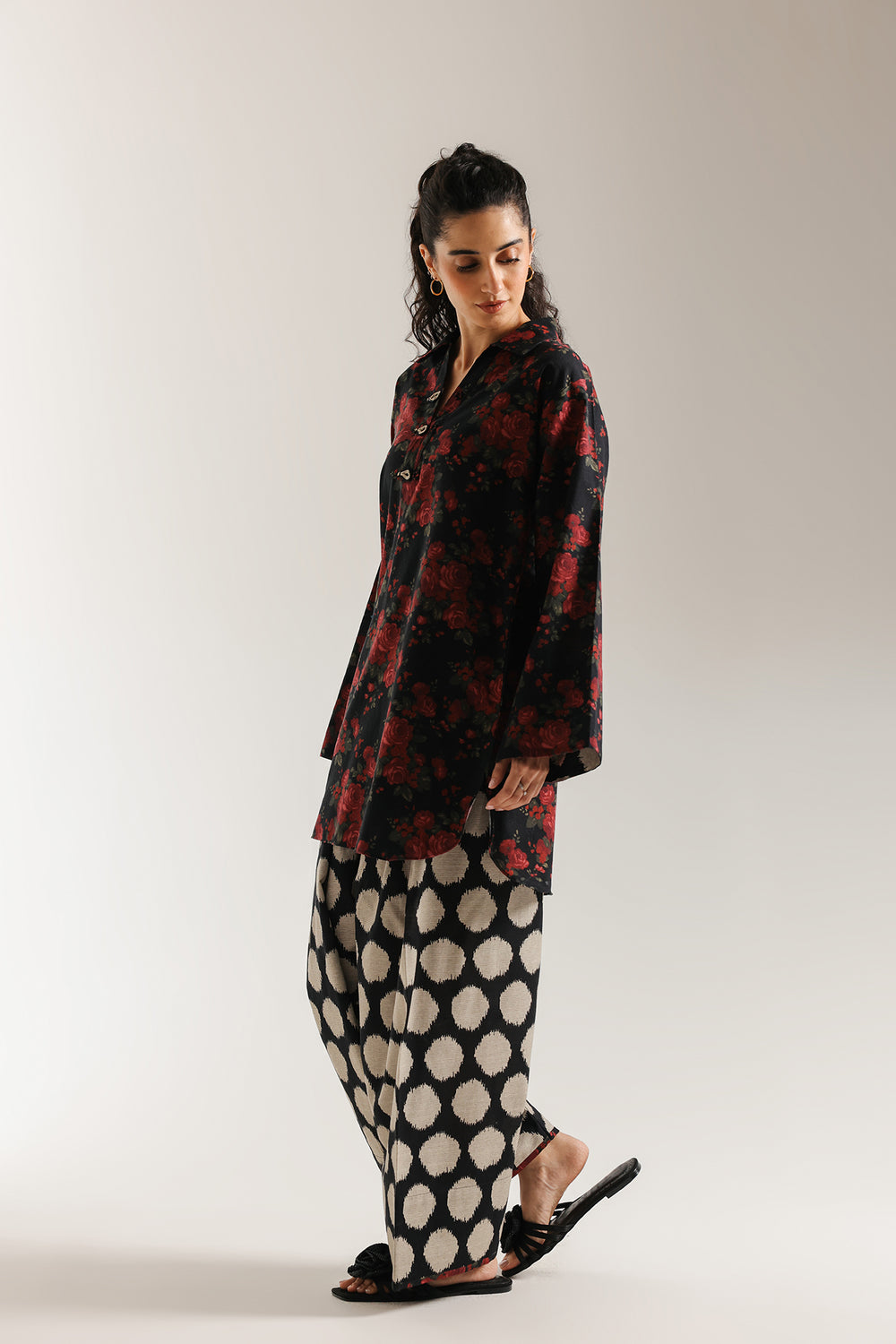 Capture attention with the bold contrast of this dramatic printed suit. The short, relax fit kurta is rendered in a deep black fabric and features an eye-catching all-over print of large, lush red roses and green foliage. The shirt has a classic collar with a subtle V-slit, accented by decorative buttons. The ensemble is completed by coordinating wide-leg shalwar featuring a bold, contrasting Ikat-style circle and dot print in black and a soft beige hue. This combination delivers a comfortable, modern, and high-impact look.