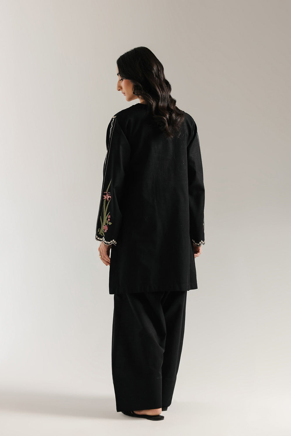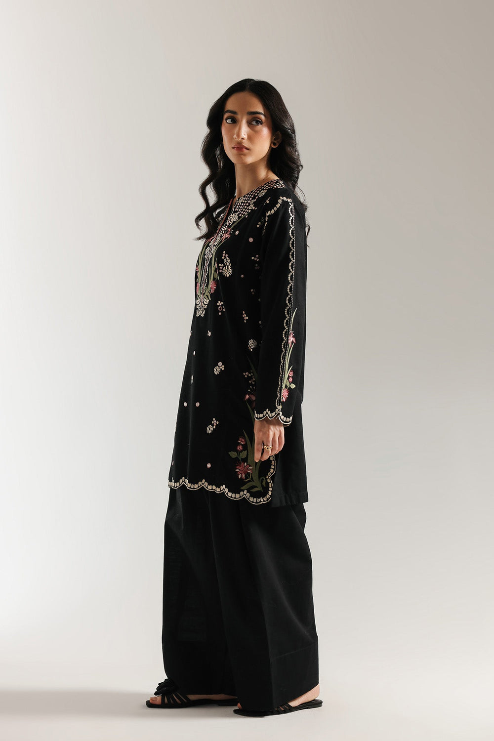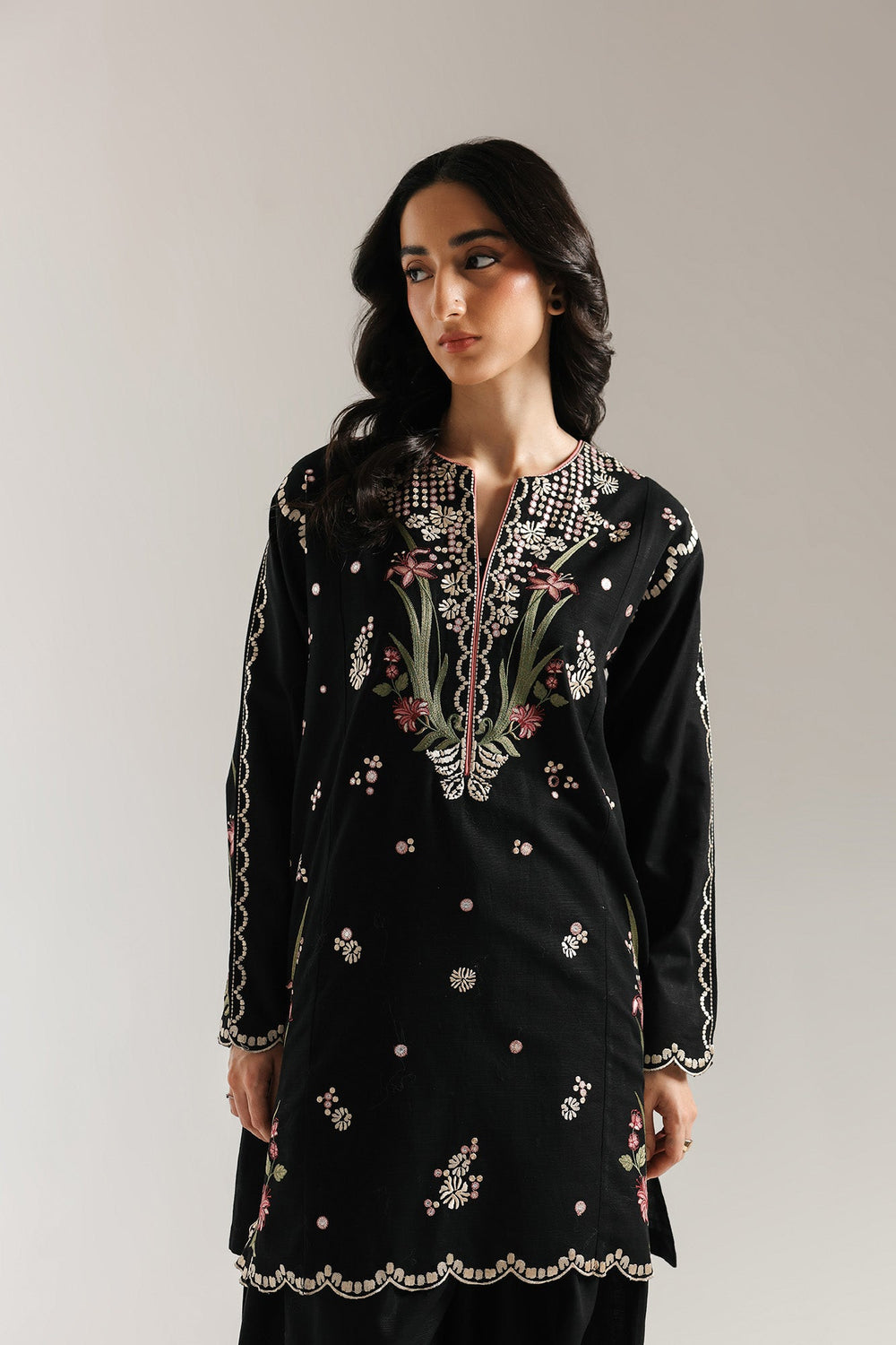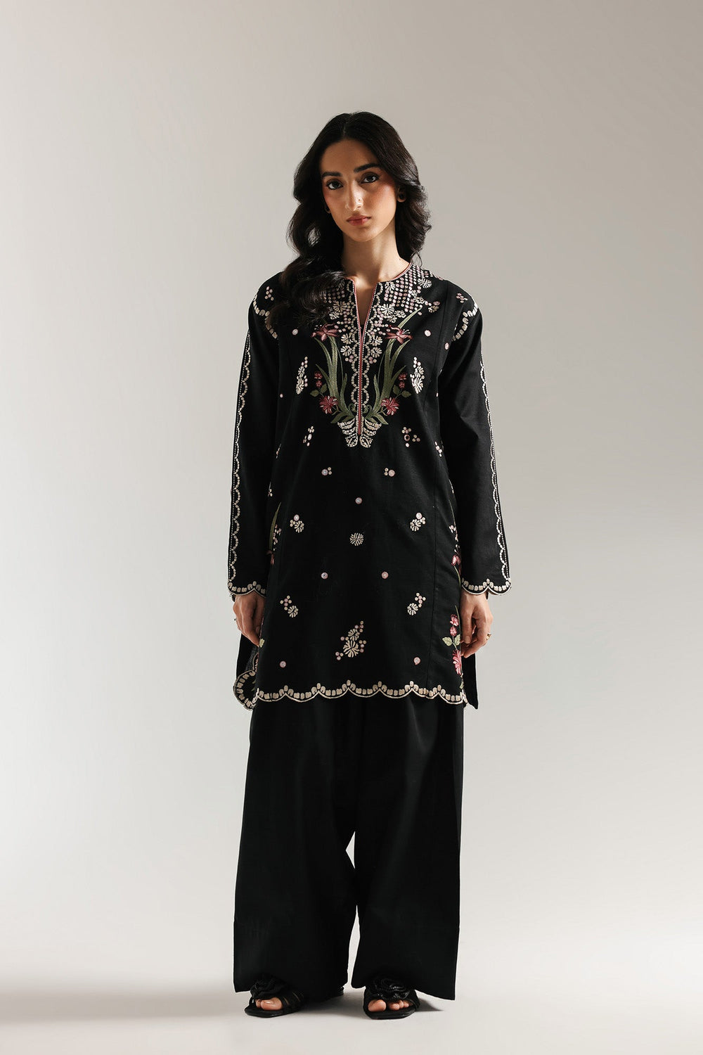 Unleash the magic of the night with this enchanting embroidered suit. This two-piece ensemble is a true masterpiece of intricate design. The rich black base of the shirt serves as a dramatic canvas for the beautiful floral embroidery in shades of pink, green, and white. The elaborate, stylized patterns on the neckline, sleeves, and hem create a captivating design that celebrates traditional craftsmanship. The suit is completed with matching shalwar, making it an ideal choice for any festive occasion or formal gathering.
