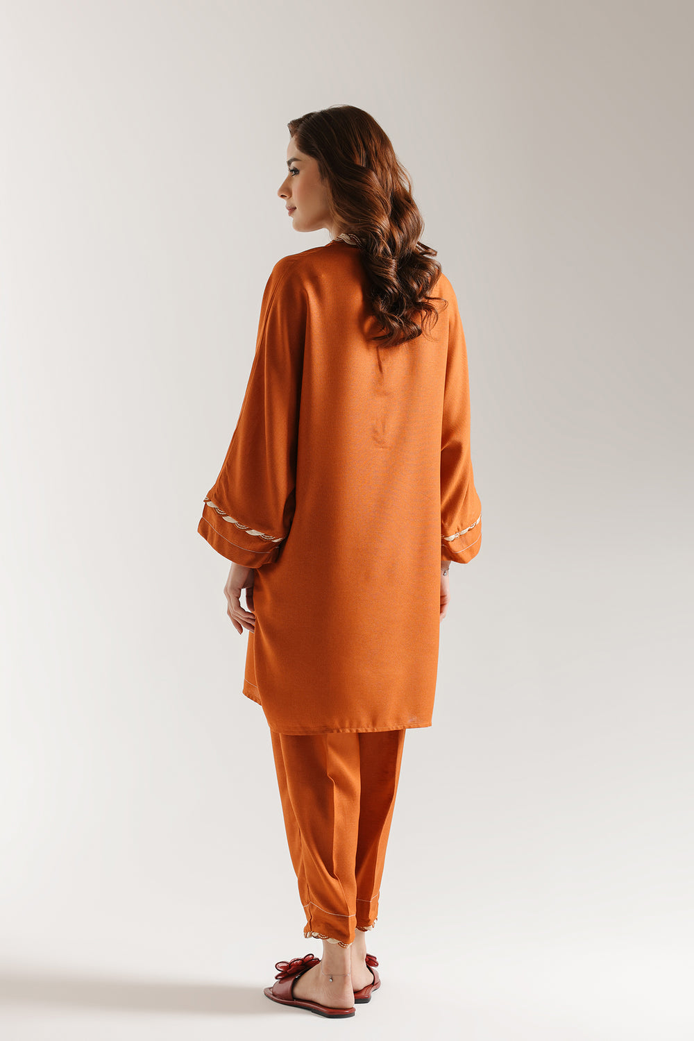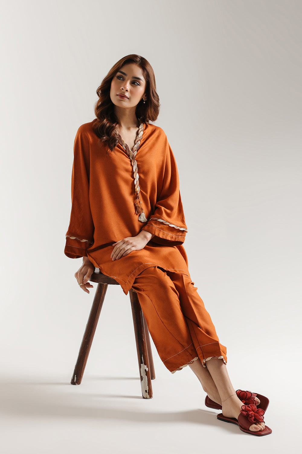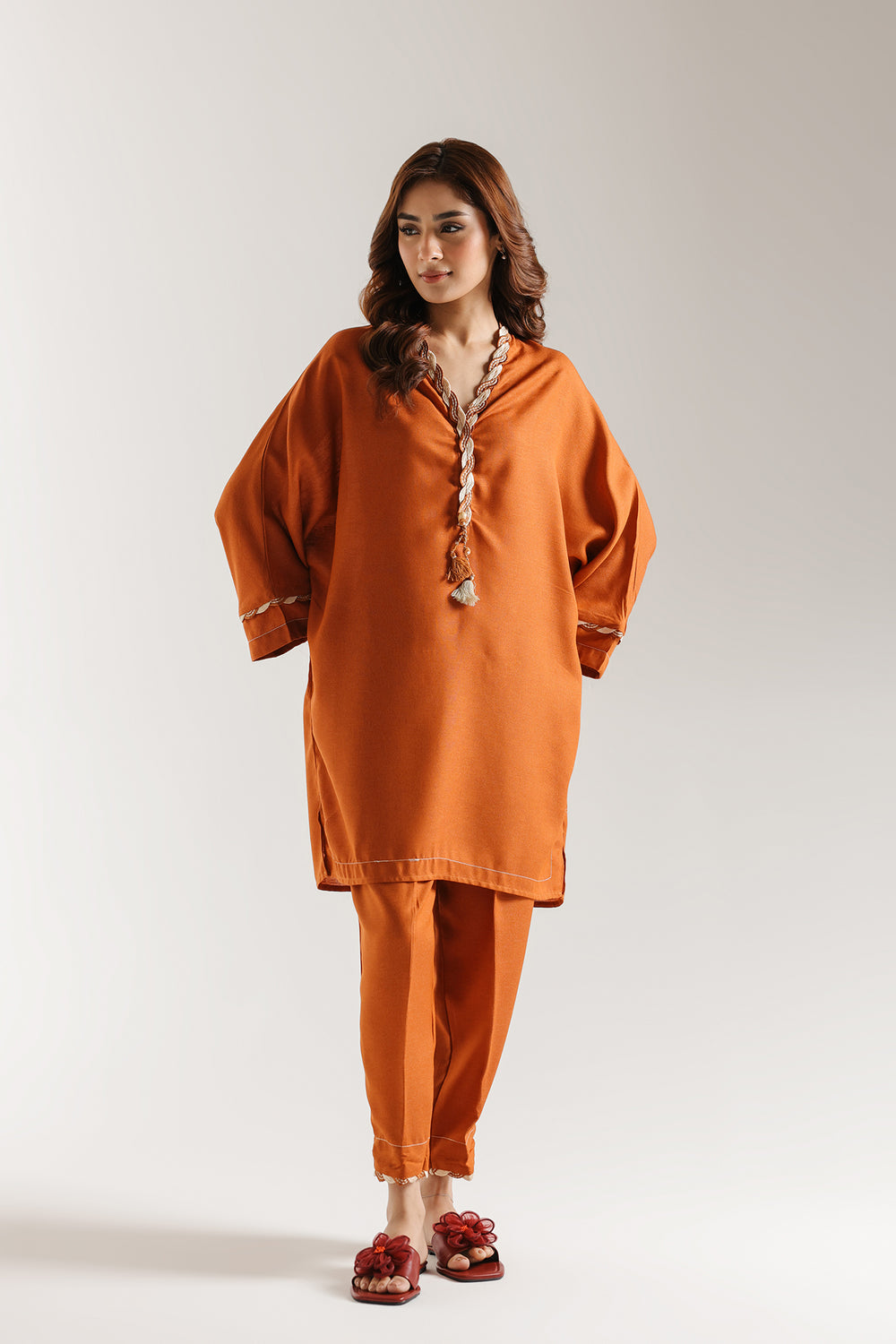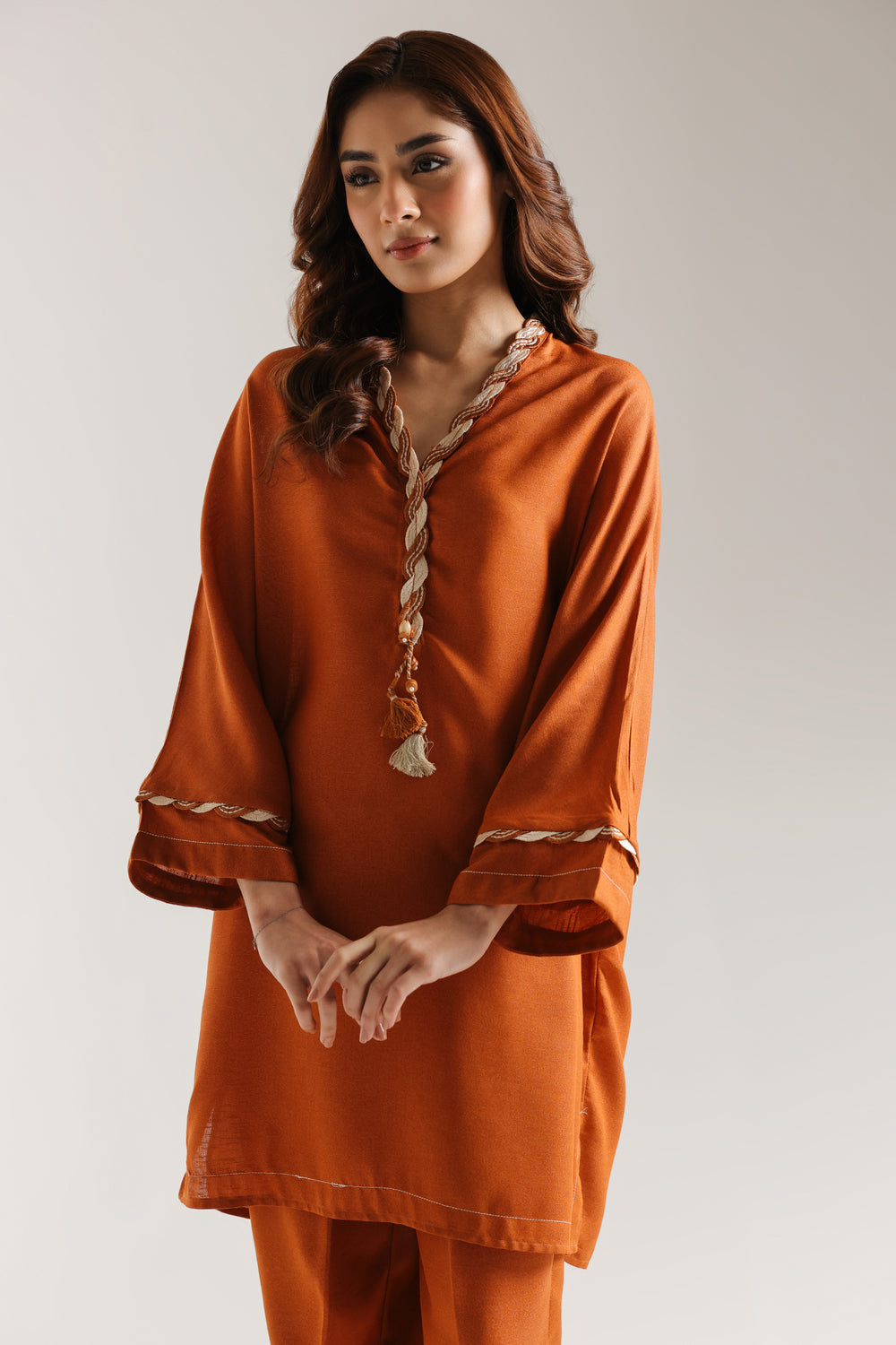This refined solid ensemble combines timeless sophistication with contemporary comfort. The short-length kurti showcases a striking orange base elevated by twisted, braided white and rust threads at neckline and sleeves, while adding a decorative tassel at the edge. Tailored with a structured loose-fit shirt, the piece balances polished aesthetics with wearability. Paired with a coordinating straight trouser, this monotone suit delivers understated elegance through meticulous craftsmanship and thoughtful design details that transcend seasonal trends.