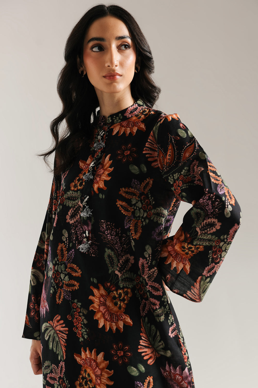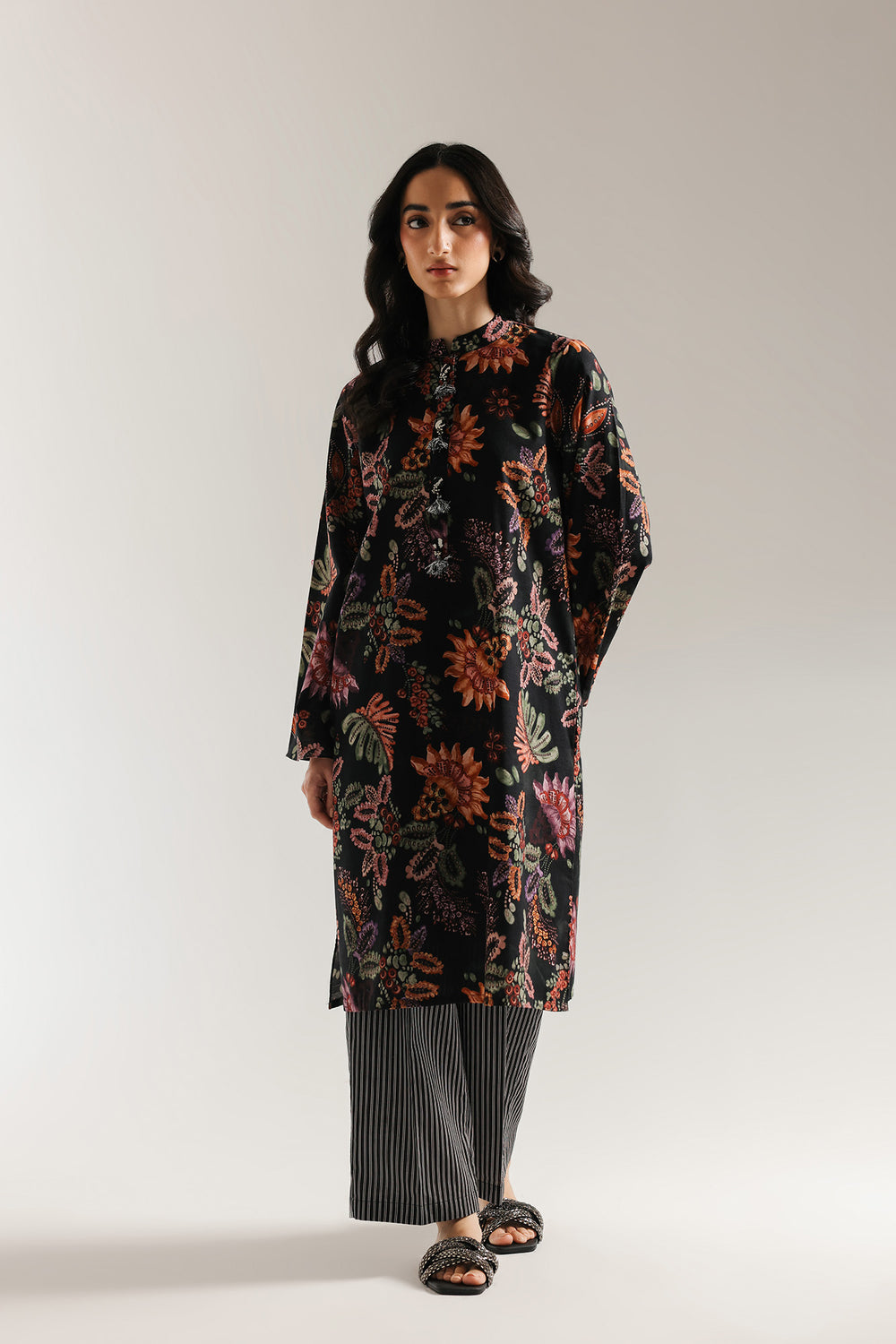 Embrace a modern look with this stunning printed suit. This two-piece ensemble is a masterpiece of intricate design. The rich black base of the long shirt serves as a dramatic canvas for the beautiful, multi-colored floral and vine print in shades of pink, orange, green, and white. The suit is completed with contrasting striped trousers, making it an ideal choice for any festive occasion or formal gathering.