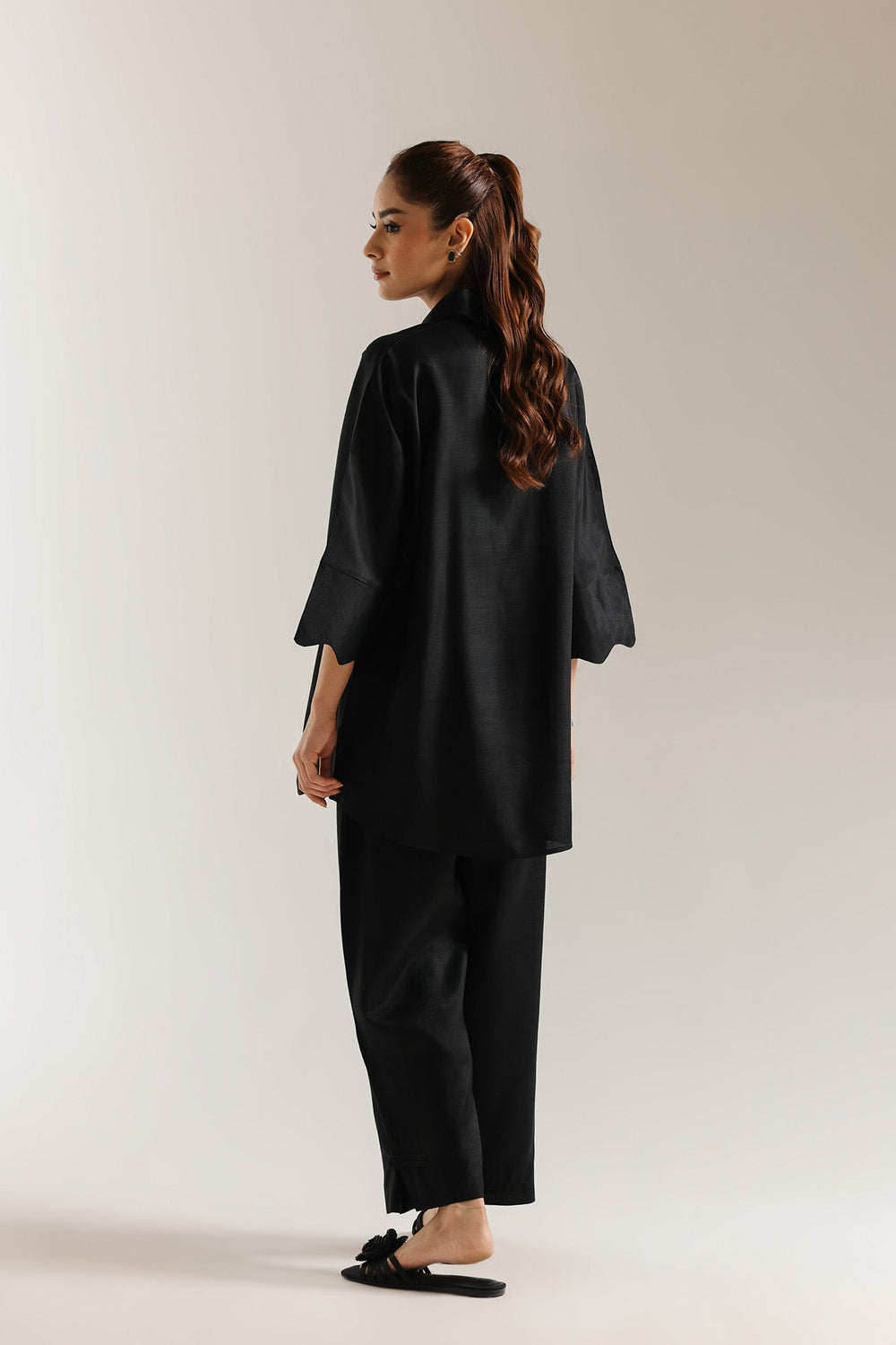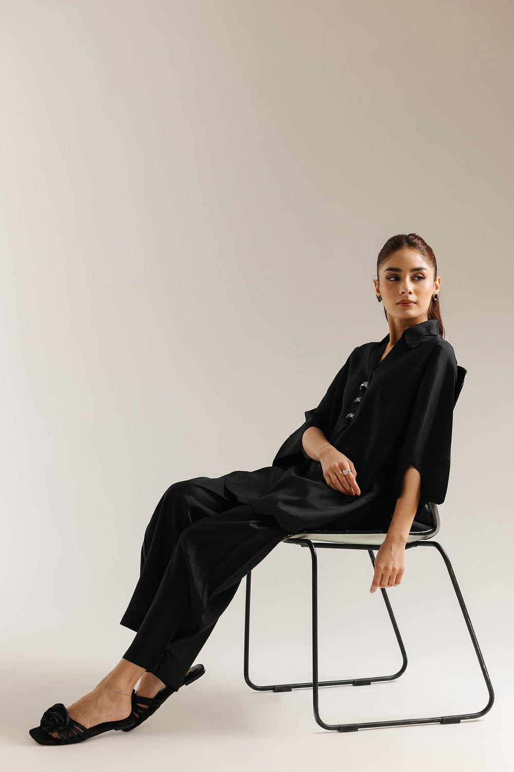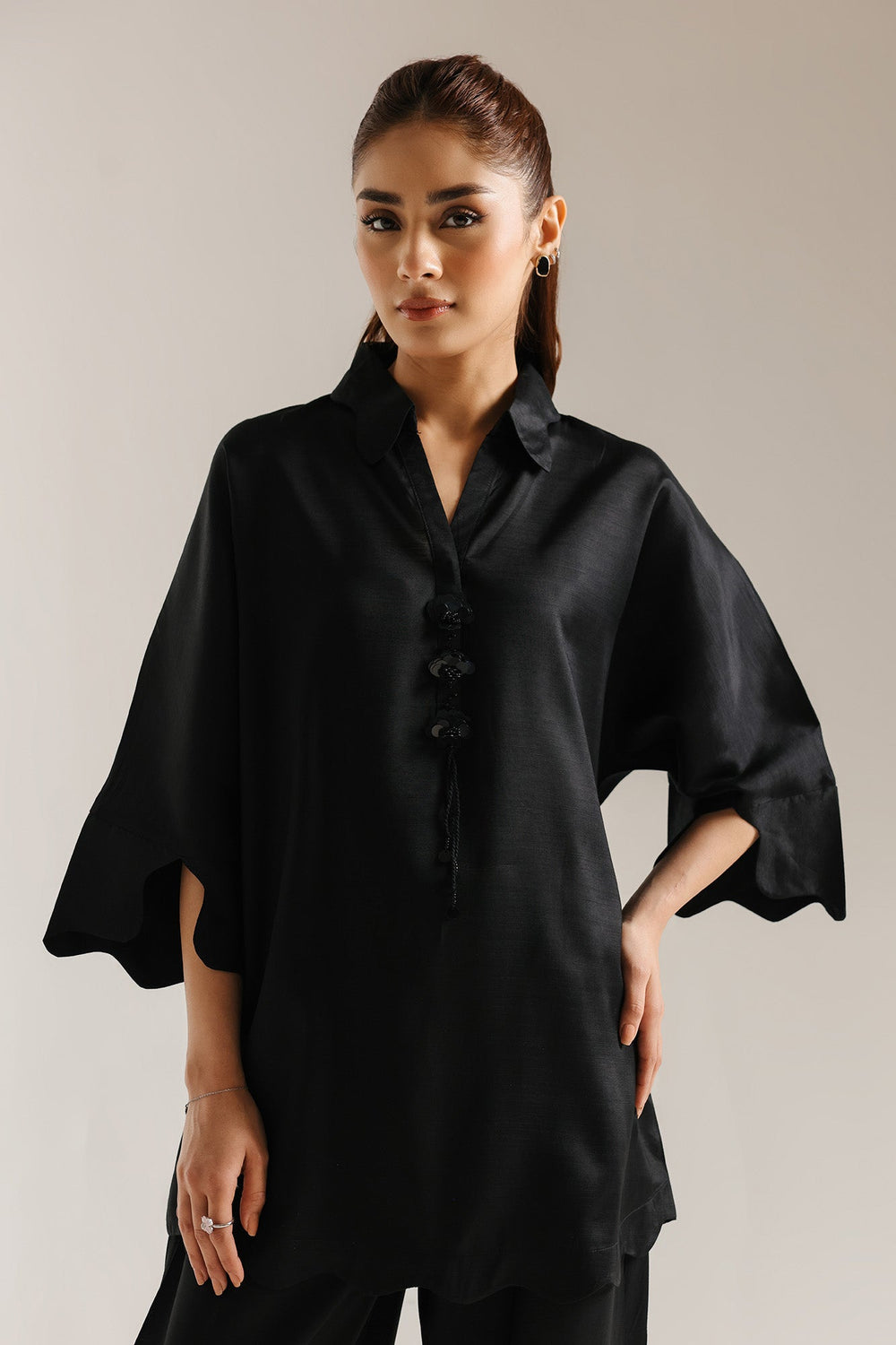 A stylish black shirt crafted from a smooth, slightly glossy fabric. It has a relaxed, loose-fit cut with wide, flared sleeves that fall to the elbows, giving it a contemporary and airy look. The neckline is a soft V-shape with a collar, and the front is adorned with delicate fabric-covered buttons and subtle tassel detailing, adding a touch of elegance. The hemline is long and slightly curved, offering a flattering and modest finish. The outfit is paired with matching black trousers for a clean, monochrome look.