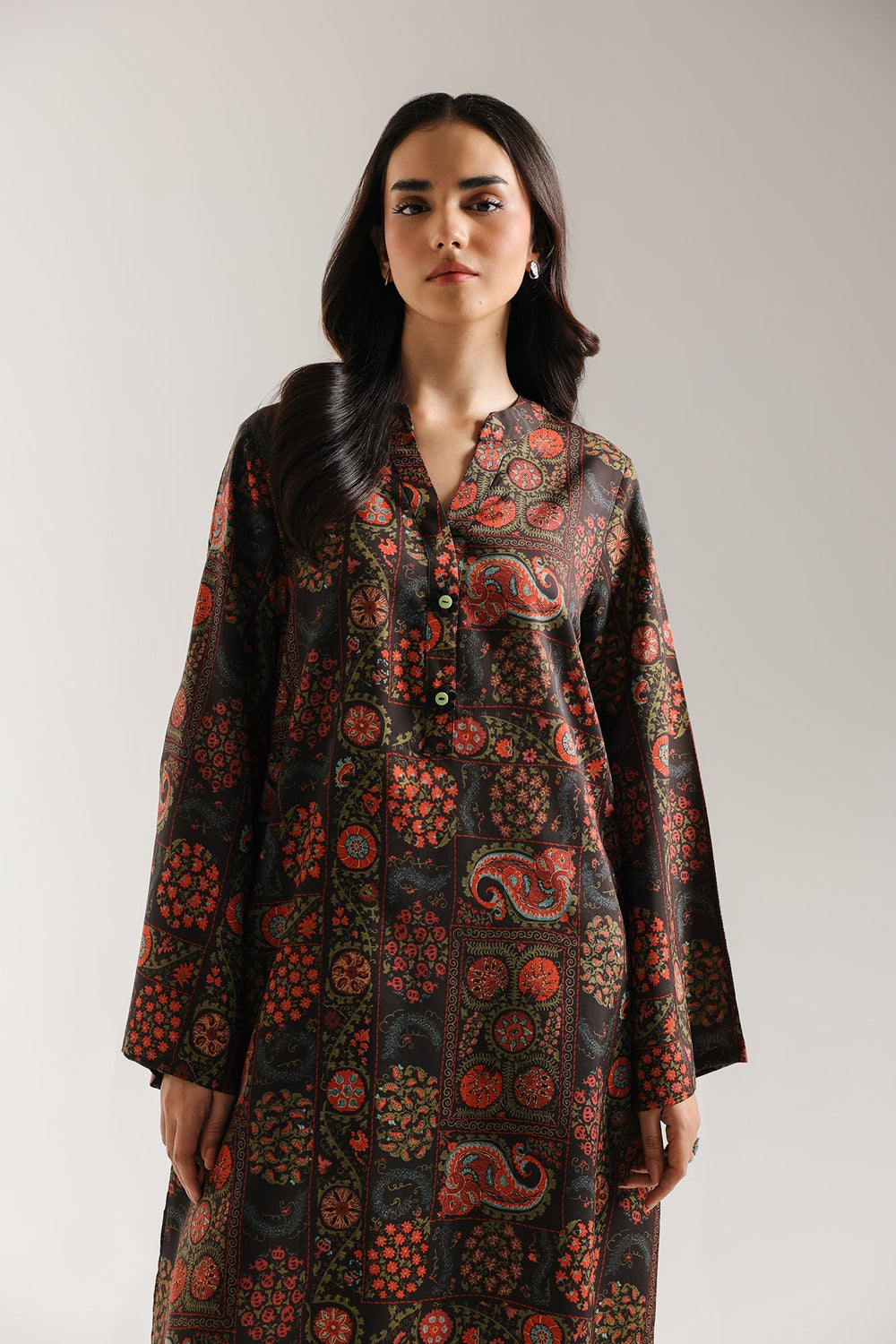Drape yourself in rich, jewel-toned artistry with this stunning printed suit. The ensemble features a shirt in a deep, dark base. The shirt is covered in an ornate, dense all-over print featuring stylized floral and large paisley motifs in vibrant shades of deep red, rust, orange, and gold. It has a flattering slit with a band collar and comfortable, wide sleeves. The suit is paired with contrasting printed wide-leg trouser featuring a smaller, repeating pattern in black and white. This sophisticated set is a perfect choice for making a striking, maximalist statement.