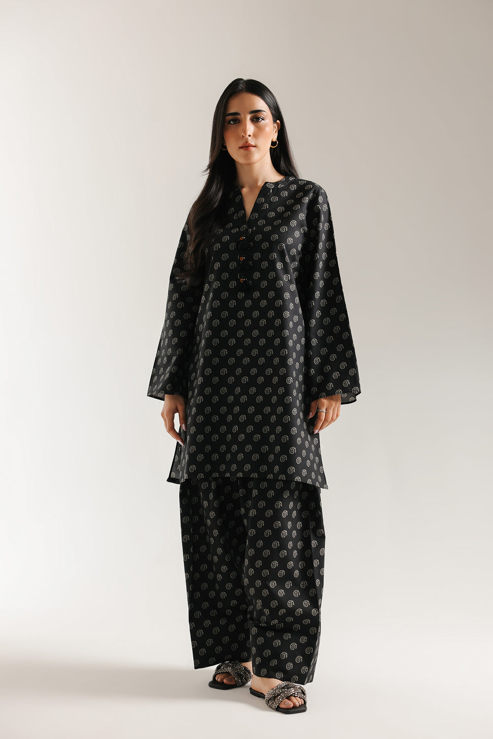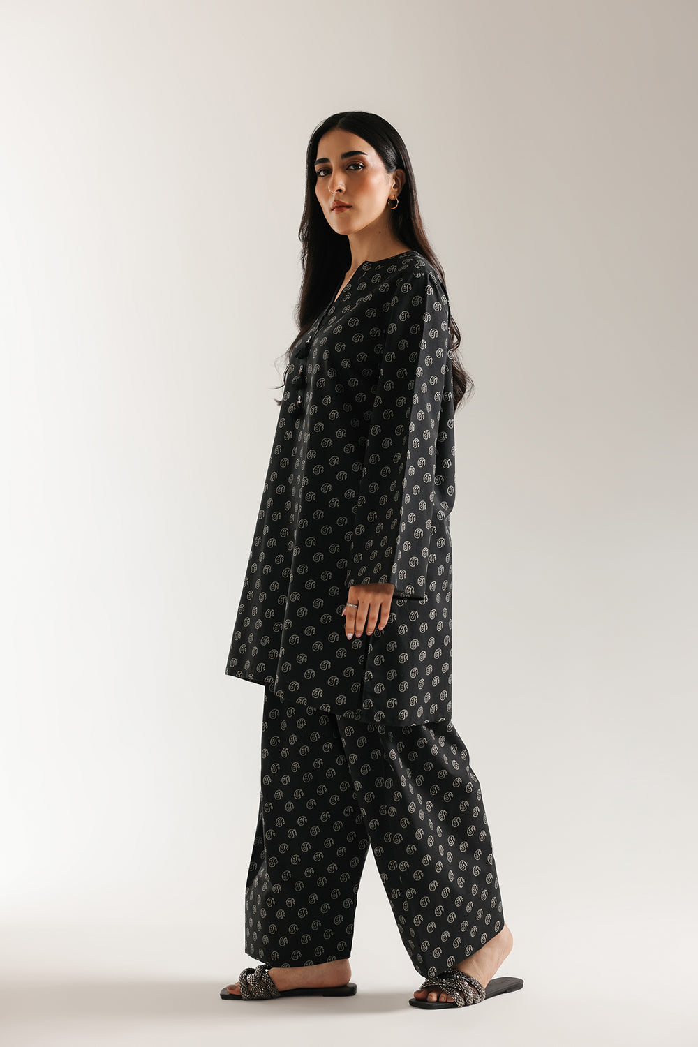 Channel effortless cool in this striking black printed suit. This matching two-piece ensemble is rendered in a deep black fabric and features a sophisticated all-over, seamless paisley print in a subtle light grey tone. The short, relax fit kurta has a clean silhouette with a V-slit neckline and subtle button detailing. The suit is completed by coordinating loose fit shalwar in the exact same print, creating a cohesive, comfortable, and boldly graphic monotone look.