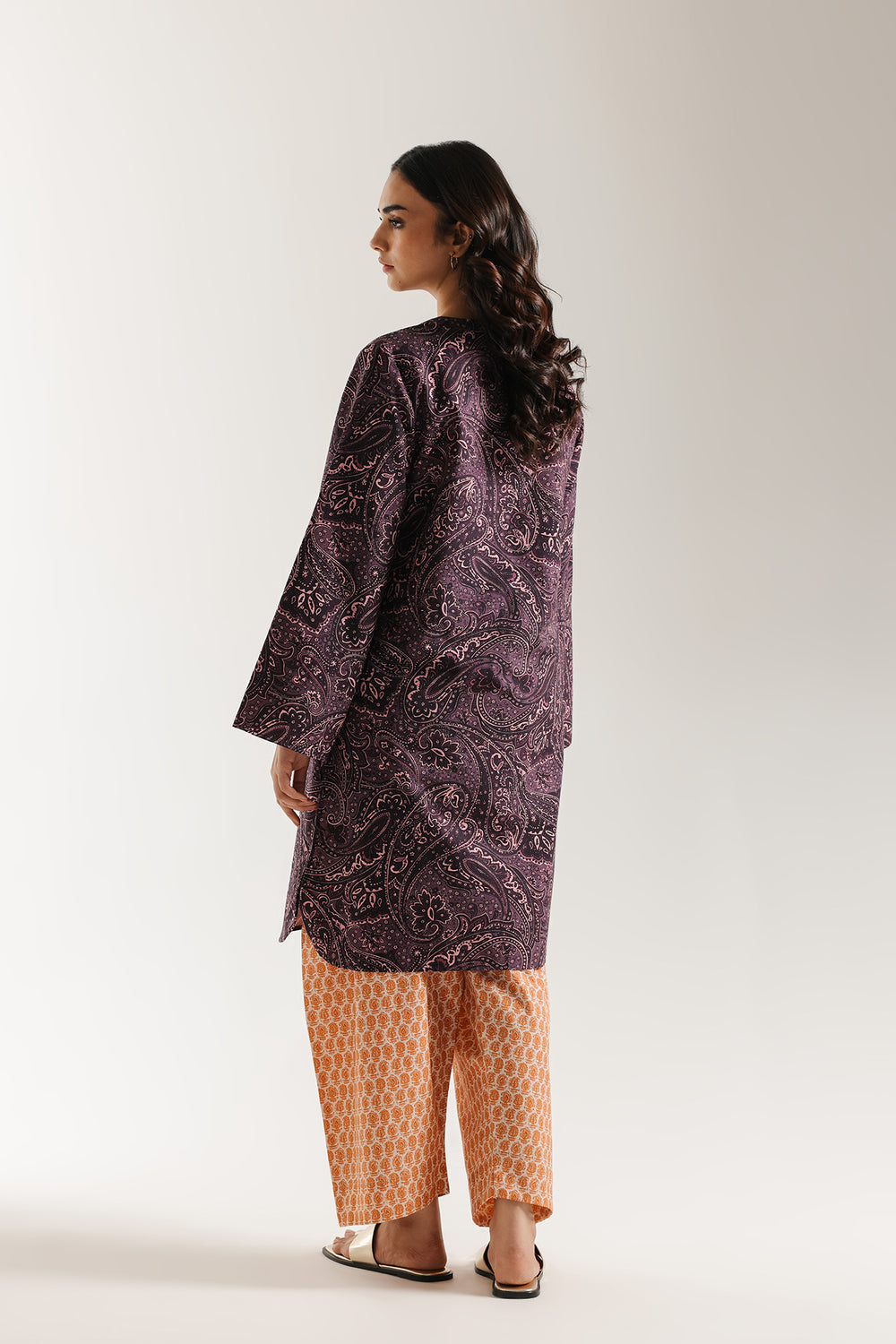 Embrace a vibrant contrast of patterns with this captivating printed suit. The A line-cut kurta is crafted in a luxurious deep purple and features an all-over, traditional paisley print in complementary shades of dark magenta and black. The kurta includes a flattering V-neckline adorned with contrasting orange buttons. This rich top is boldly paired with tailored shalwar that showcase a cheerful, all-over geometric print in bright orange and off-white, creating a unique and sophisticated statement look.