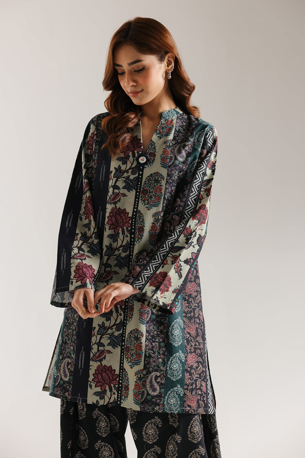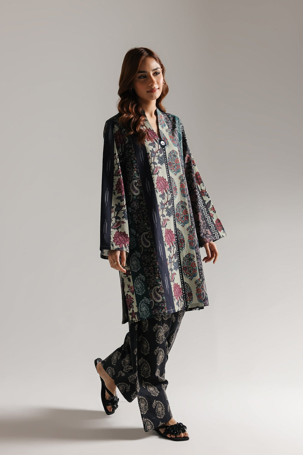 Elevate your everyday style with this printed V-neck shirt designed for comfort and elegance. The flowy fit drapes beautifully while the full sleeves provide modest coverage. Cut to knee length, it pairs perfectly with the included wide shalwar for a complete, coordinated look. Ideal for casual outings or relaxed gatherings, this suit combines traditional charm with contemporary design. The soft fabric moves with you, making it perfect for all-day wear.