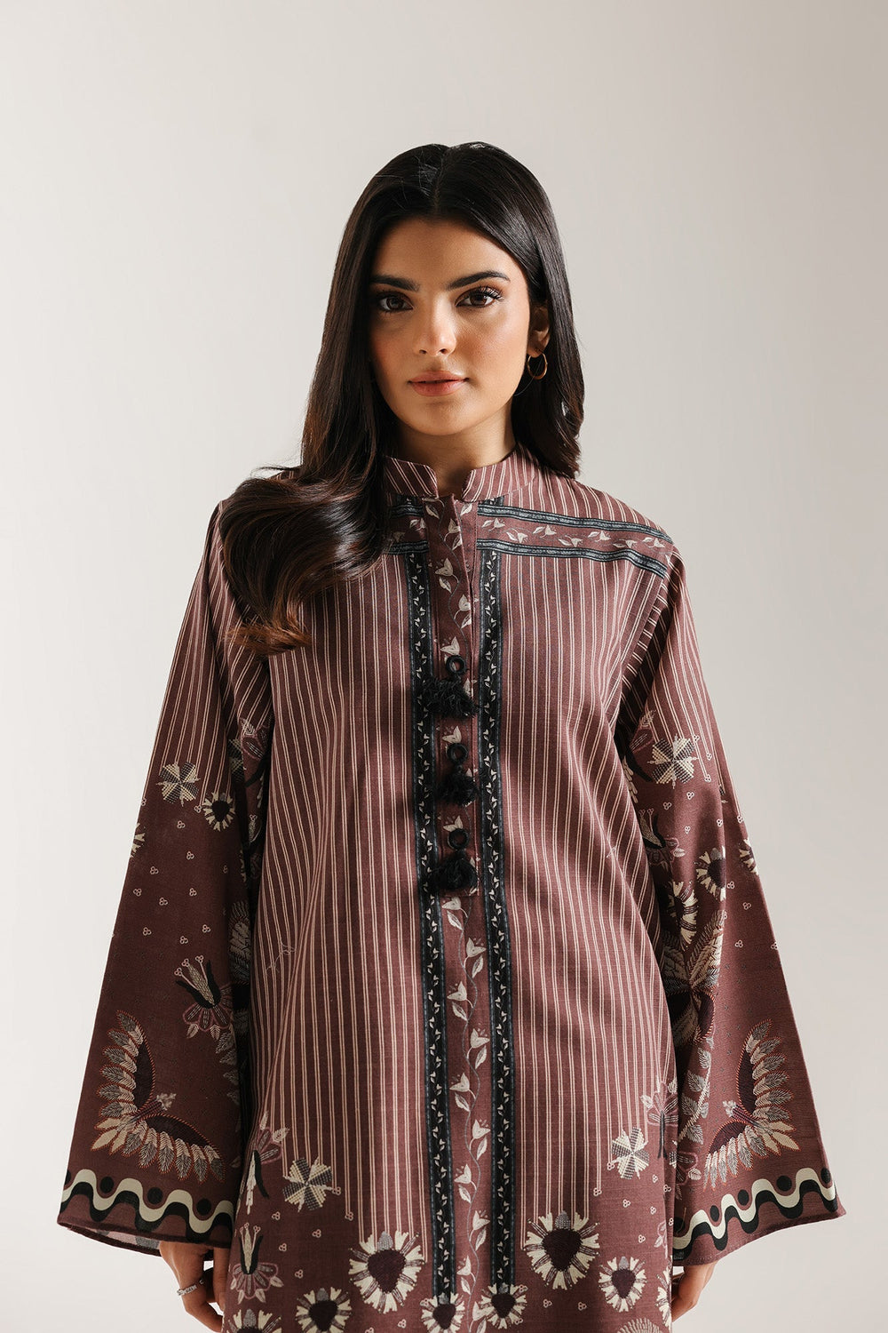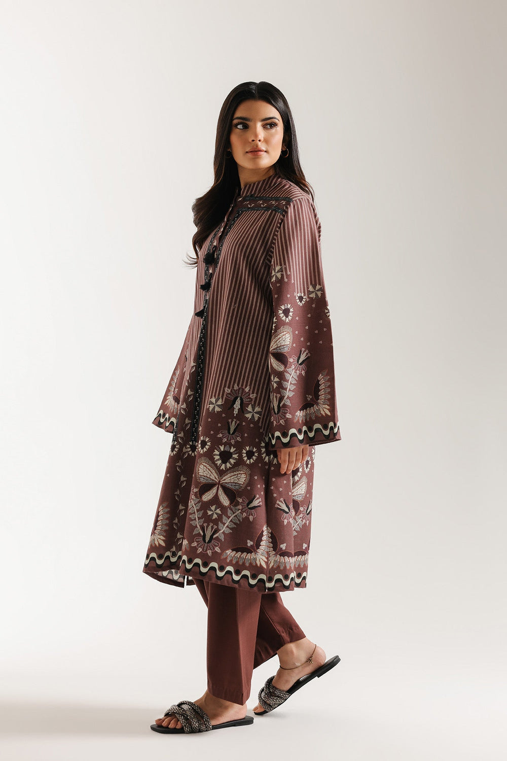 The outfit features a stylish maroon-brown printed kurta paired with matching straight trousers. The kurta has a fusion of geometric and floral motifs in subtle beige and black tones, giving it a traditional yet modern appeal. It includes pleated detailing along the front panel and neckline, adding texture and structure to the design. The sleeves are wide and relaxed, enhancing the comfortable silhouette.