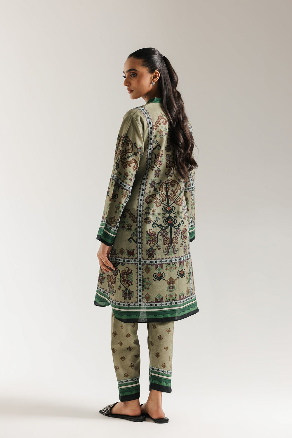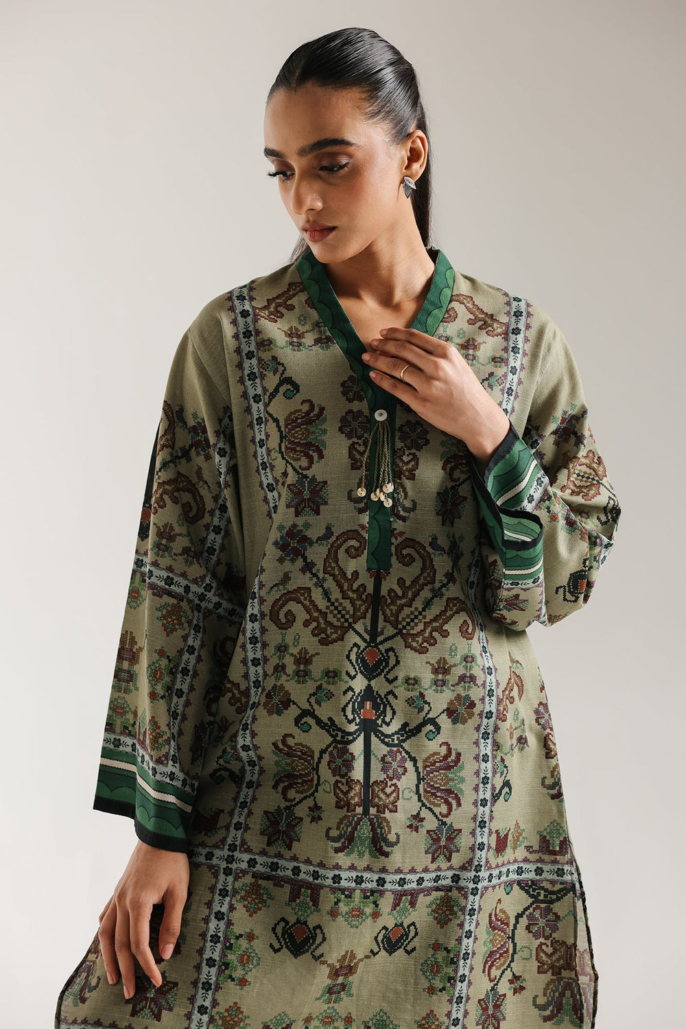 Capture rich, earthy style with this captivating grass green printed suit. The straight-cut kurti is adorned with an elaborate all-over print featuring stylized paisleys and borders in complementary shades of green, rust, and black. The V-neckline is accented with a delicate tassel detail, and the wide sleeves finish with a contrasting dark green border. Completing the ensemble is coordinating shalwar featuring a subtle geometric pattern, offering a perfectly coordinated and stylish look for everyday elegance.