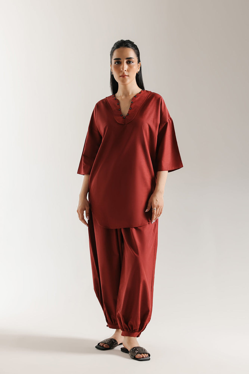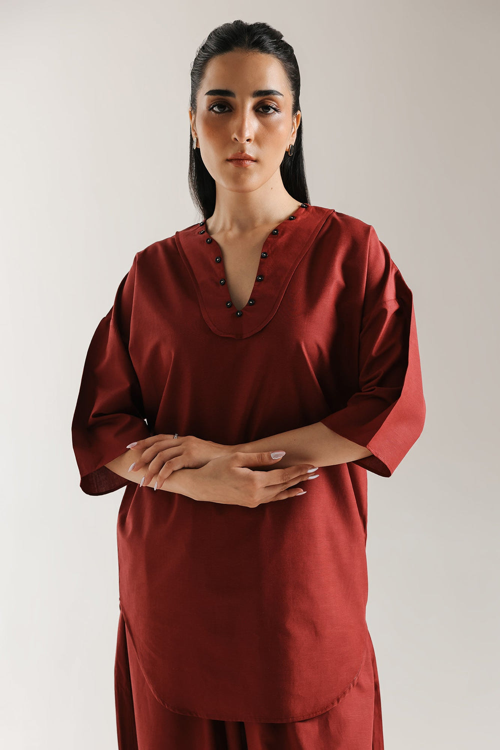 Make a bold and comfortable statement in this rich red solid suit. This matching two-piece ensemble is crafted from a smooth fabric in a striking, deep brick red hue. The short kurta has a clean, relaxed fit with half-sleeves and an elegant V-slit neckline, accented by subtle button details. The suit is completed by coordinating shalwar in the same hue, offering a comfortable, stylish, and contemporary traditional silhouette.